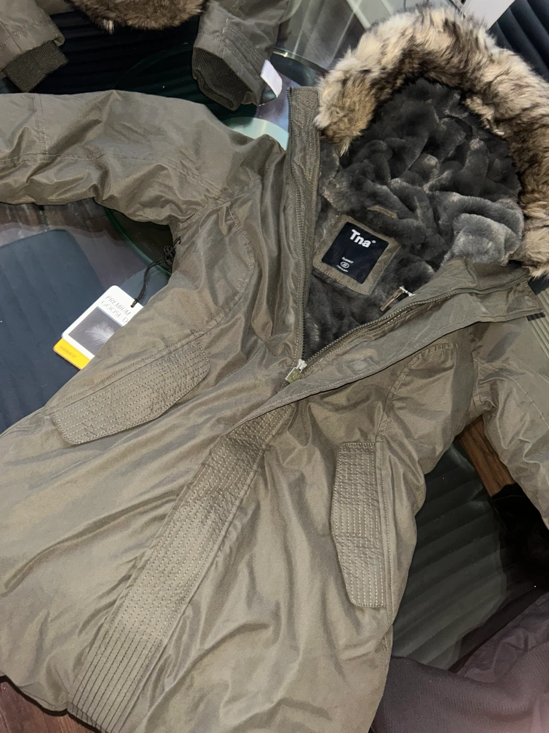 Selling a Tna The Super Puff parka in a beautiful olive color! It's in great condition and perfect for staying warm this winter. This goose-down parka is both stylish and functional, keeping you cozy in cold weather. I have more jackets in the same size as well. Cash & Pick up ONLY