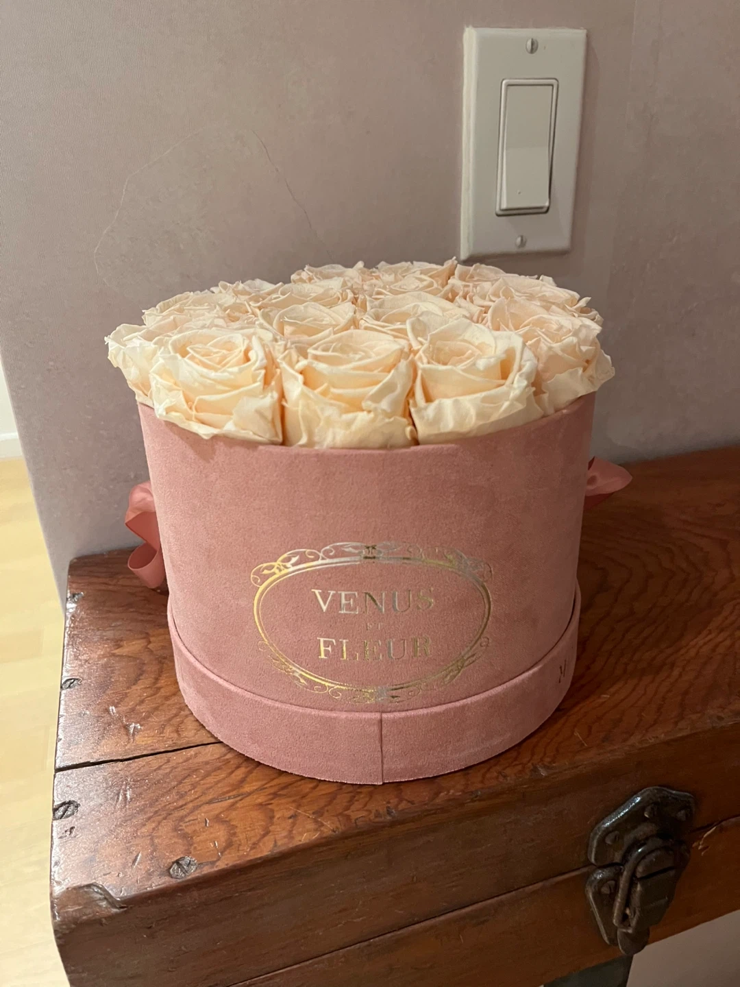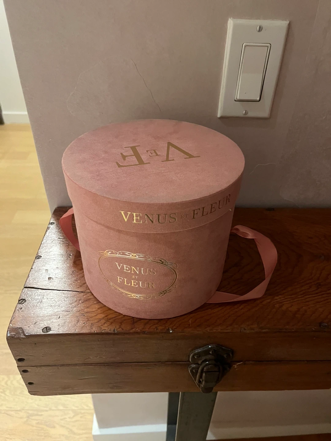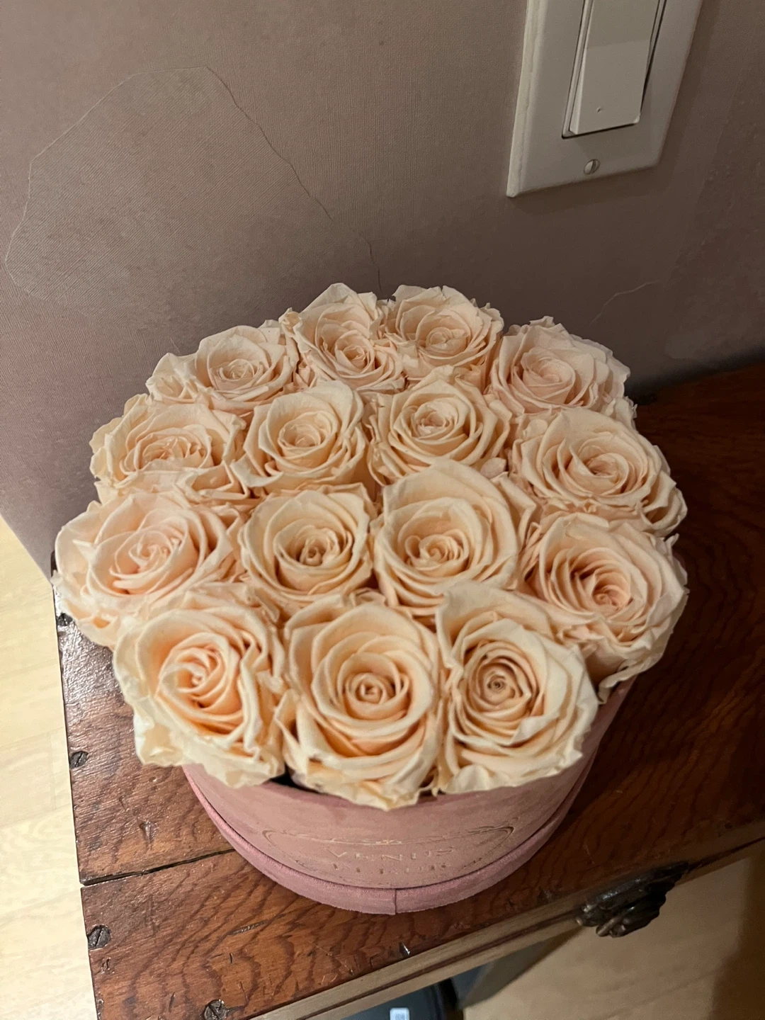 Selling a beautiful rose arrangement from Venus et Fleur! It's a lovely piece that adds a touch of elegance to any space. The roses are arranged in a signature round box, making it a perfect decorative item for your home or as a thoughtful gift.
