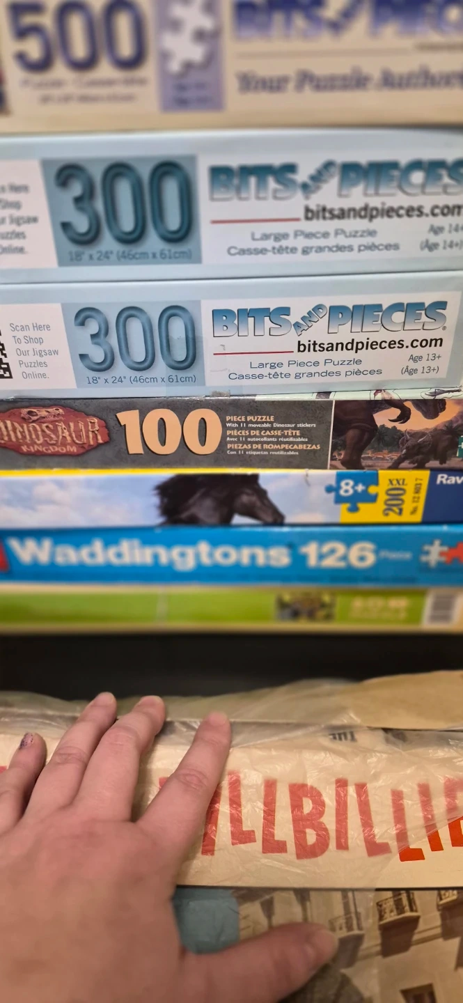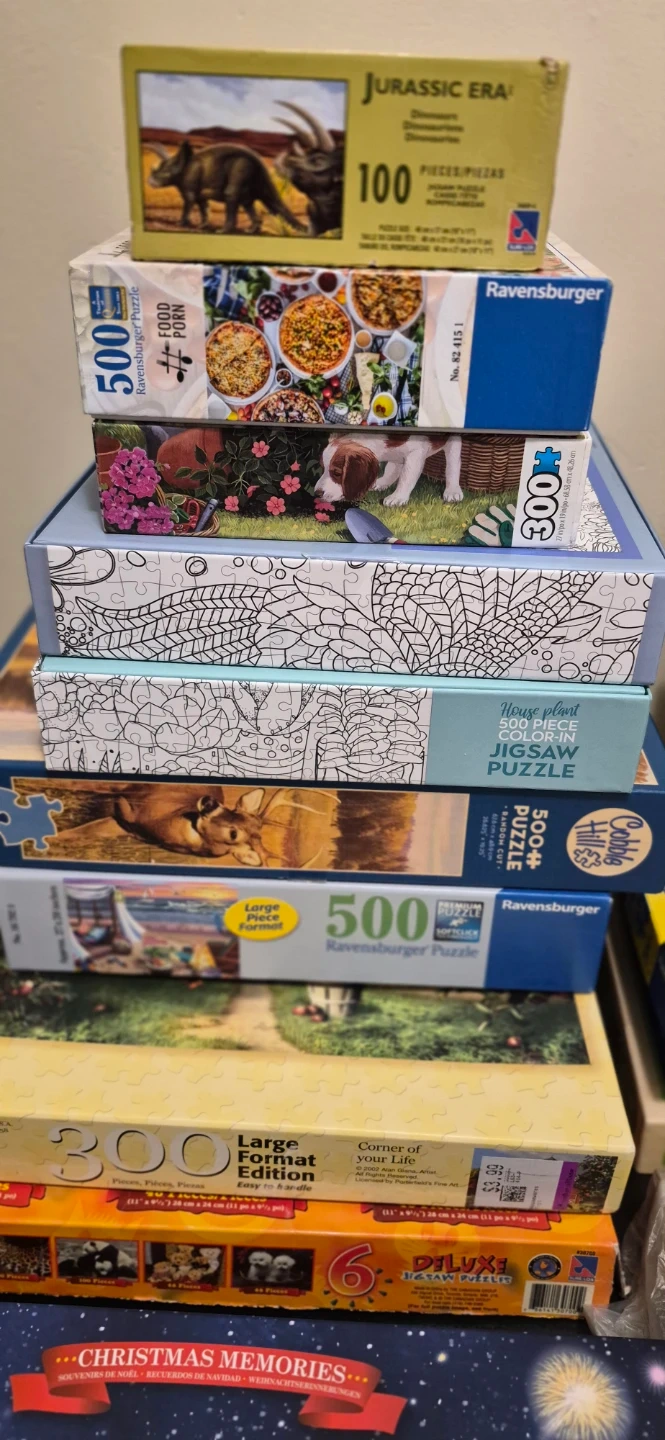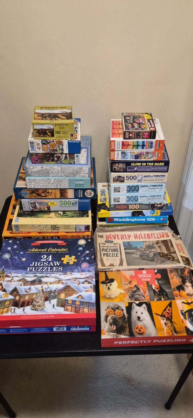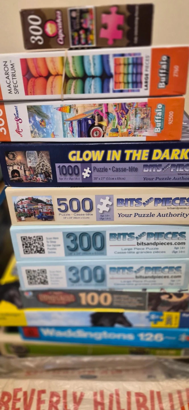 Selling a collection of puzzles! There are various piece counts, including 100, 300, 500, and 1000 piece puzzles from brands like Bits and Pieces and Ravensburger. Perfect for puzzle enthusiasts of all ages.