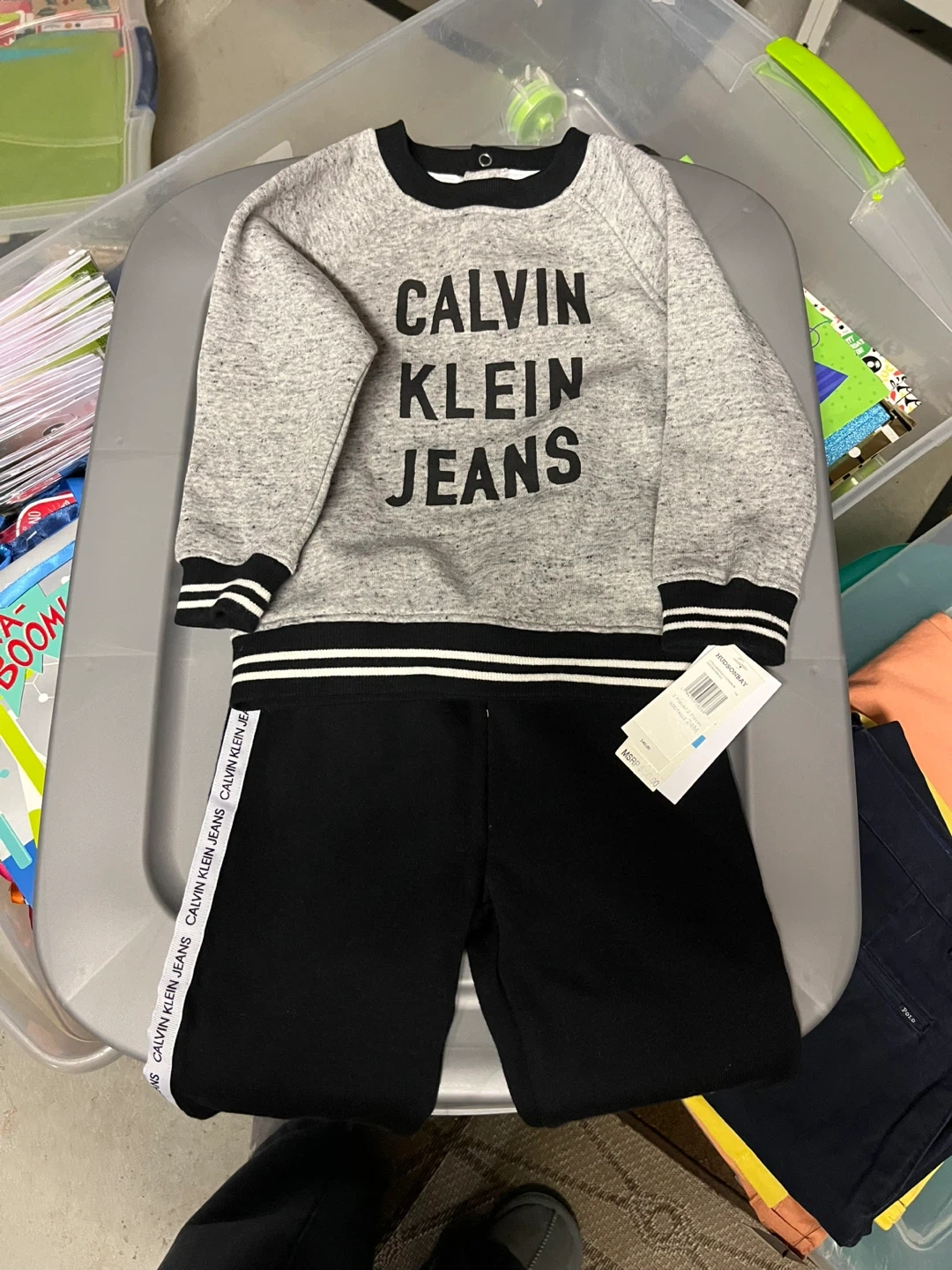 I'm selling a brand new Calvin Klein Jeans two-piece set! It's size 24M and includes a long sleeve sweatshirt and pants. The pants have the Calvin Klein Jeans logo down the side. The original price on the tag is $50!