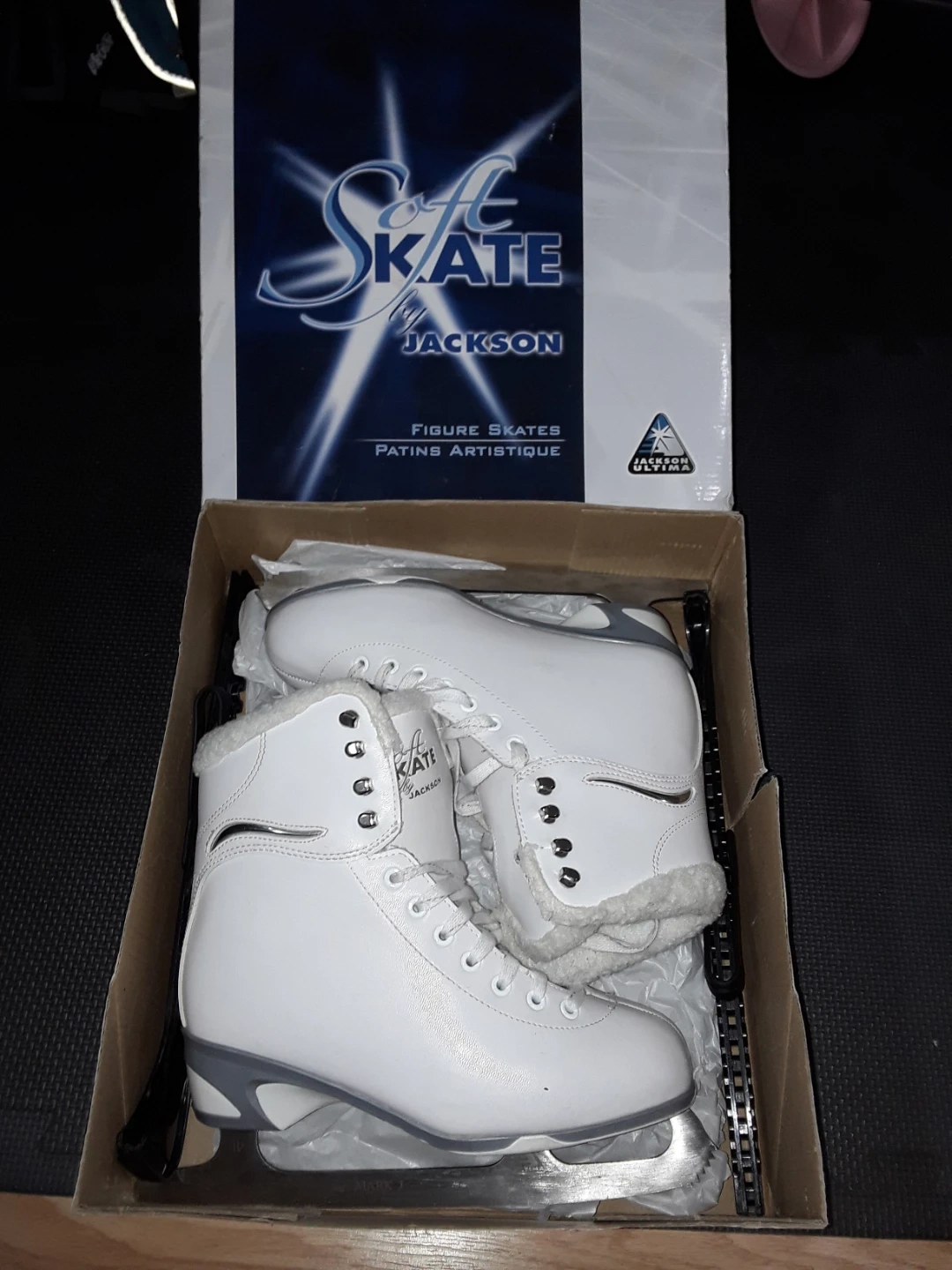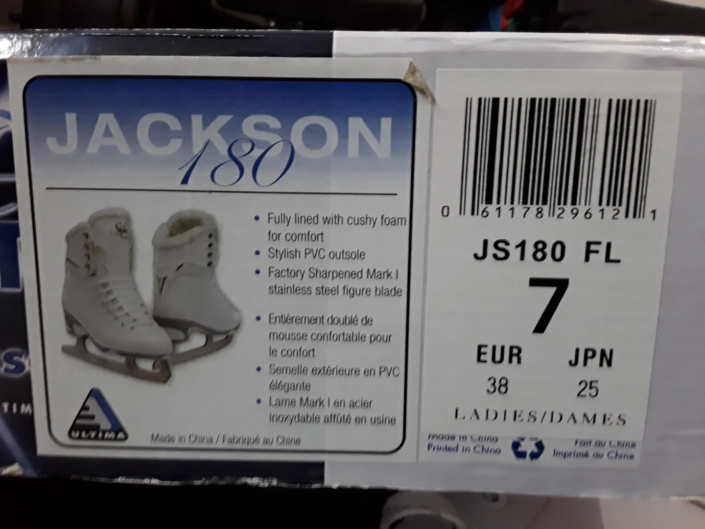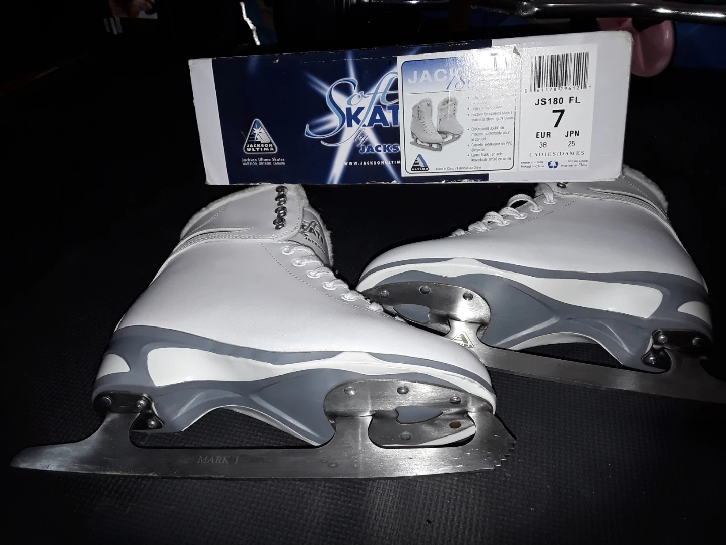 Selling a pair of Jackson JS180 FL ladies figure skates in size 7. They are fully lined with cushy foam for comfort and have a stylish PVC outsole. The blades are factory sharpened Mark I stainless steel figure blades. Comes with the original box & blade protectors.