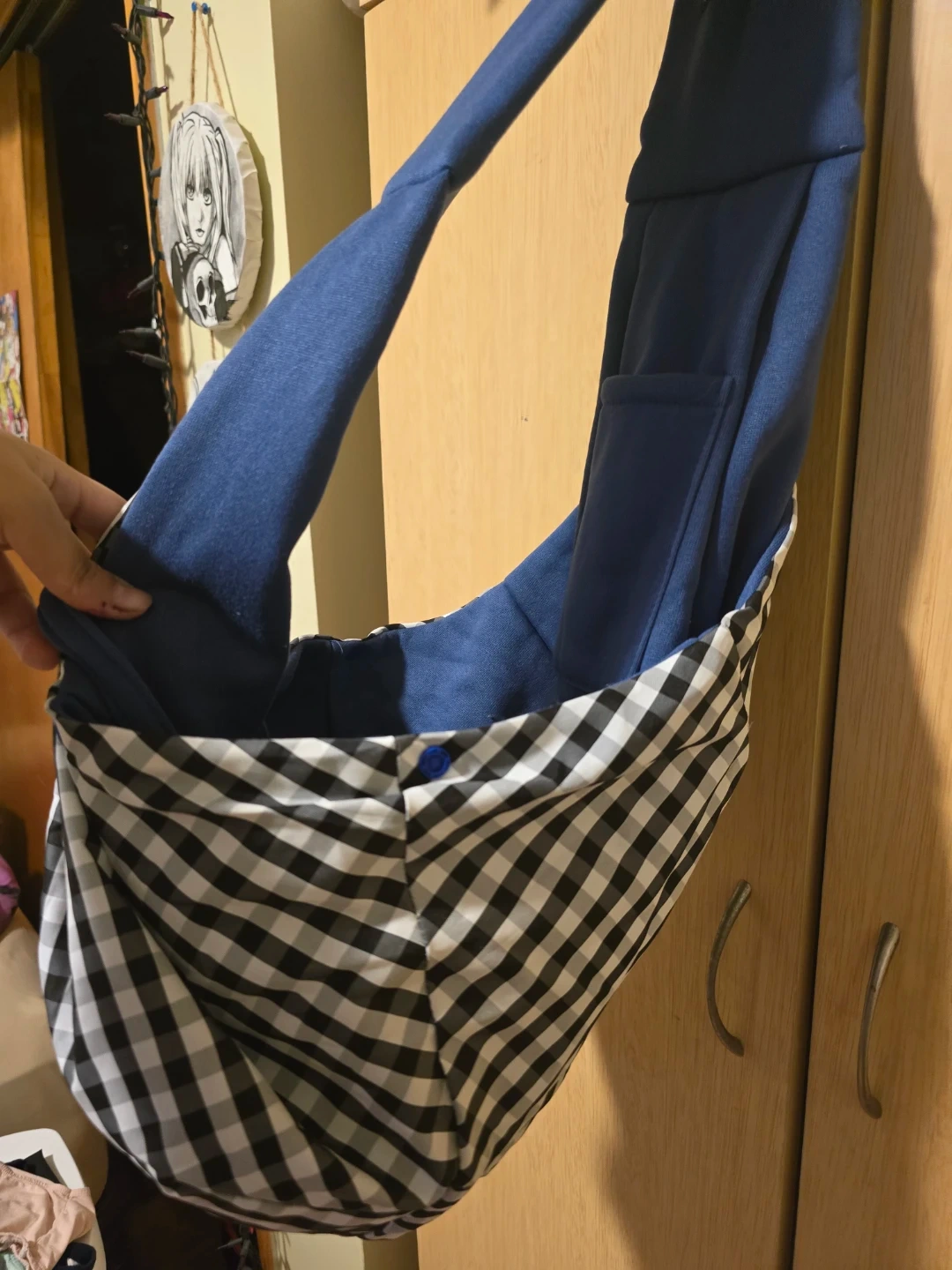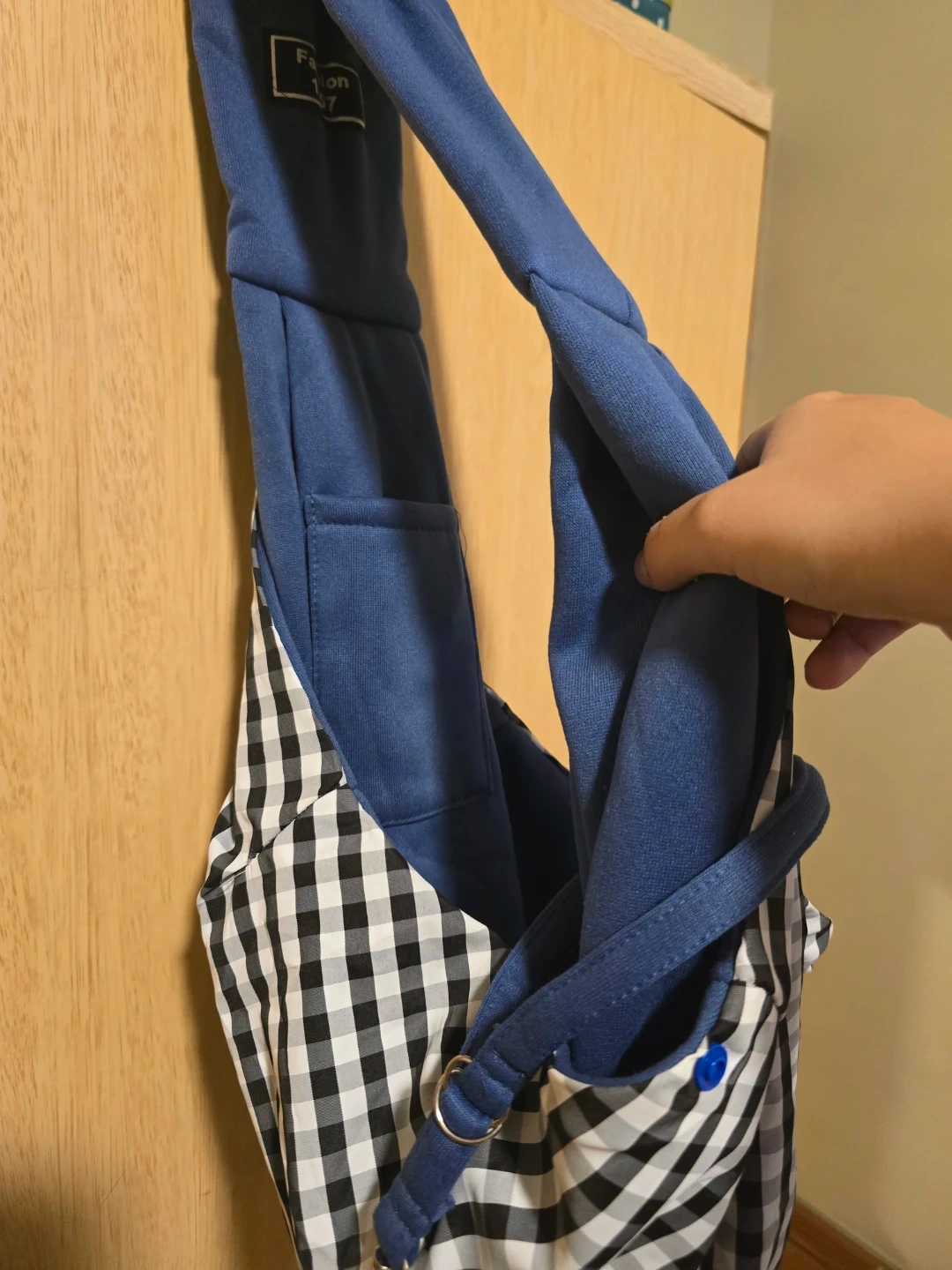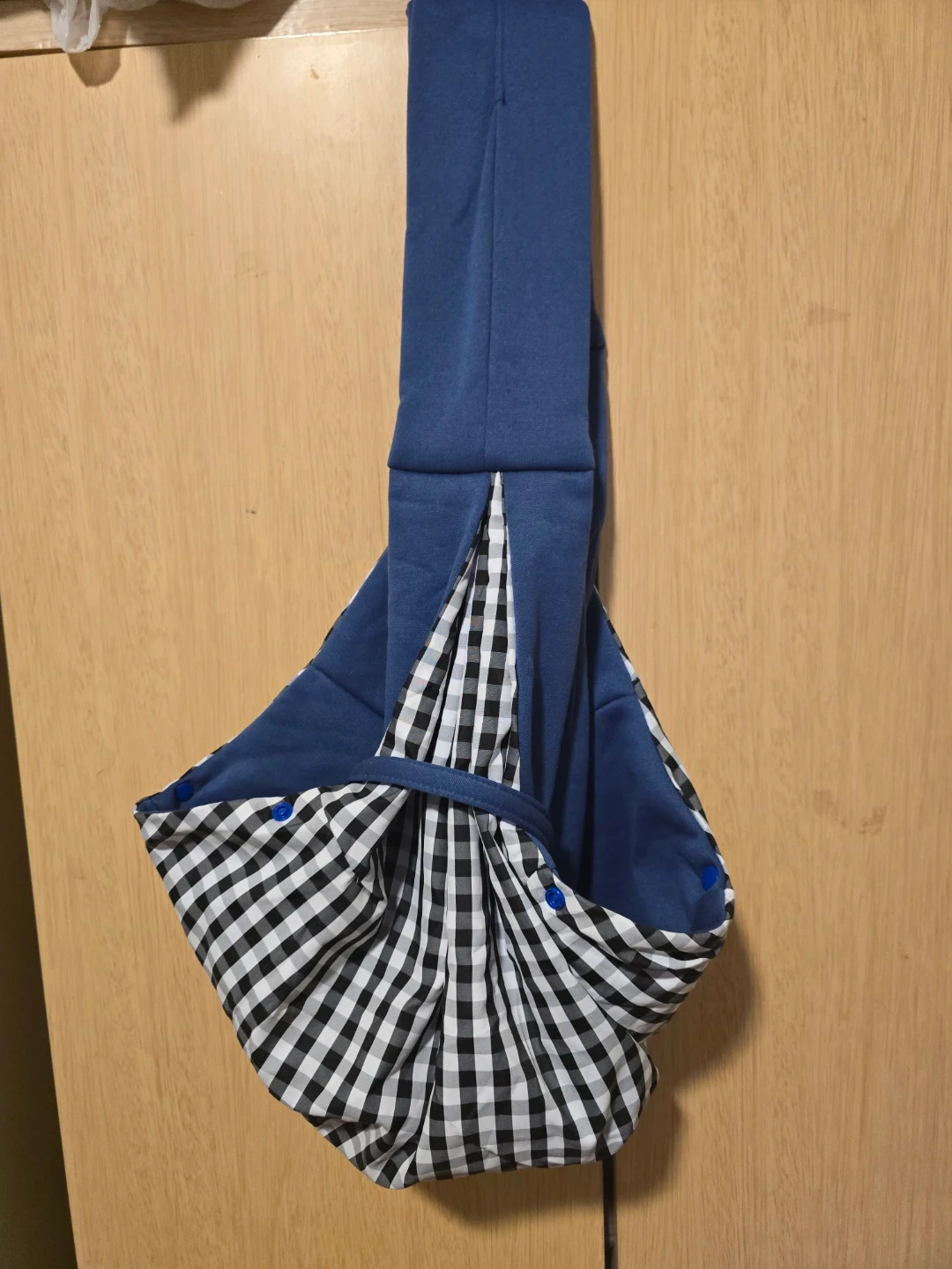 It features a comfortable blue fabric with a stylish black and white checkered pattern inside. It appears to be in good condition, has nottle carrier and clip for collars
