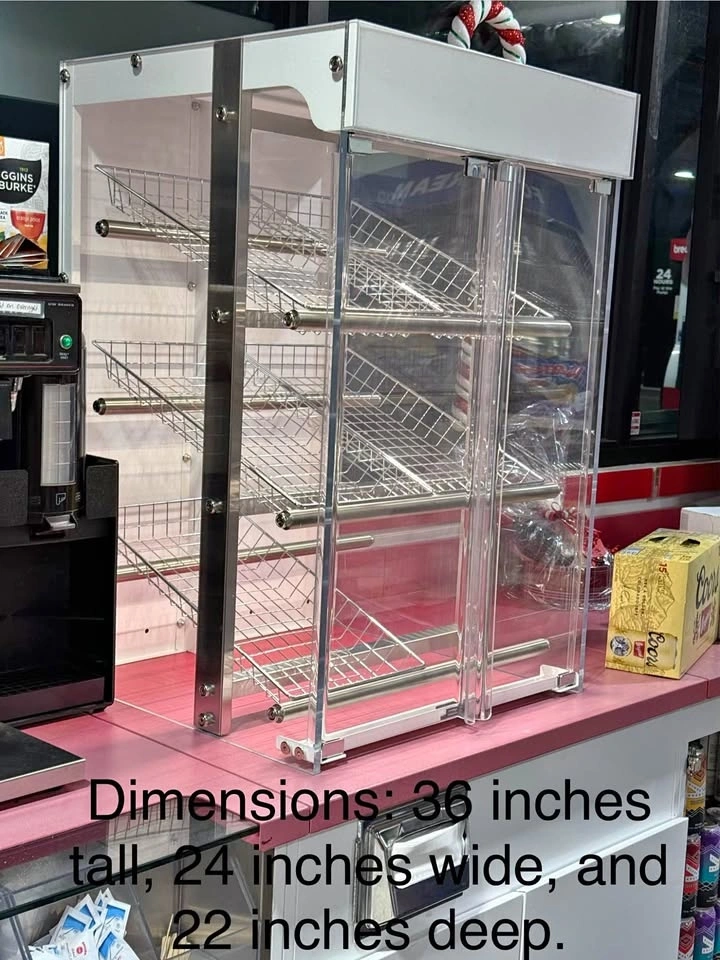 It features clear acrylic doors, stainless-steel frame, and angled wire shelves that make it perfect for showcasing pastries, samosas, muffins, cookies, patties, snacks, donuts, and more.