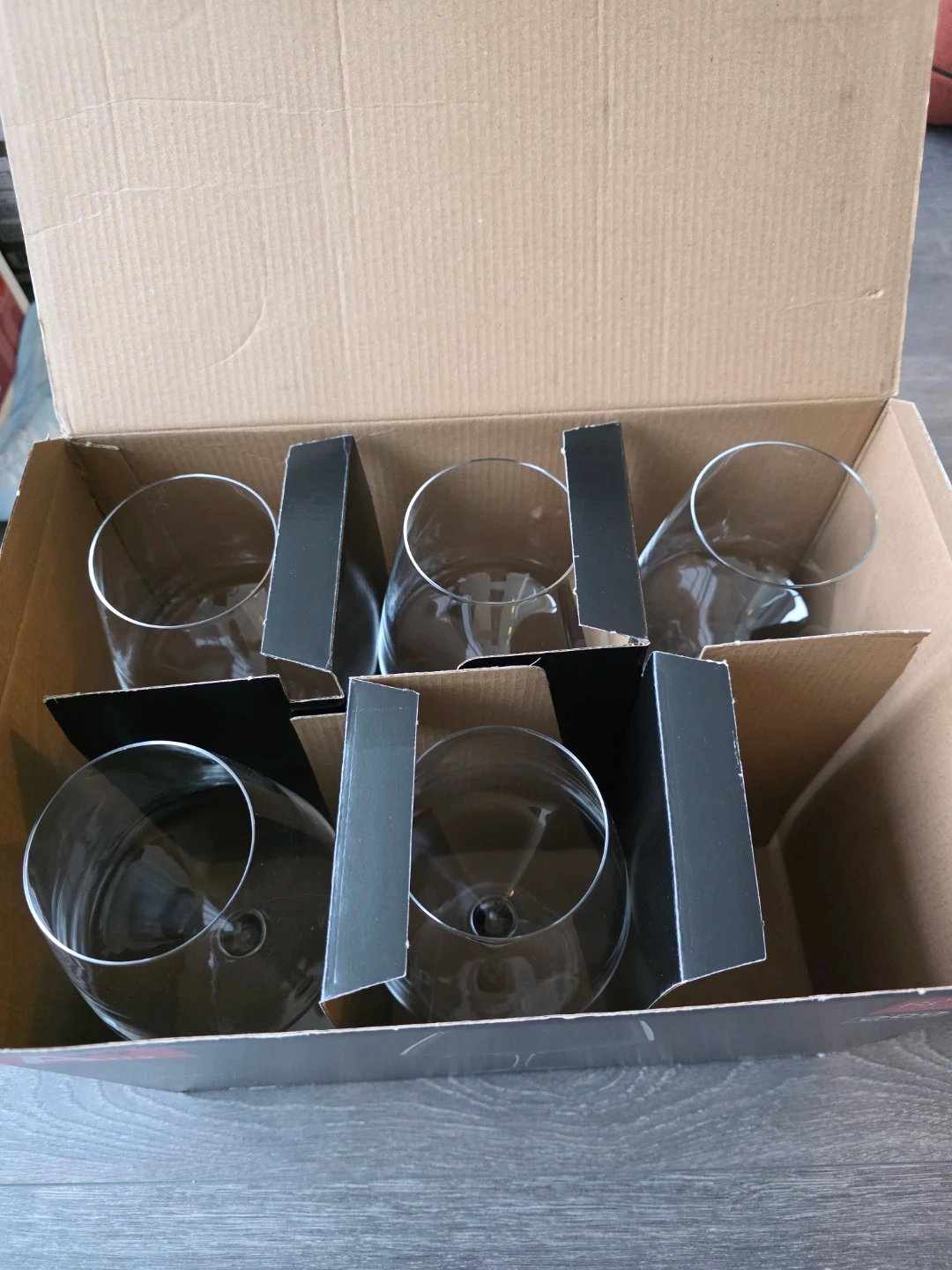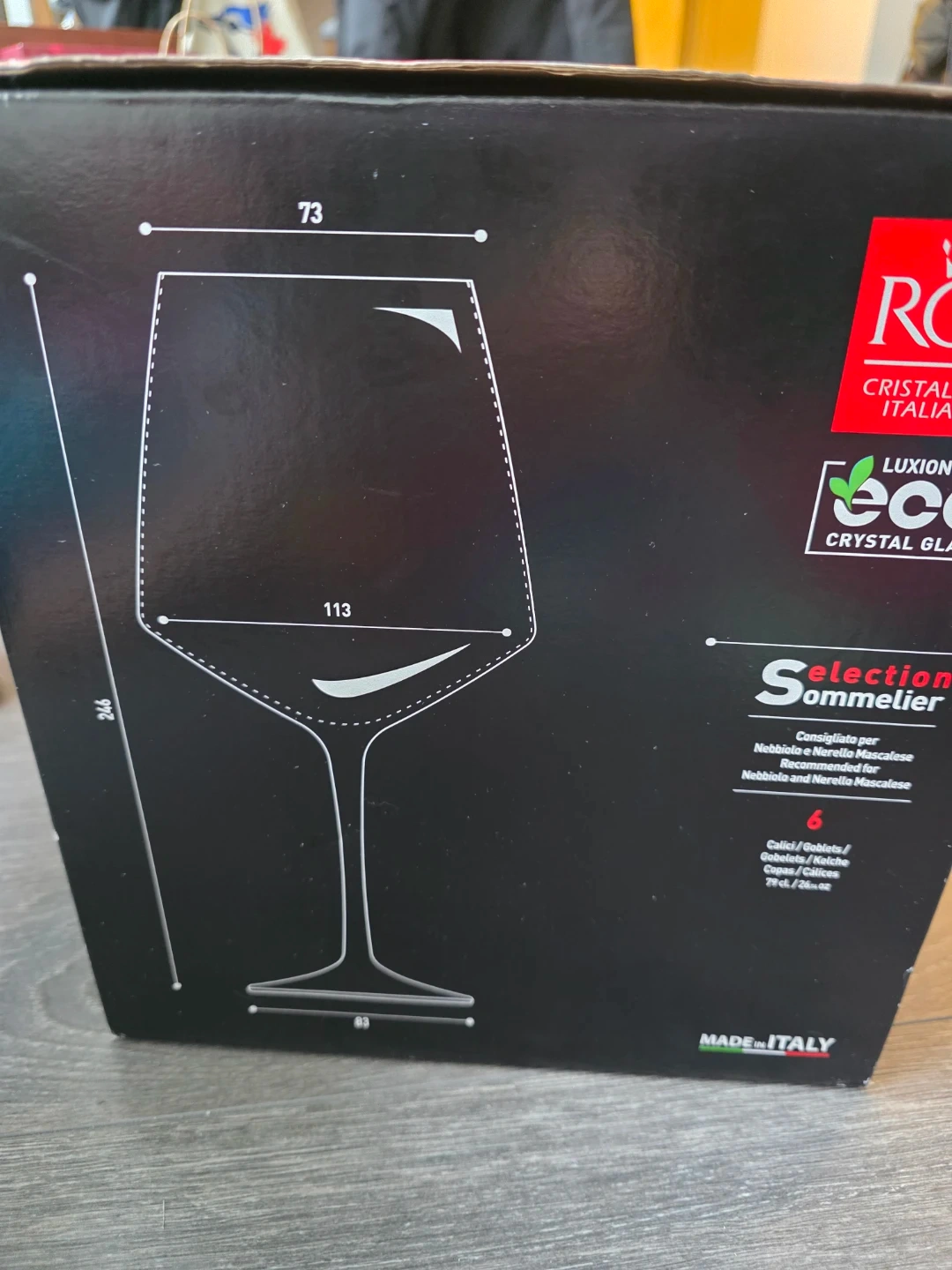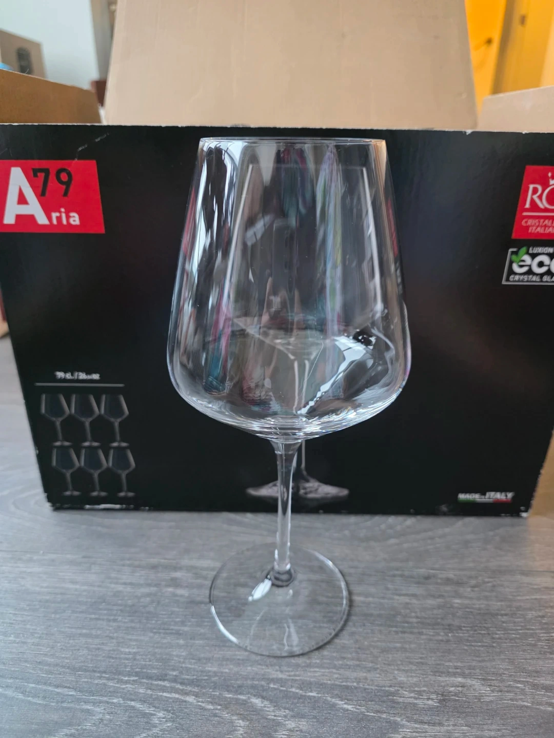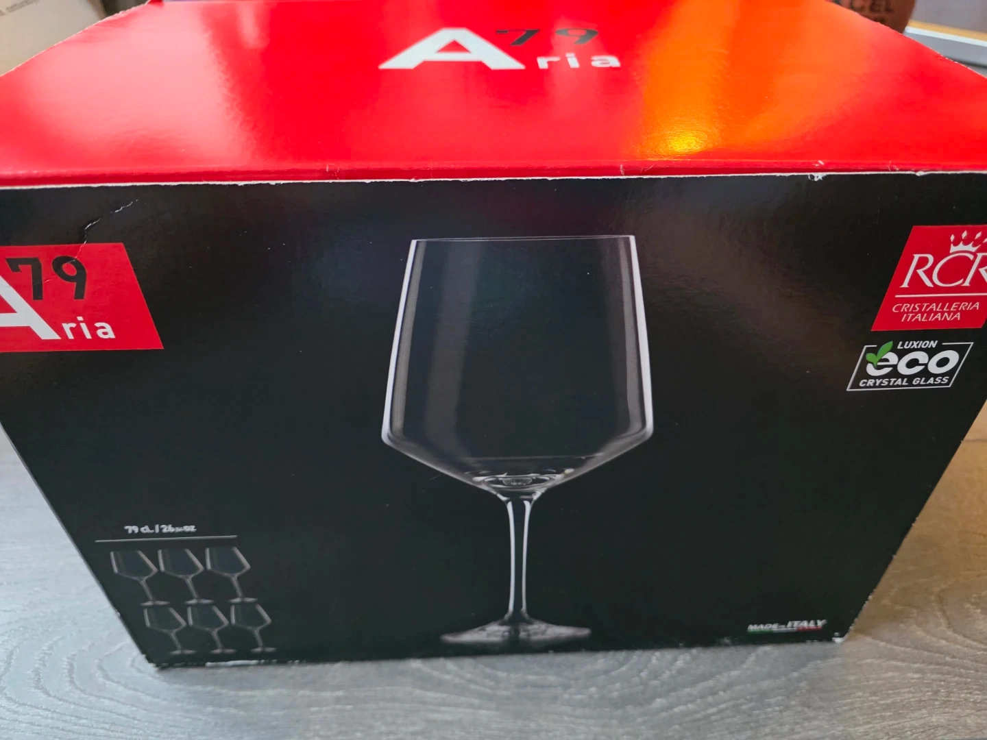 Selling a set of 6 RCR Cristalleria Italiana Aria wine glasses. These glasses are made in Italy from Luxion Eco Crystal Glass. They are in excellent condition and come in the original box. The glasses are 79 cl / 26.6 oz in size. Perfect for your next dinner party!