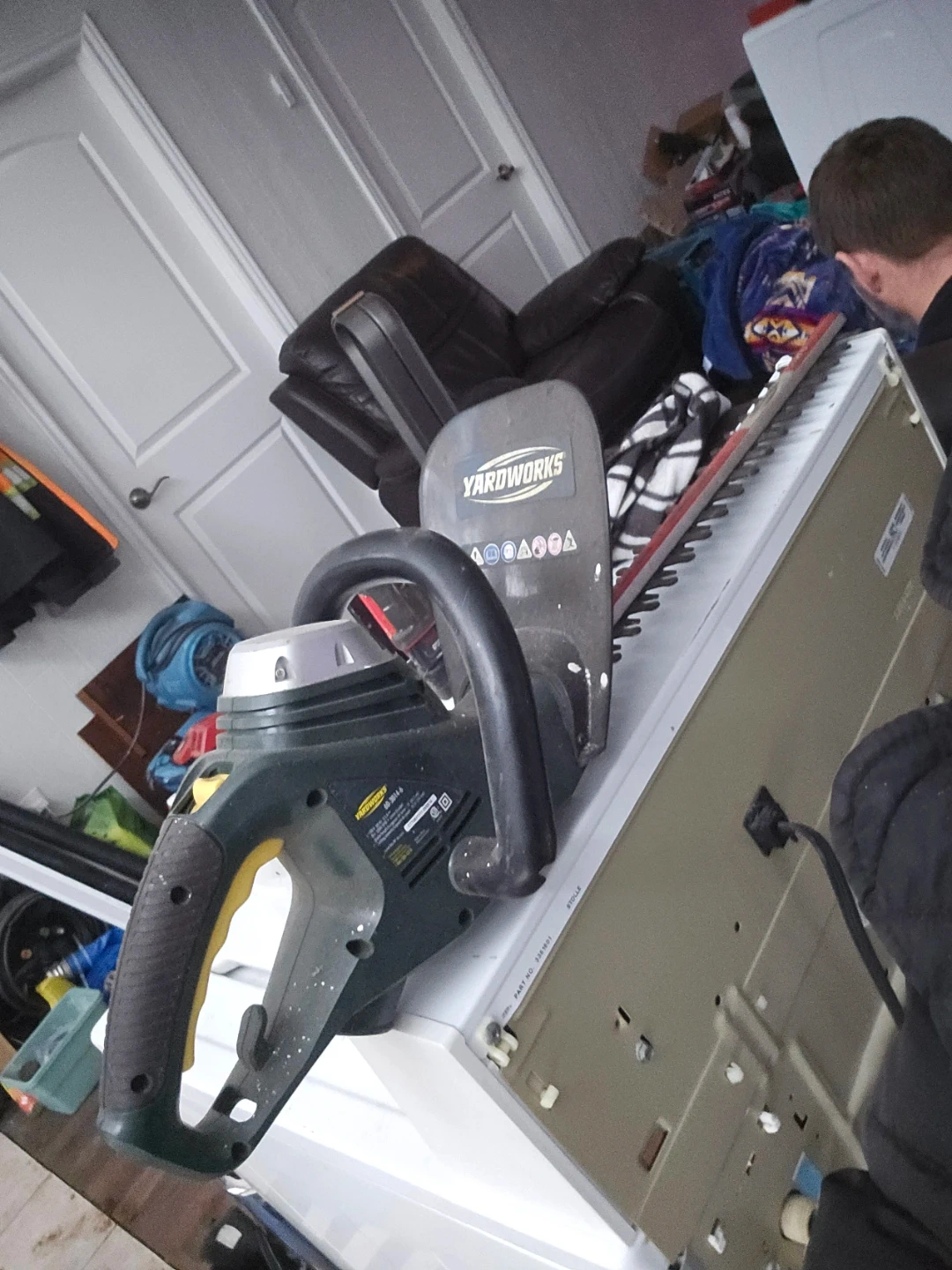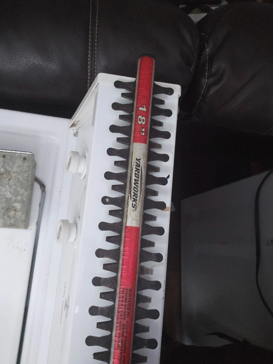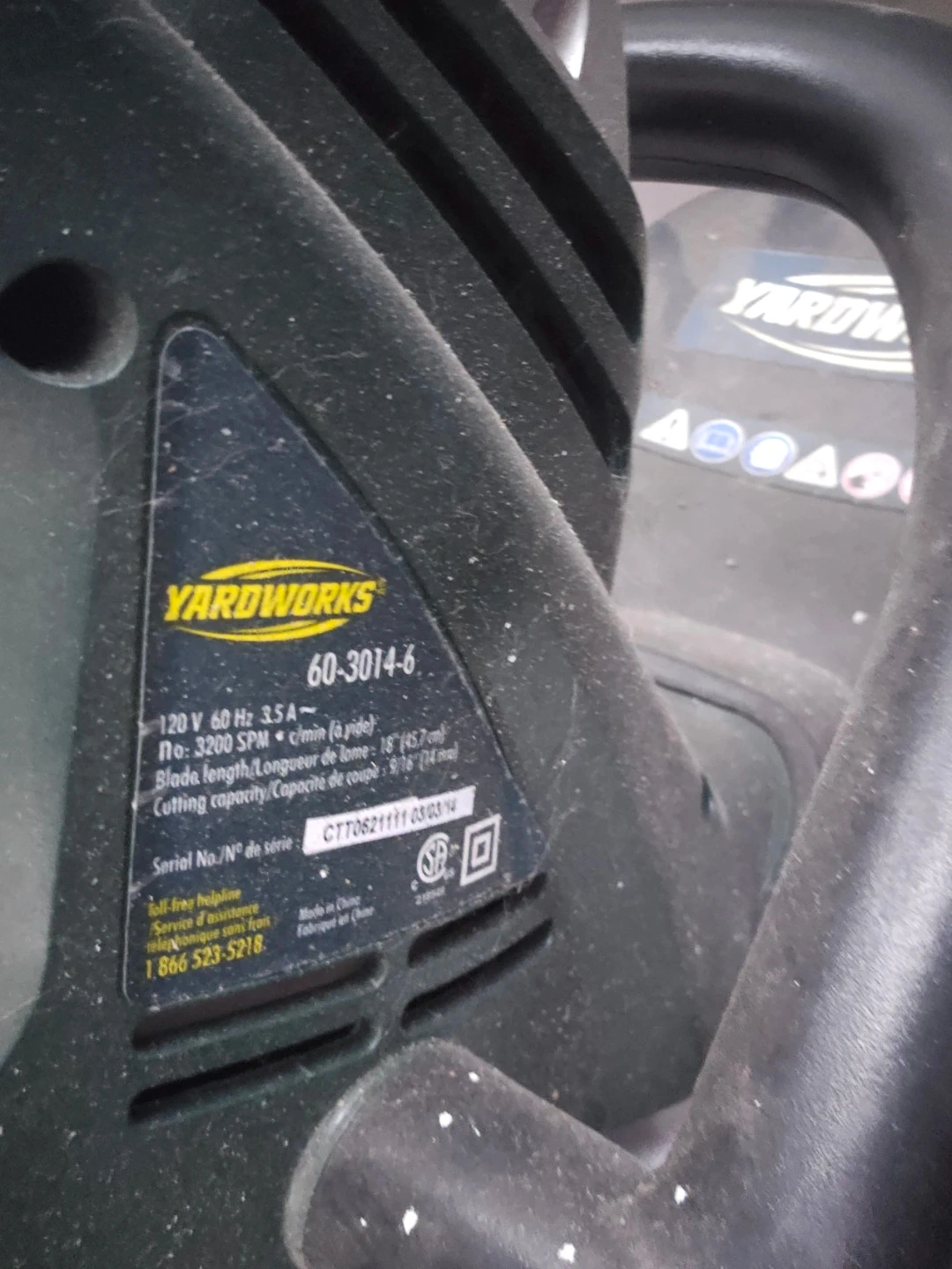 Selling a Yardworks electric hedge trimmer in good condition. It has an 18-inch blade length and operates at 3200 SPM. Model number is 60-3014-6.