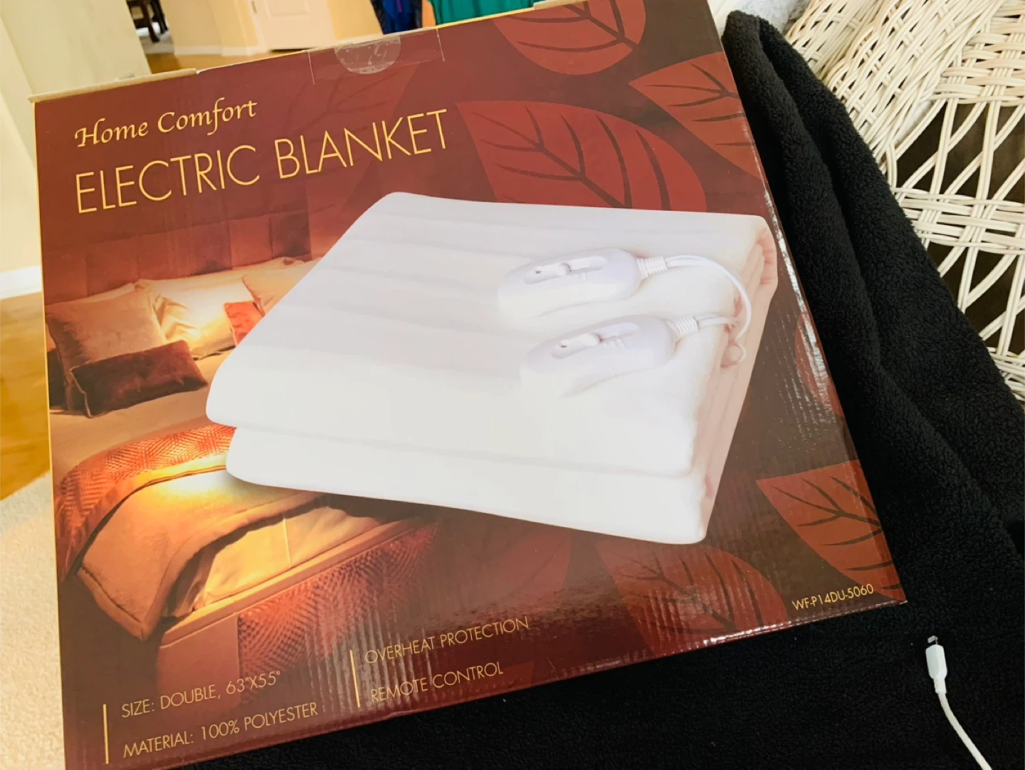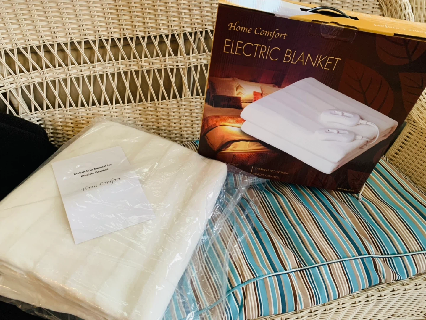 Selling a Home Comfort Electric Blanket , Size Double (63"x55"). It's made of 100% polyester and comes with overheat protection and a remote control. The original box and instruction manual are included