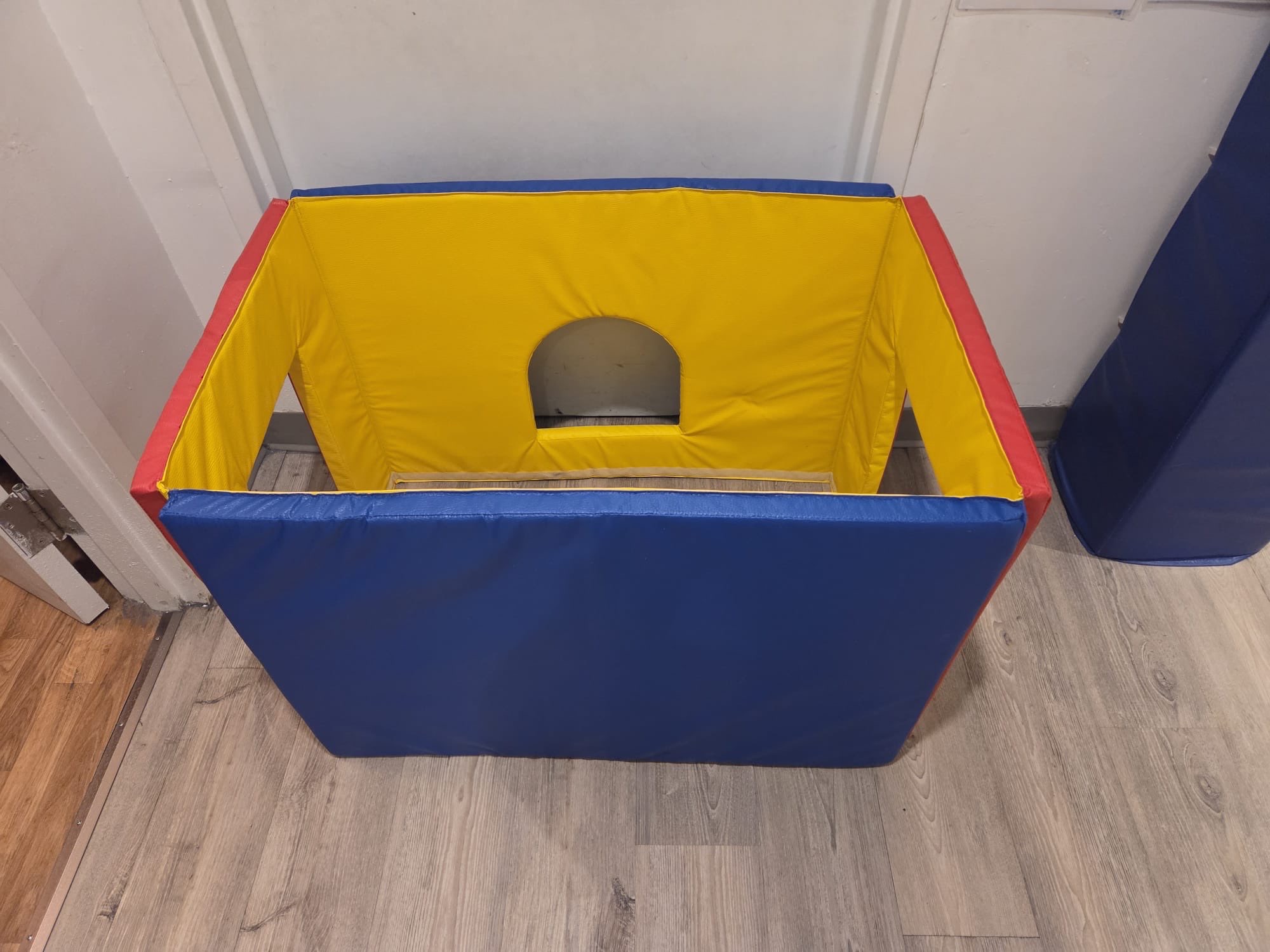 Colourful soft play sensory house designed for toddlers and young children. Made with padded foam panels and wipeable vinyl covering for safe, comfortable play.