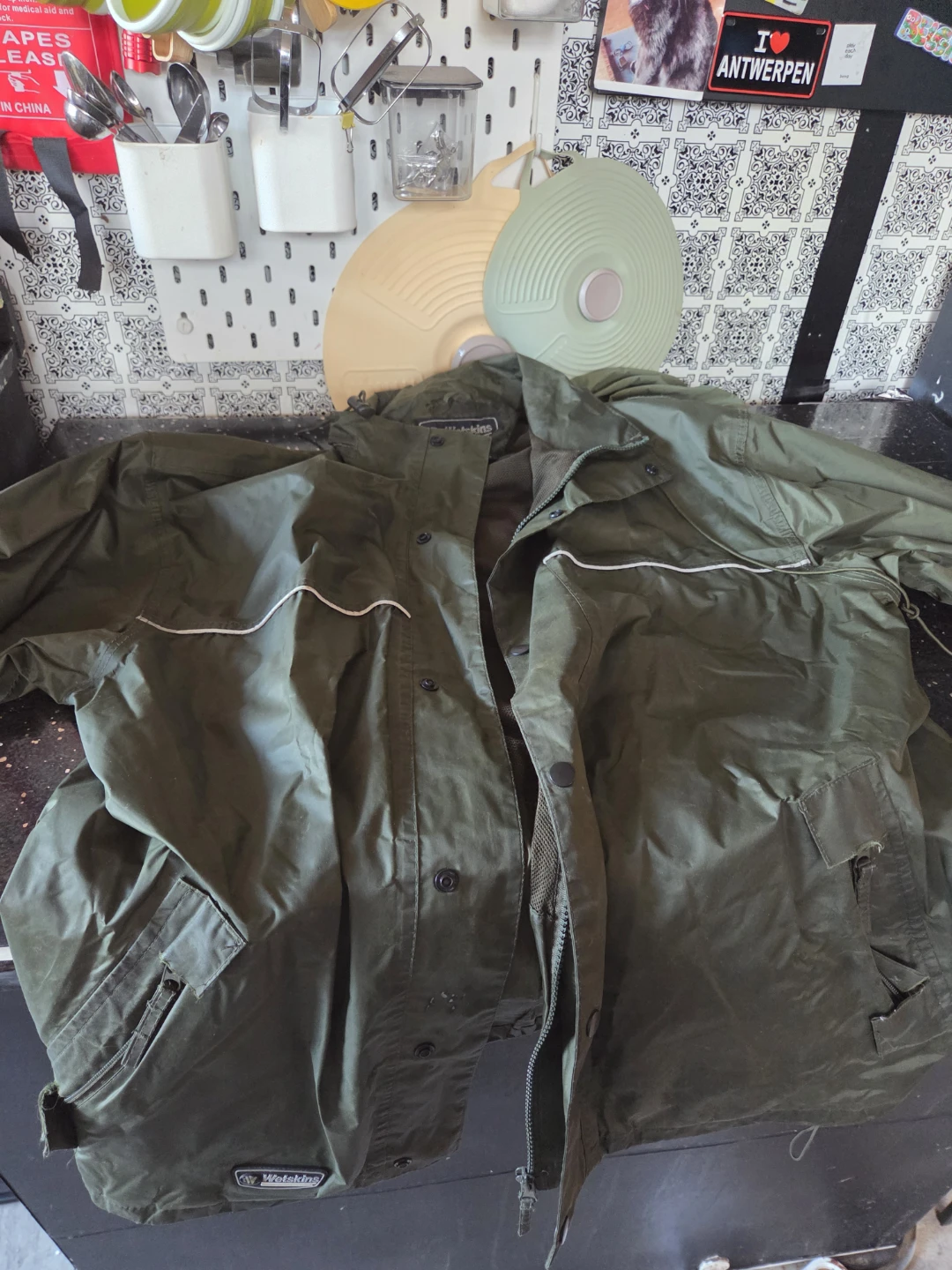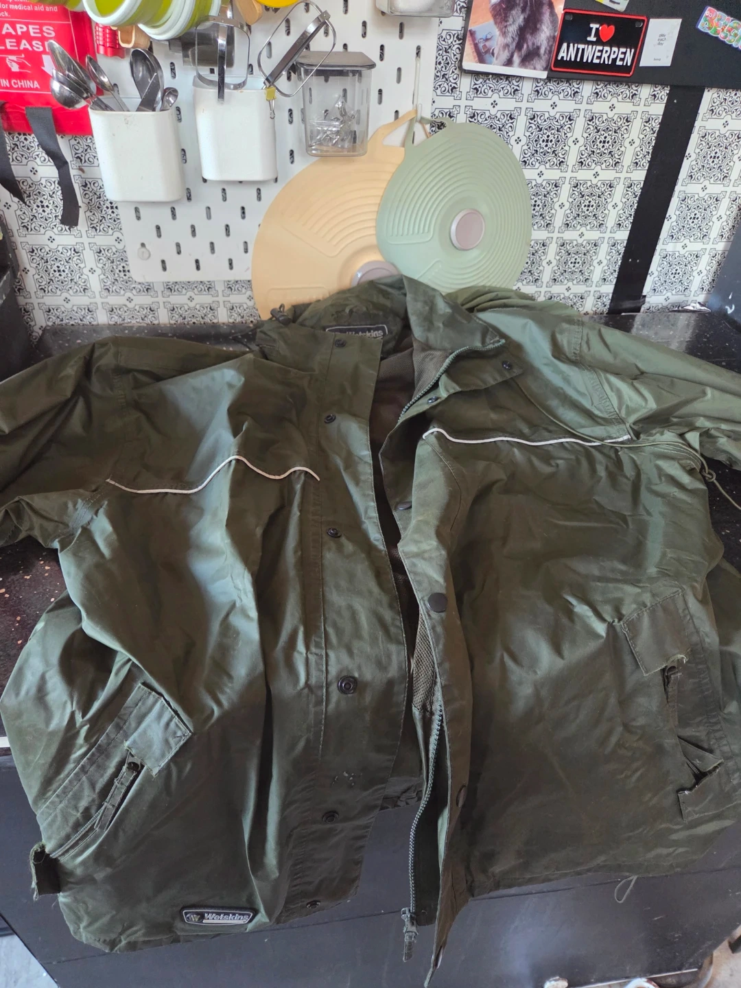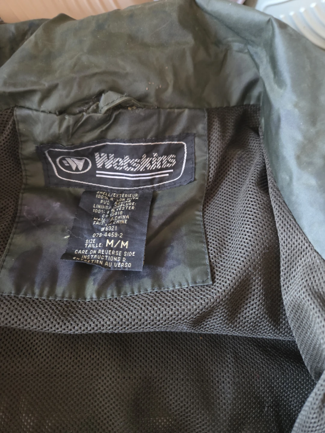 Selling a Wetskins rain jacket in olive green, size M. The shell is 100% nylon, and the lining is 100% polyester. Perfect for those rainy days!