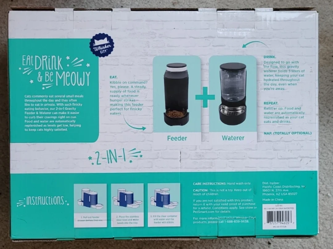 Selling an unopened Whisker City "The Purrfect Combo" 2-in-1 Gravity Feeder & Waterer! This BPA-free feeder has removable stainless steel bowls and a storage capacity of 2.86 lbs (1.3 kg) for food and 101.4 fl oz (3L) for water. It's designed to help your furry friend eat and drink comfortably and automatically replenish food and water as needed. Paid $60.