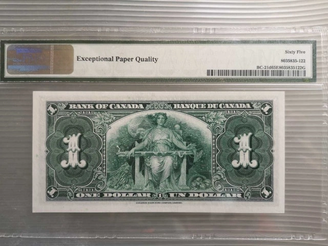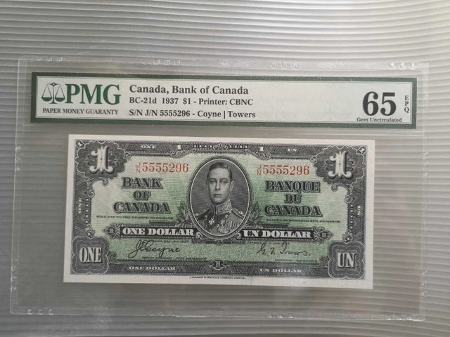 I'm offering a Bank of Canada one dollar bill from 1937, a piece of Canadian history in your hands. This banknote, graded PMG 65, features the iconic image of King George VI. It's a gem uncirculated note, serial number J/N 5555296. It was printed by CBNC and signed by Coyne/Towers.