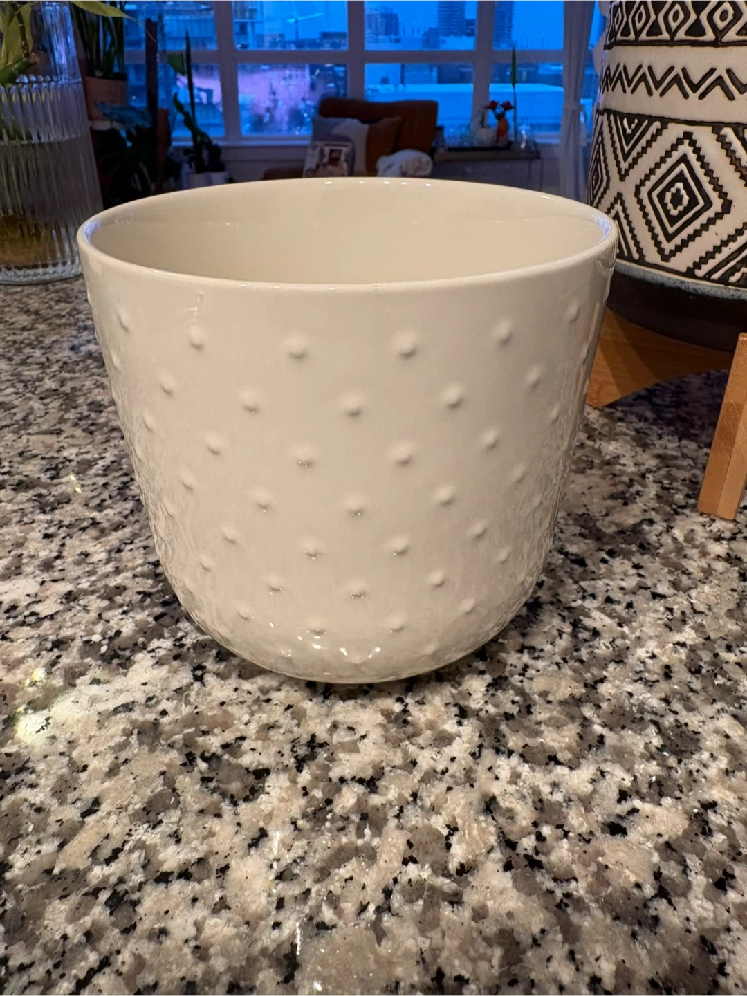 Selling a few decorative plant pots. There's a white pot with raised dots (5x5.5β), a white taller pot with raised floral pattern (5.5x5β), a brown pot with a white base (2.5x3β), and a patterned pot on a wooden stand (5x7β). There is a small chip on the flower pot but itβs very small and not noticeable. Would prefer to sell altogether so priority will be given there.