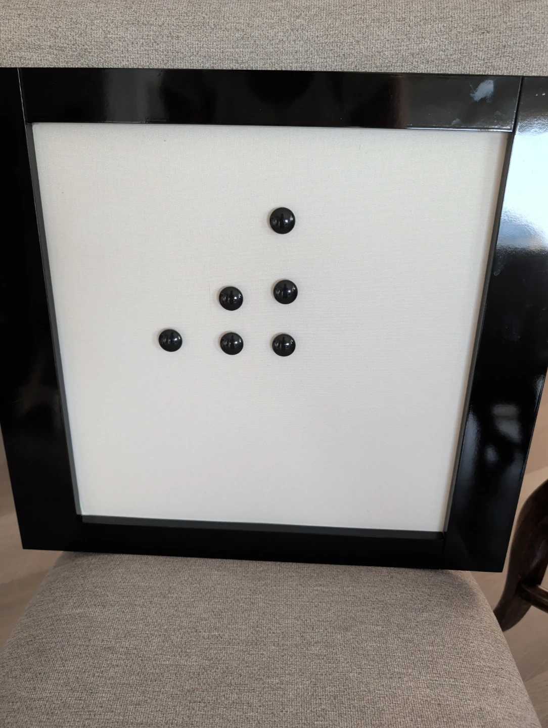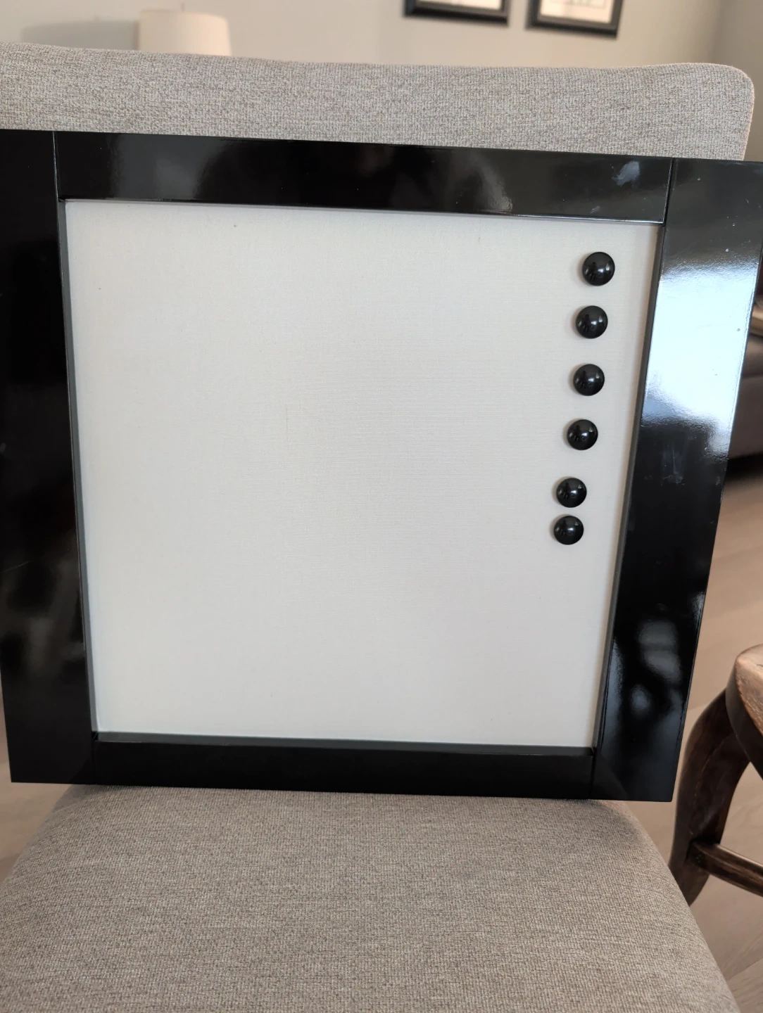 Selling a Framed Black & White magnetic board with 6 black circular magnets. It's in good condition and ready to add a modern touch to your space