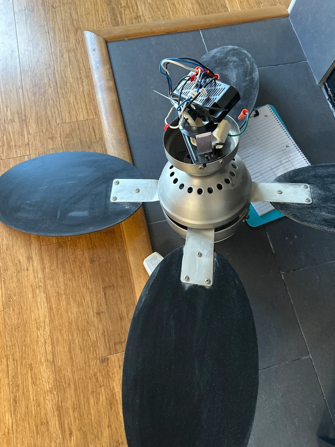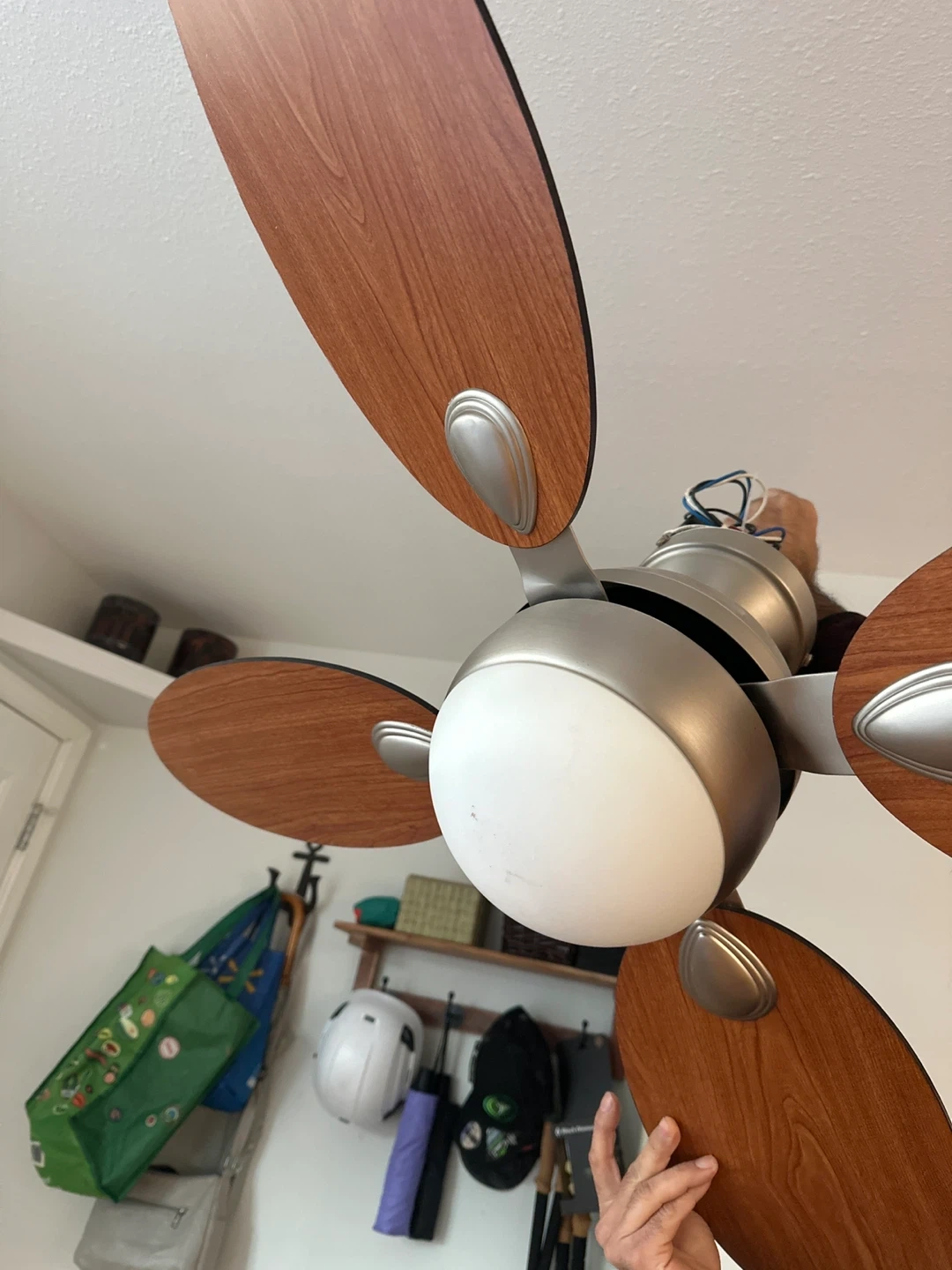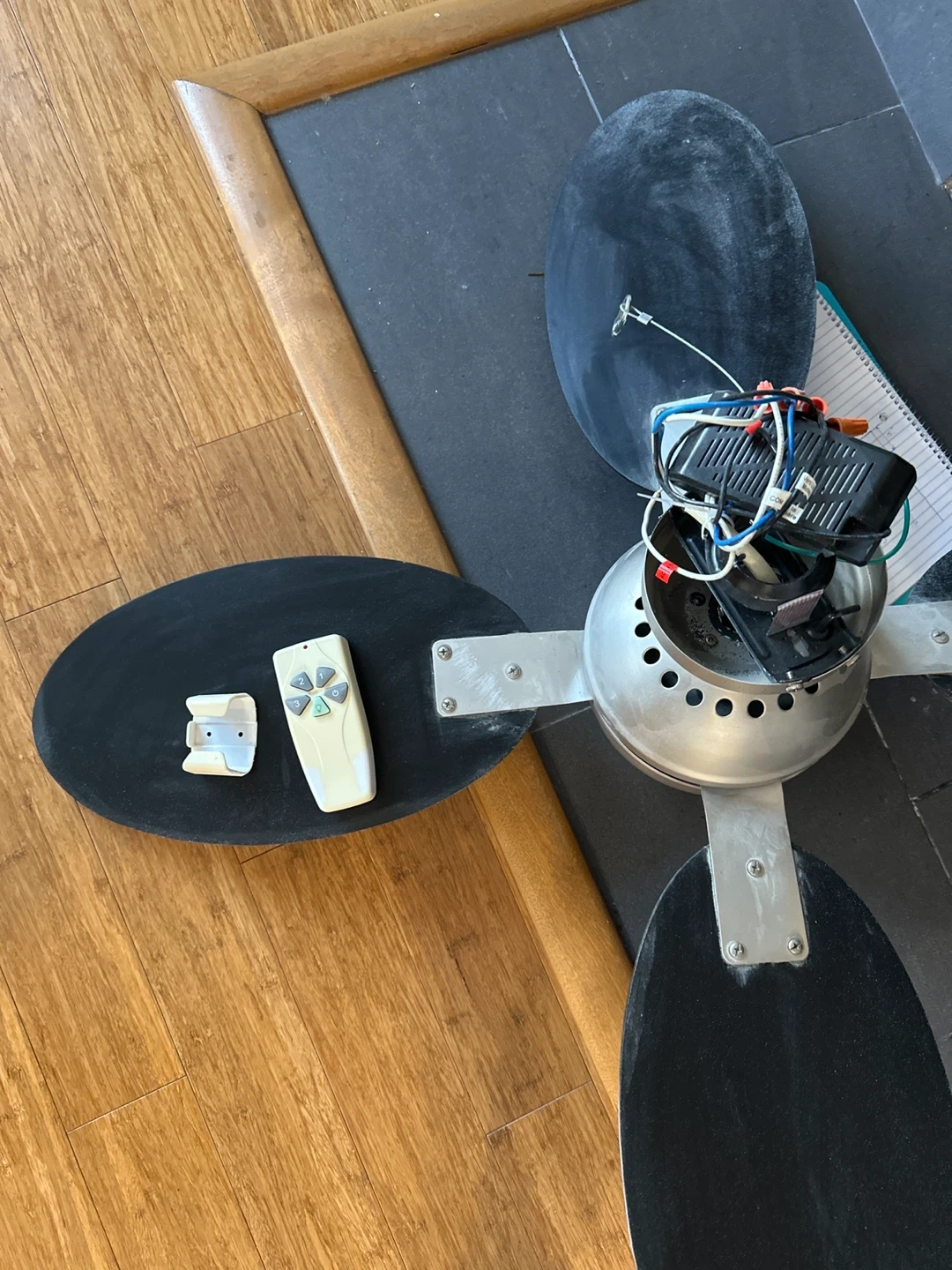 Selling a ceiling fan that comes with a remote control. It features multiple blades and a central light fixture. Great for adding a stylish and functional touch to any room!
