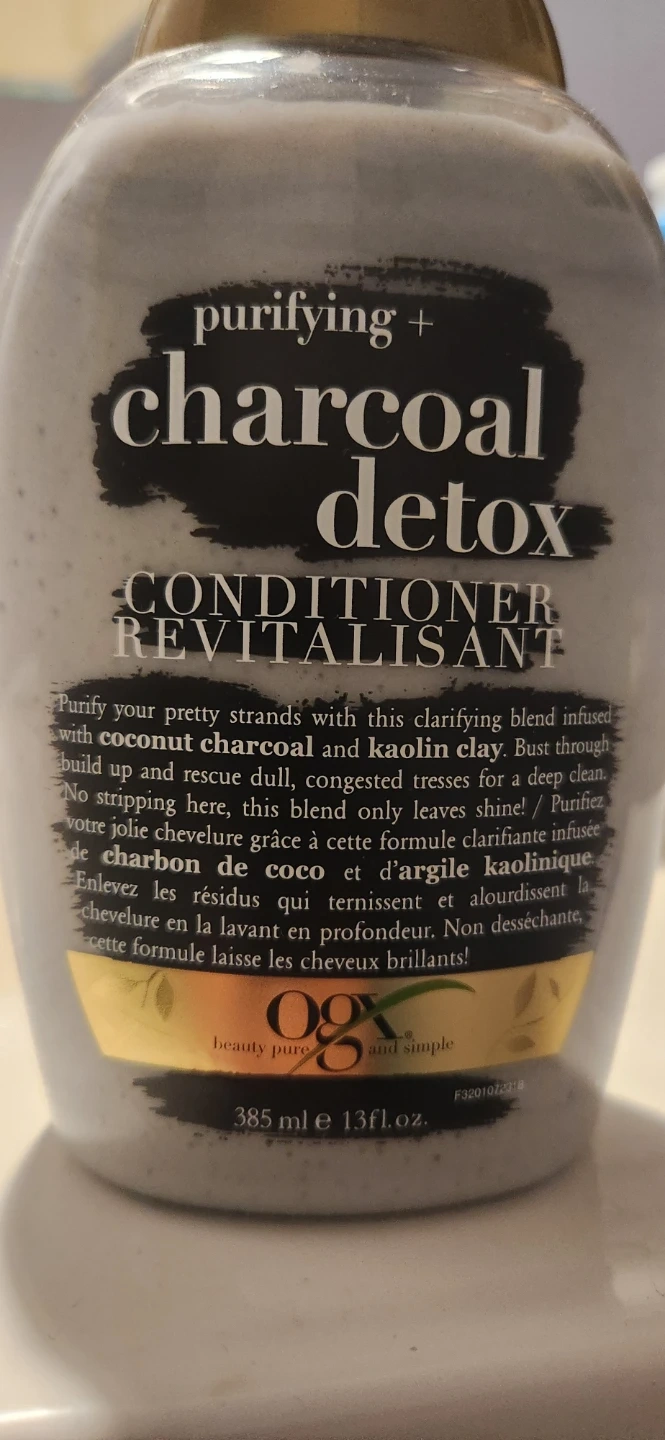 I'm selling a bottle of OGX Purifying Charcoal Detox Conditioner! This conditioner revitalizes your hair with a clarifying blend infused with coconut charcoal and kaolin clay. It helps to remove buildup and rescue dull, congested tresses, leaving your hair shiny and clean. The bottle contains 385ml or 13 fl.oz