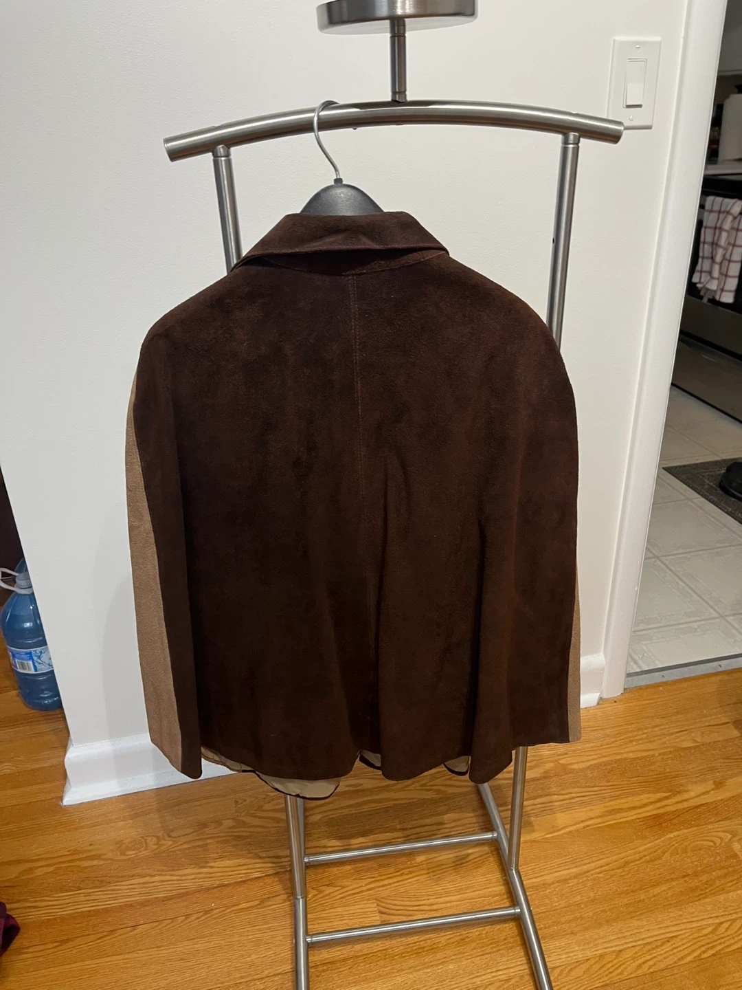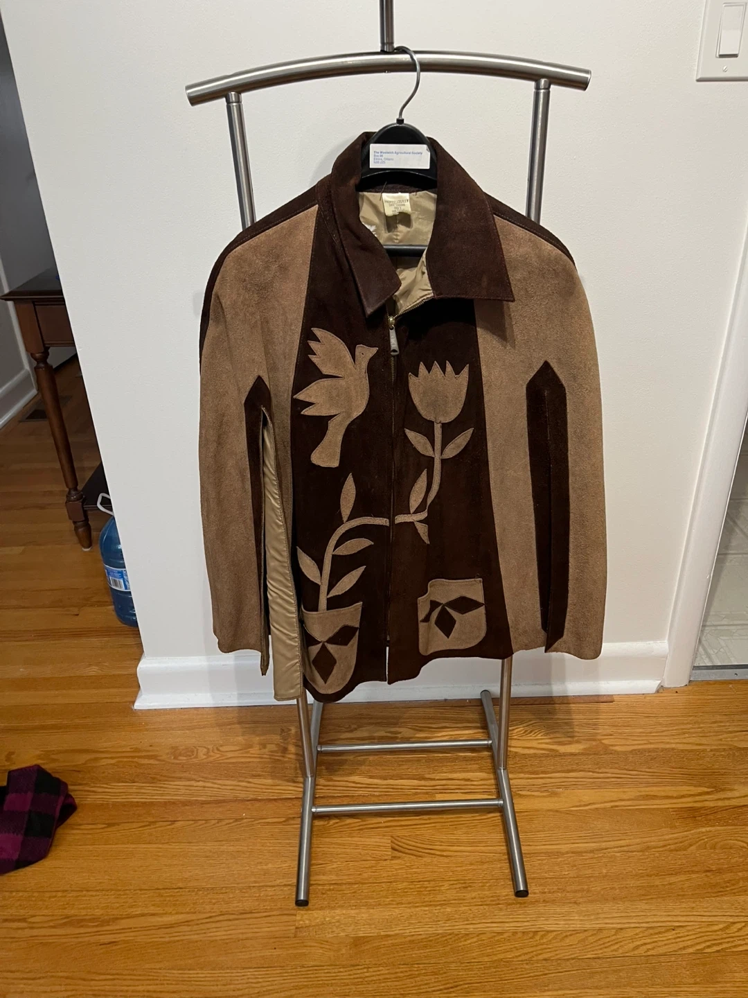 Vintage 1960s suede cape/poncho featuring an appliqué folk design with a bird and flowers, handmade in Mexico. Classic representation of the "flower power" and bohemian styles popular during that era.