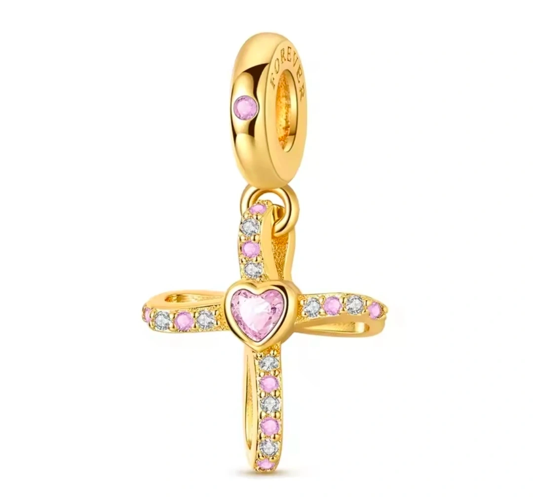 This Forever Queen charm is a lovely addition to any bracelet or necklace! The gold-tone cross features a sweet pink heart at its center and is adorned with pink and white stones. It's in excellent condition and ready to be worn