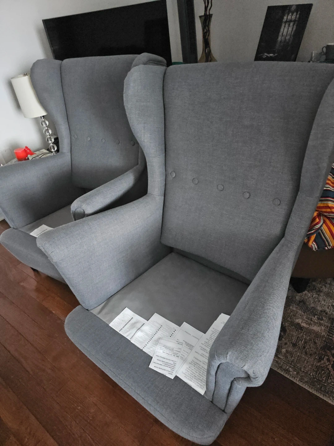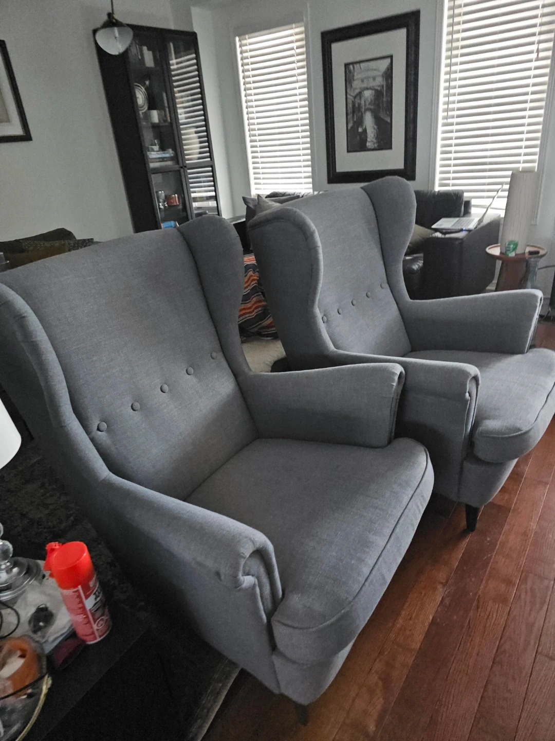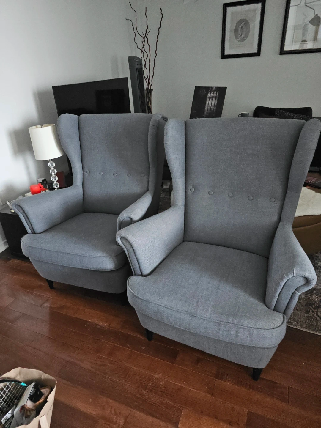 Almost new hardly used 2 IKEA Strandmon Arm chairs both Grey as shown .