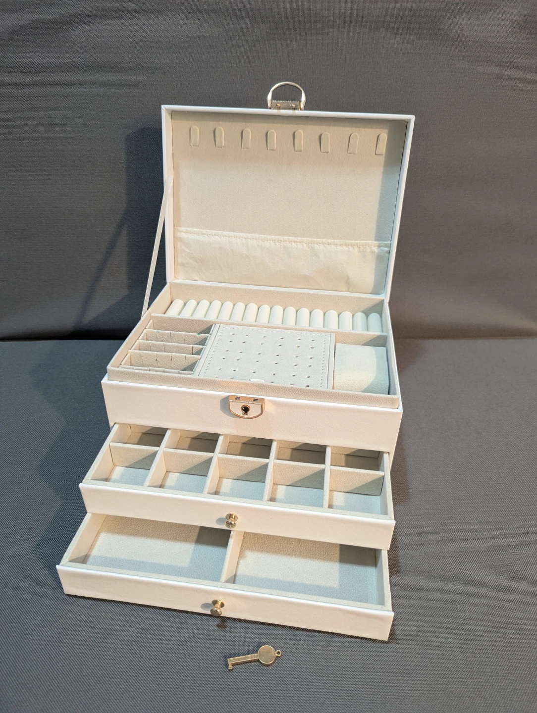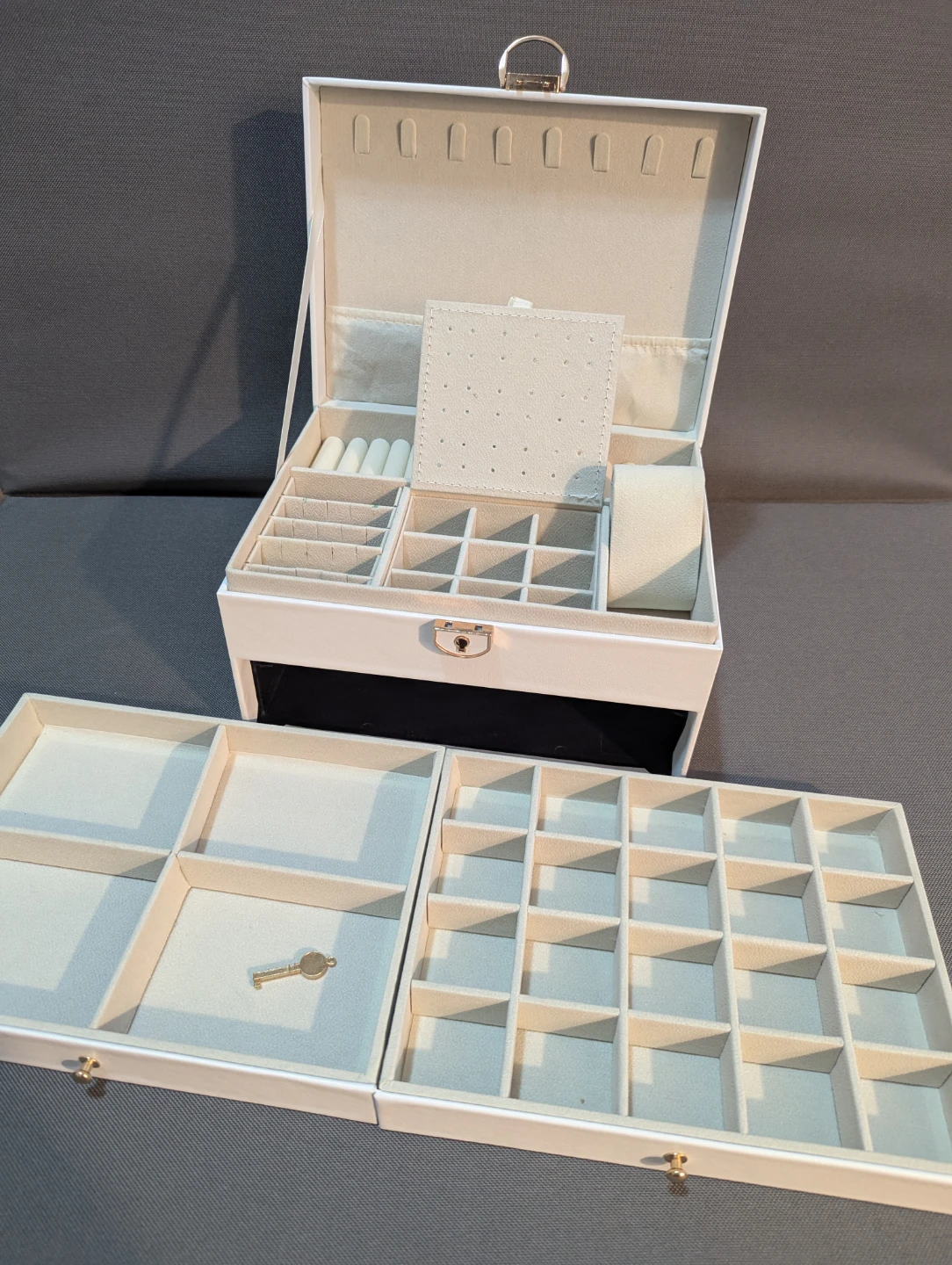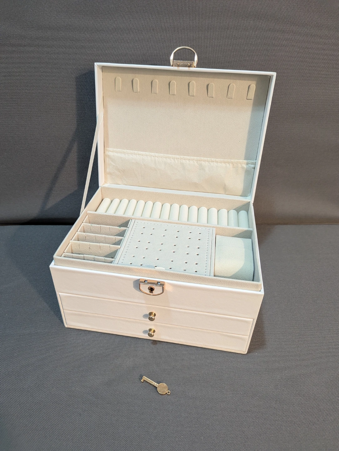 Selling a jewelry box in great condition! It's white and comes with a key to keep your precious items safe and sound. It features multiple compartments for rings, necklaces, earrings, and more. Perfect for organizing your jewelry collection!