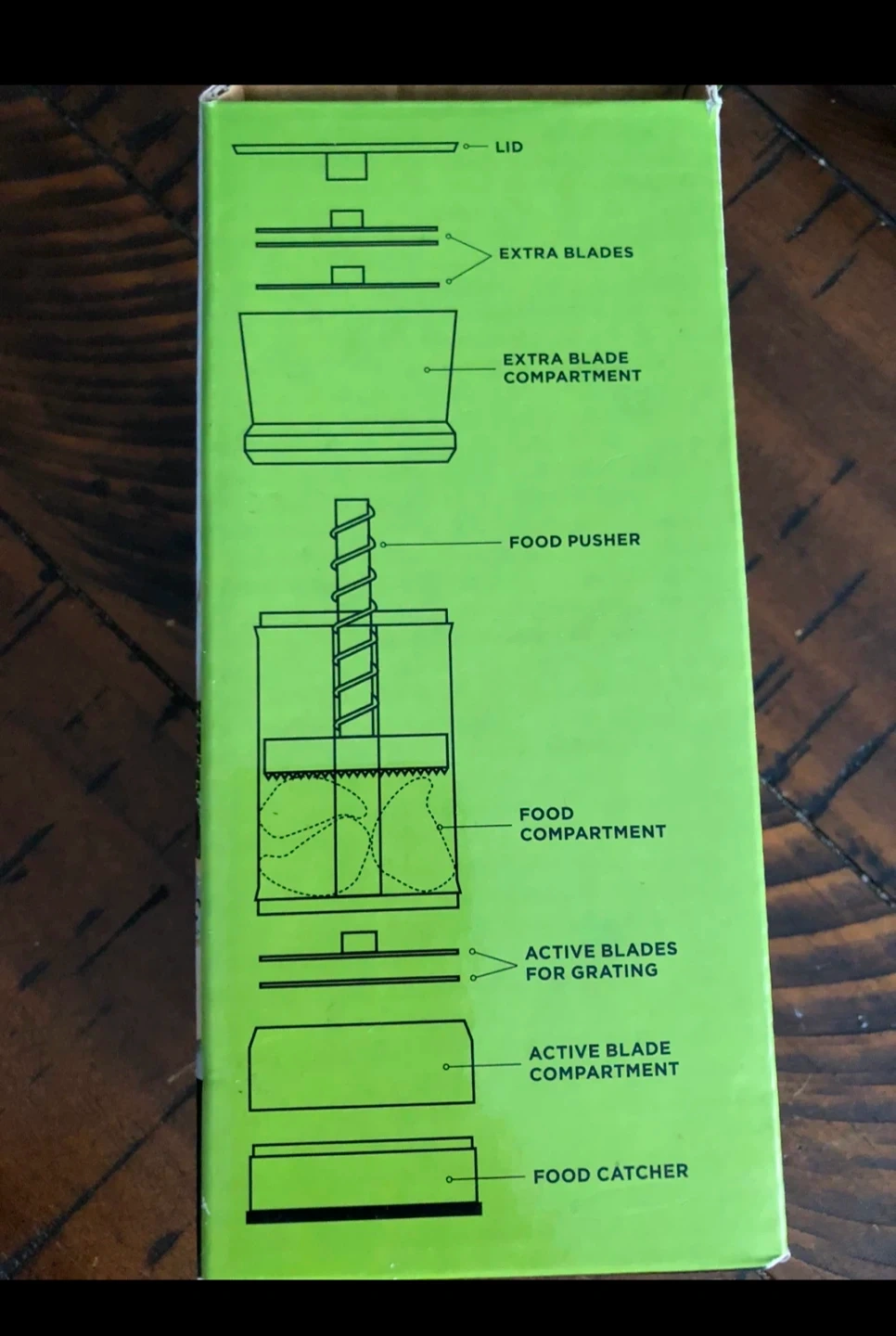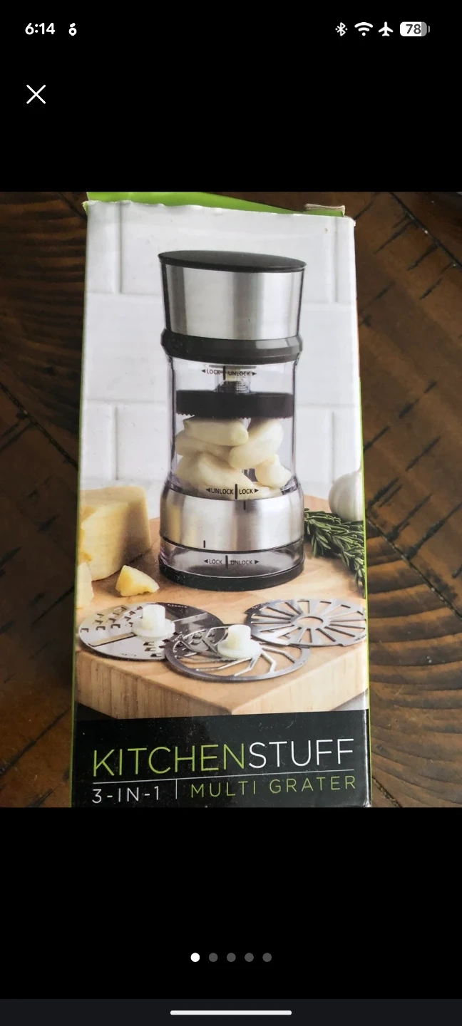 I'm selling a Kitchen Stuff 3-in-1 Multi Grater! It comes with different blades for grating cheese, shaving cheese, mincing garlic and chopping herbs. The box includes the lid, extra blades, extra blade compartment, food pusher, food compartment, active blades for grating, active blade compartment, and a food catcher!