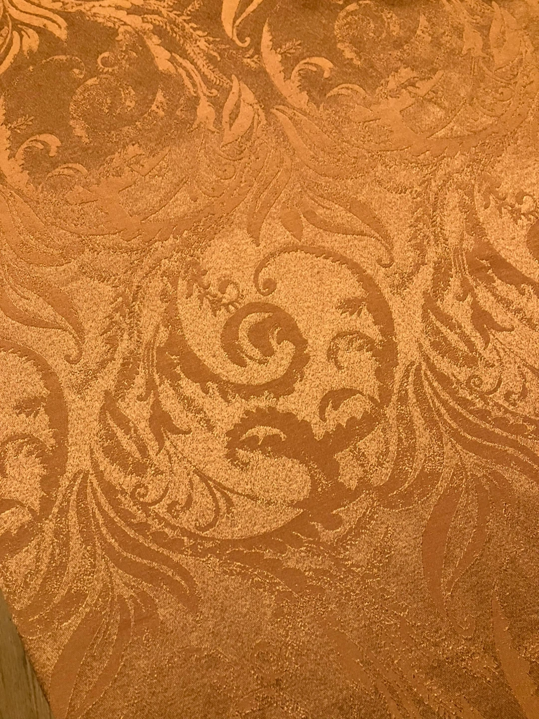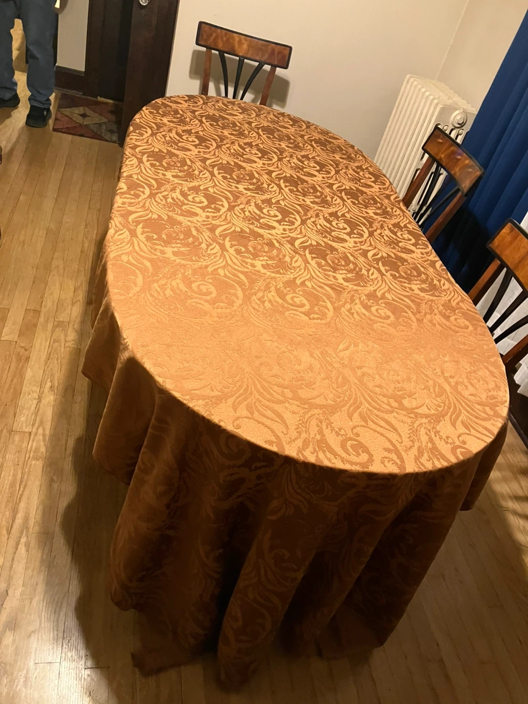 This is a beautiful gold/rusty colored patterned rectangular tablecloth. It would look great on any table! Fits a table for 10-12! Don’t need it anymore because I have an oval table now.