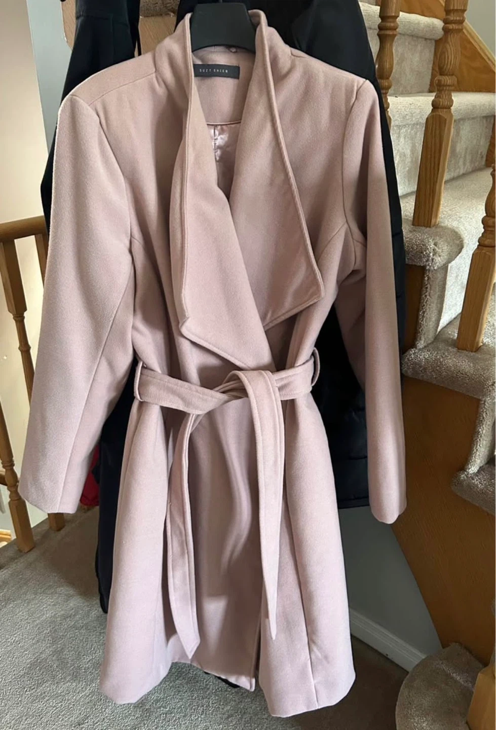 Selling a lovely pink belted coat from Suzy Shier! It's in great condition and perfect for layering during the cooler months. The coat features a stylish design with a flattering belted waist. It will keep you cozy and chic!
