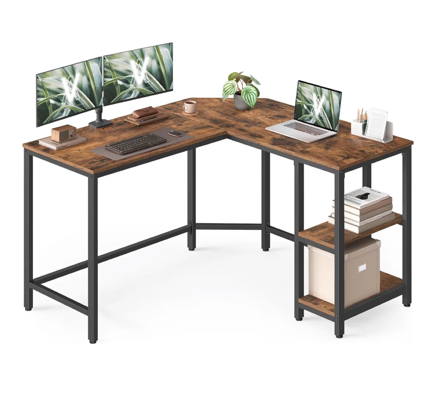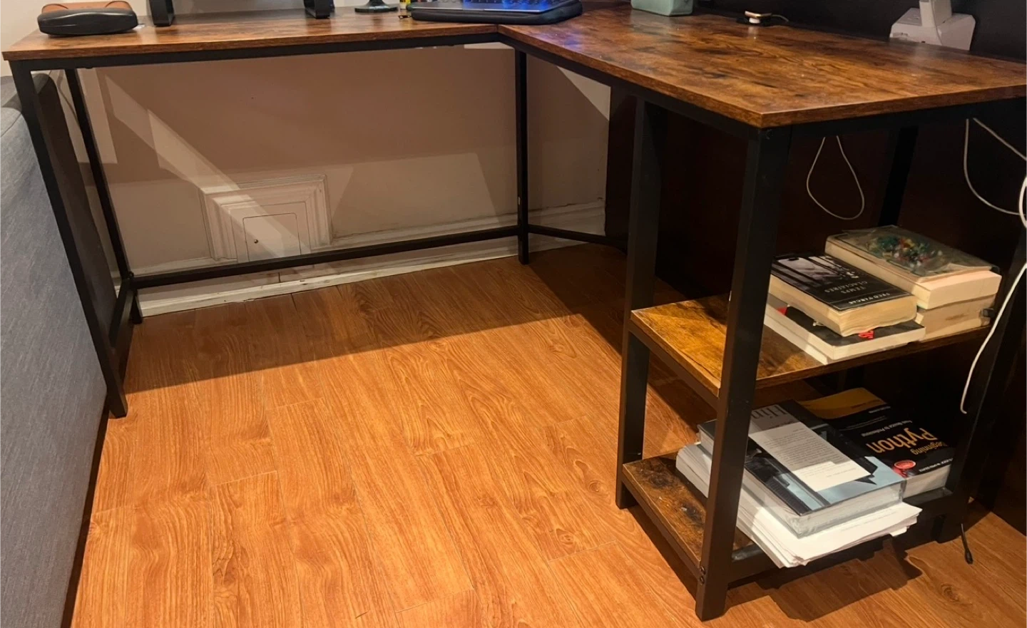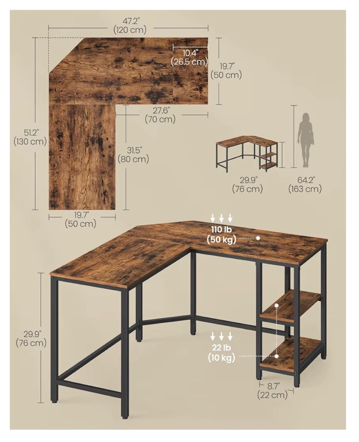 Selling a great L-shaped corner desk! It has a rustic brown top with black metal legs. There are shelves on one side for extra storage, perfect for books or office supplies. The dimensions are approximately 47.2" x 51.2" on the long sides and 29.9" in height.
