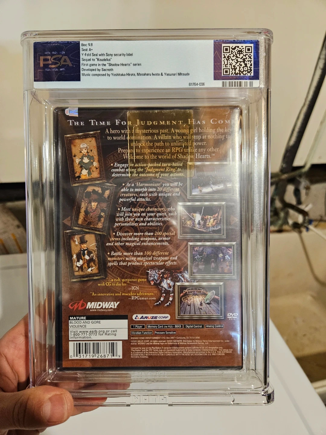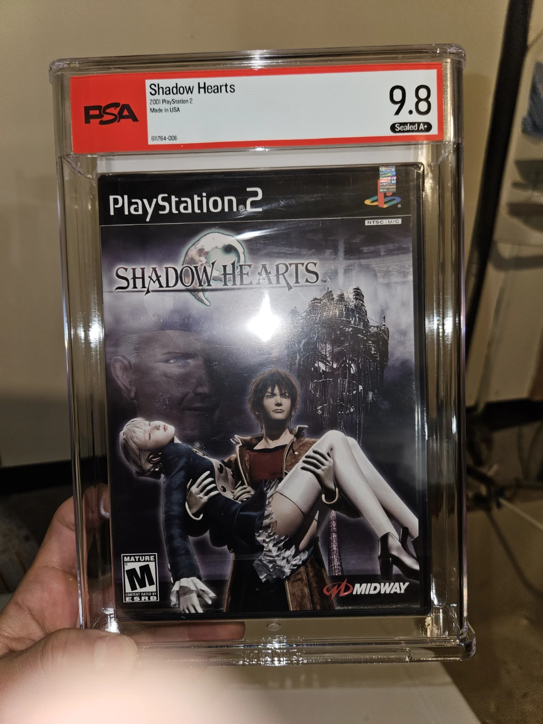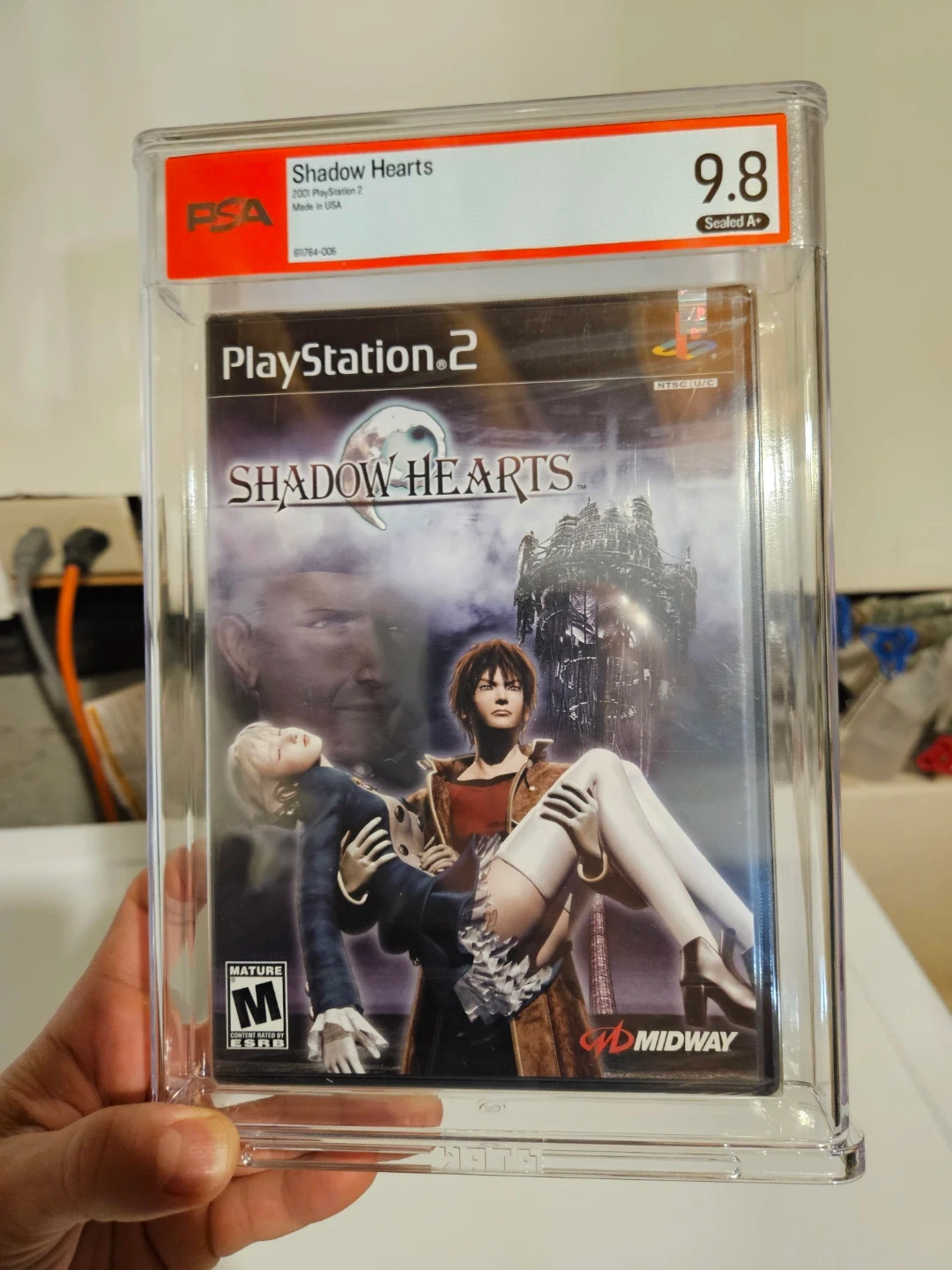 Selling a graded copy of Shadow Hearts for the PlayStation 2! It's graded by PSA at 9.8. The case is sealed with Sony security label. It's the first game in the Shadow Hearts series. The music was composed by Yoshitaka Hirota, Masaharu Iwata & Yasunori Mitsuda. The game is rated Mature.