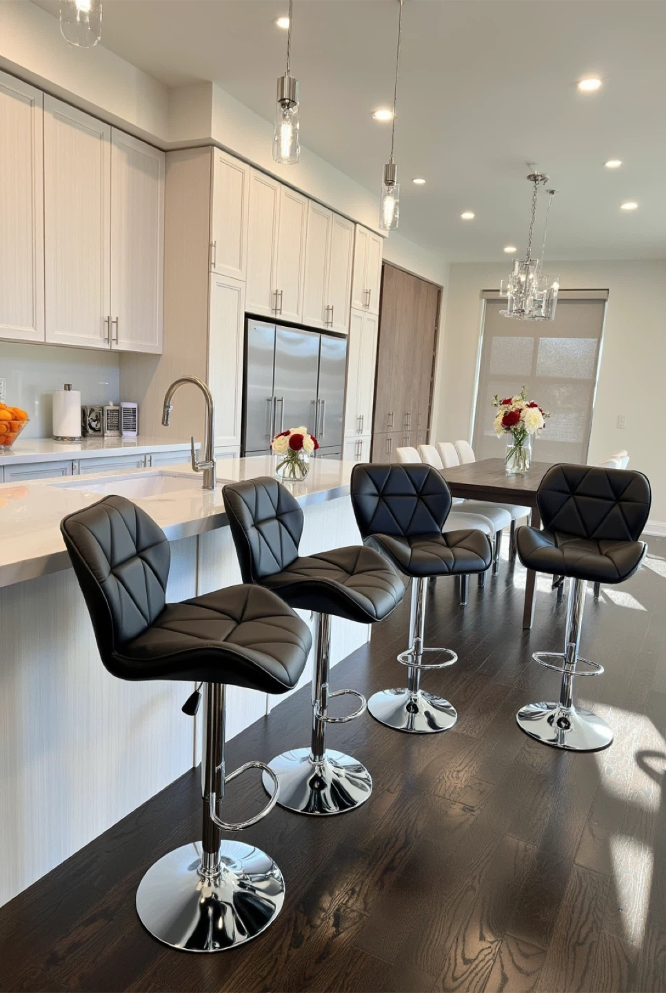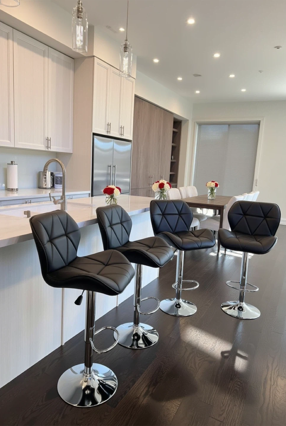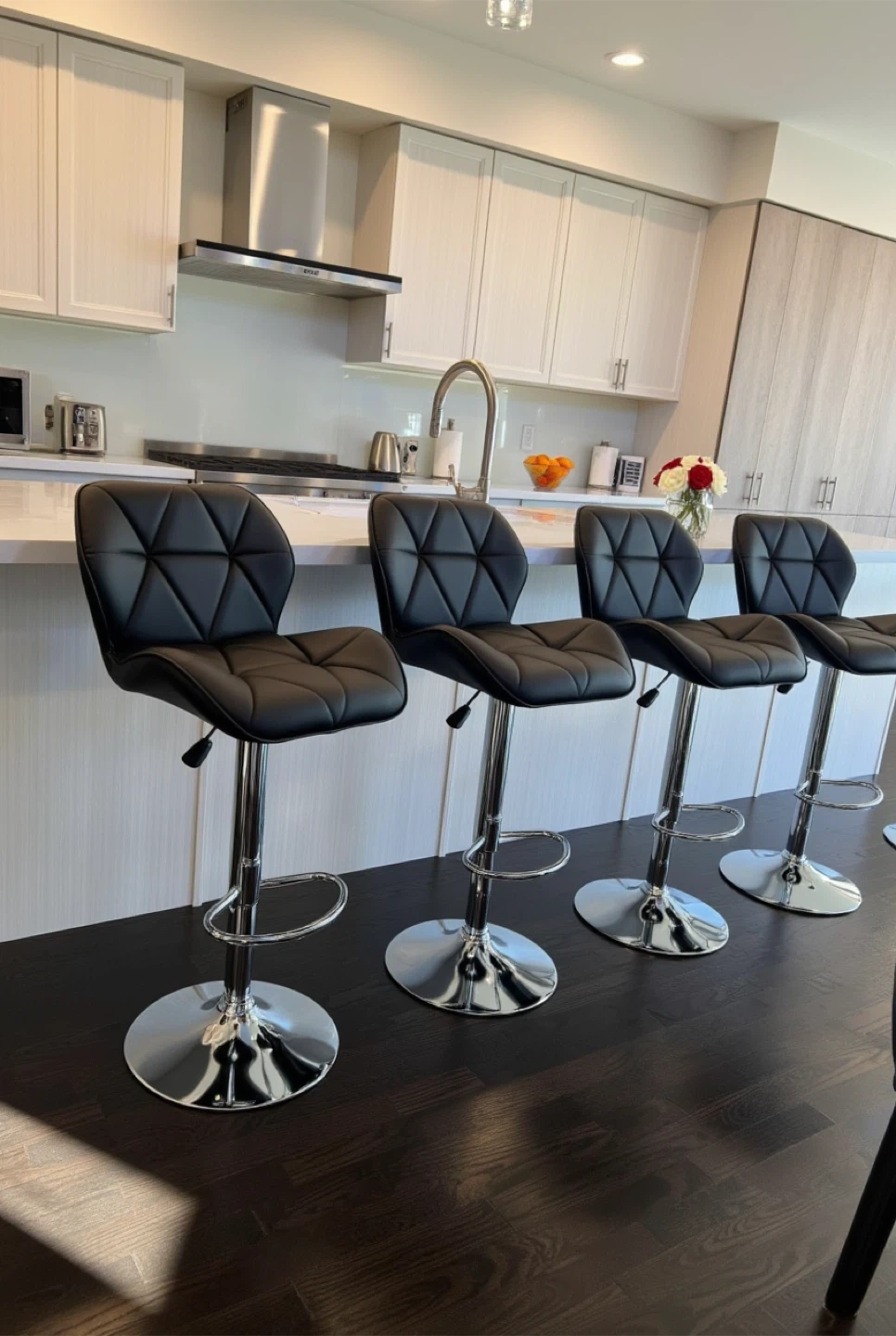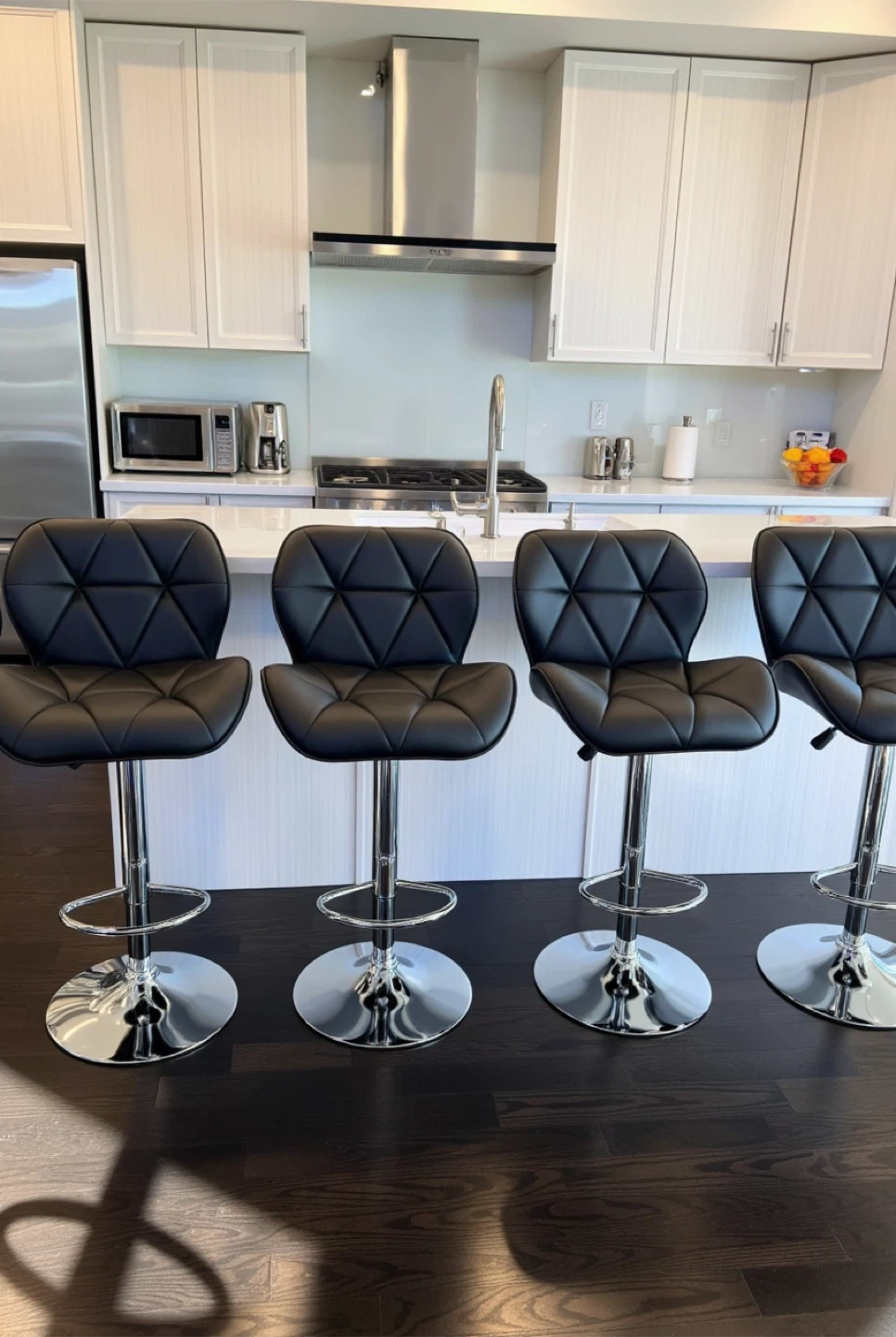 Selling a set of four stylish black bar stools. They feature a sleek design with a chrome base and adjustable height, perfect for any kitchen or bar area. The seats have a comfortable, quilted pattern. They are in great condition and ready to elevate your space!