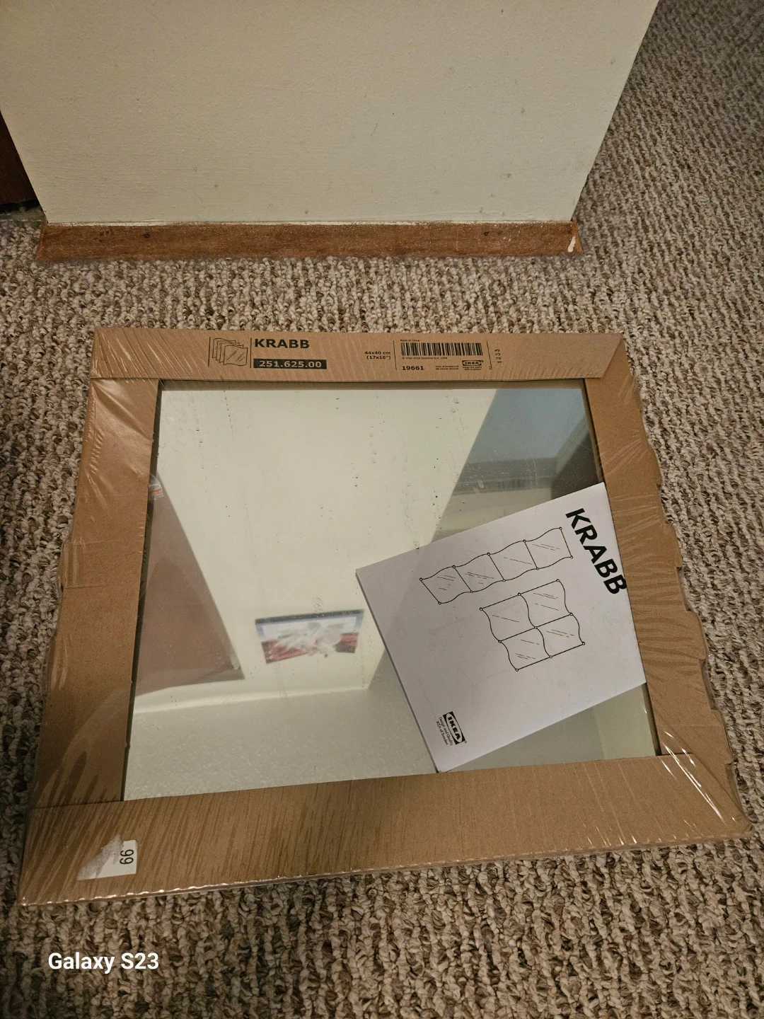 Selling a brand new IKEA KRABB mirror, still in its original packaging! It's a stylish and versatile mirror that can be arranged in a variety of ways to suit your space. The box includes all the necessary hardware for mounting.