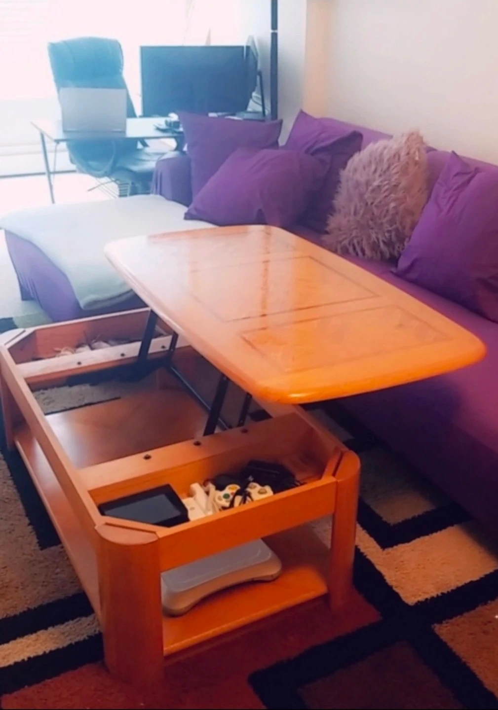 Selling a unique lift-top coffee table! It's perfect for adding some functionality and a pop of colour to your living room. The lift-top design makes it great for working from home or enjoying a meal in front of the TV. It also has some storage space underneath for books or games