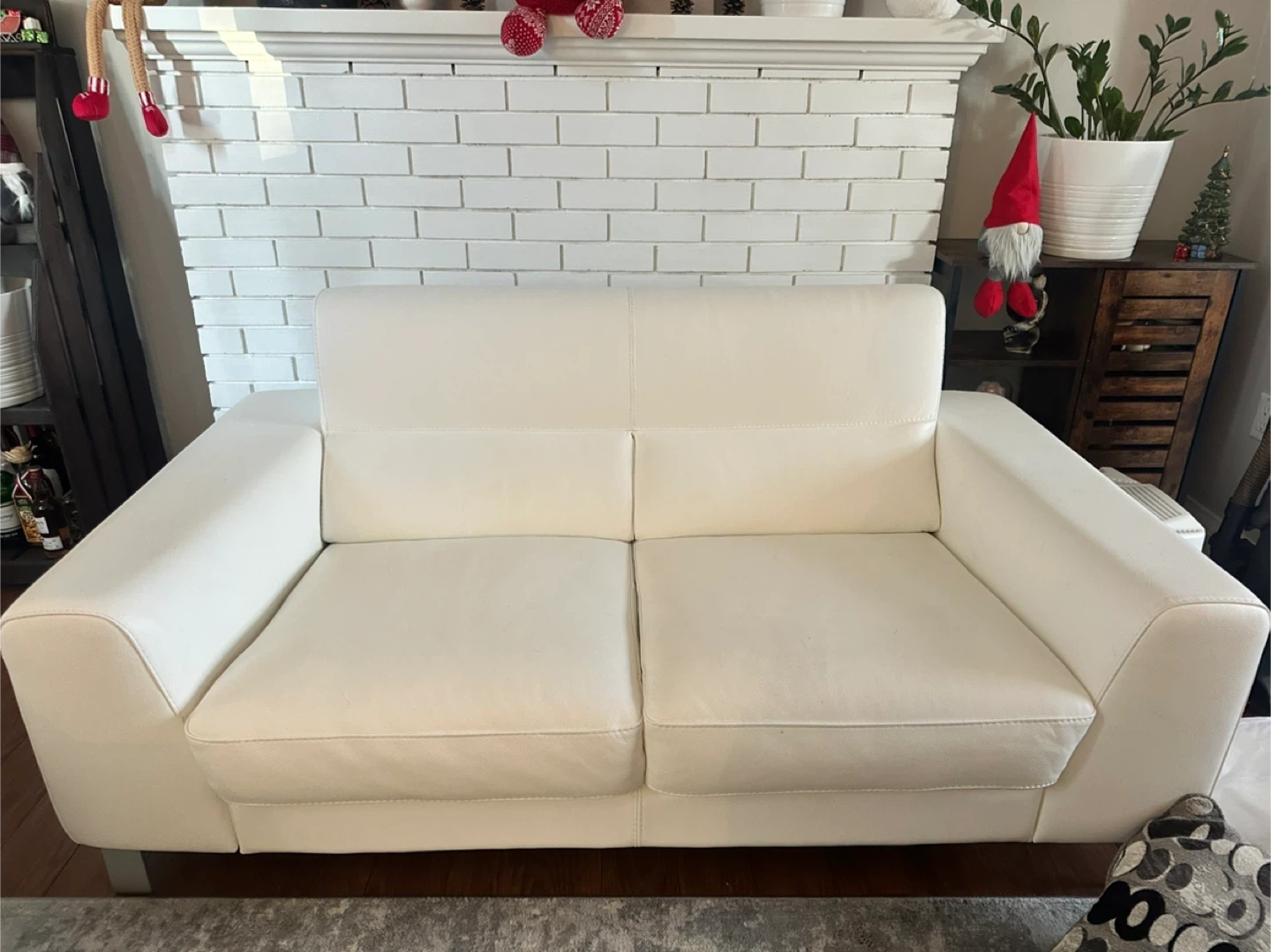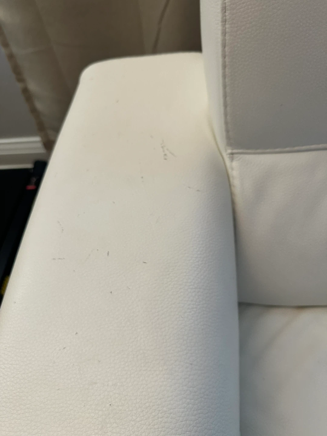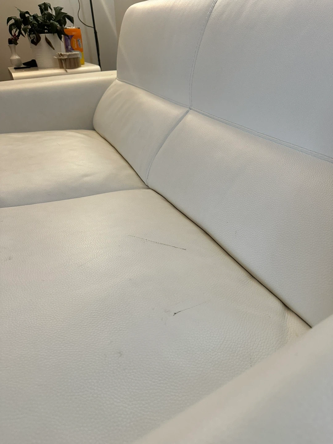 Selling two comfy white leather loveseat couches with two side tables! The couches are in okay condition but has many cat stretches as seen in photos. Perfect for a small space or apartment. Asking for $400. Couches are 5’ x 3’
