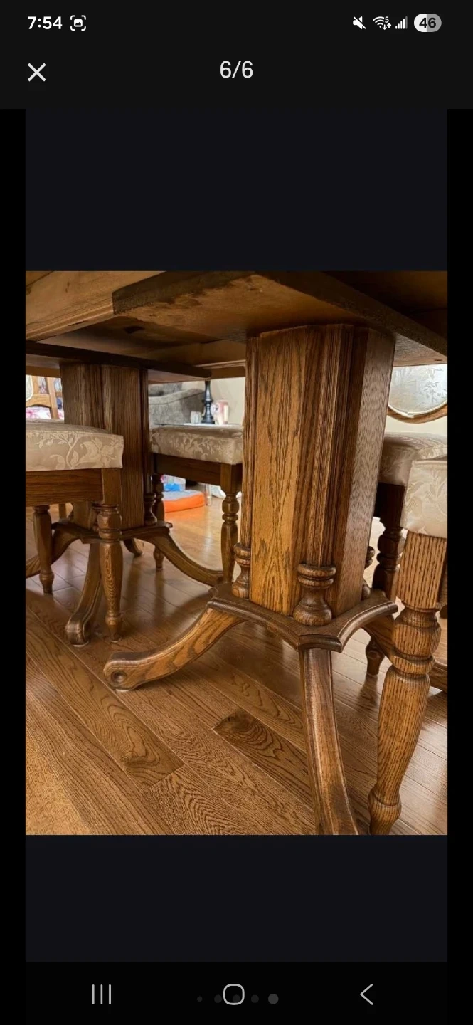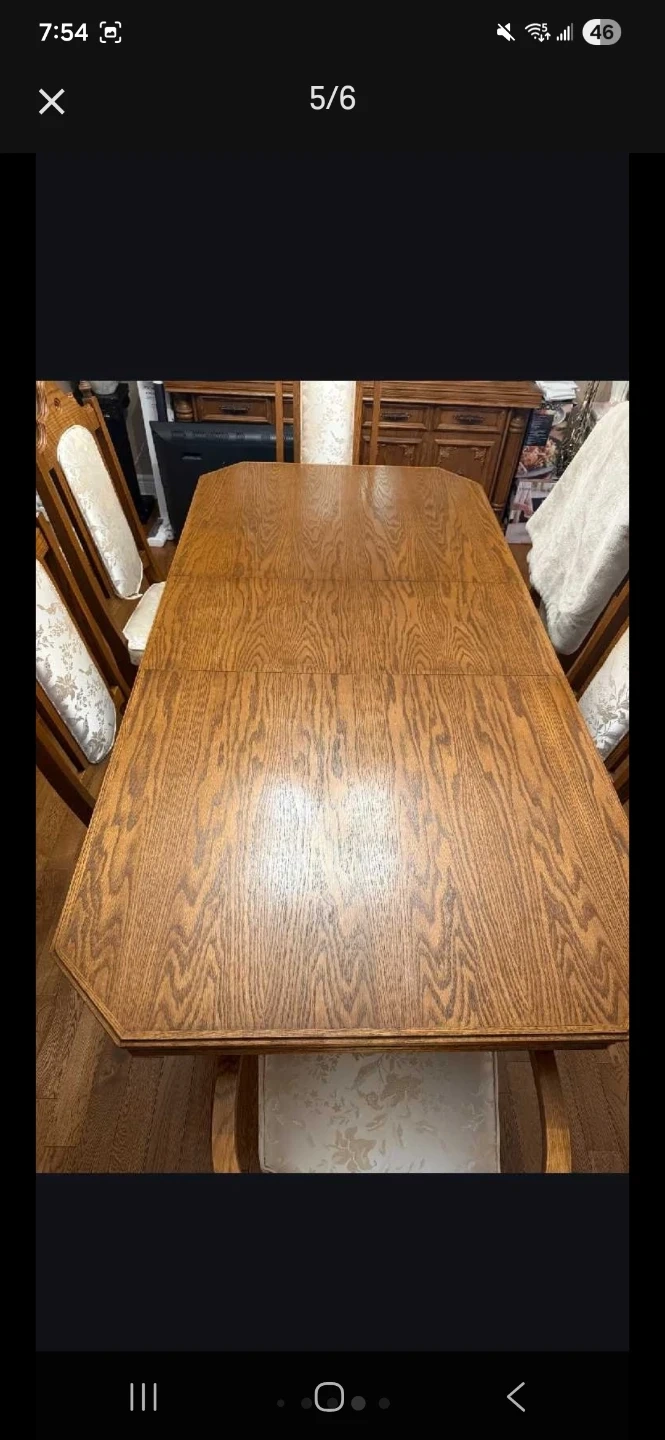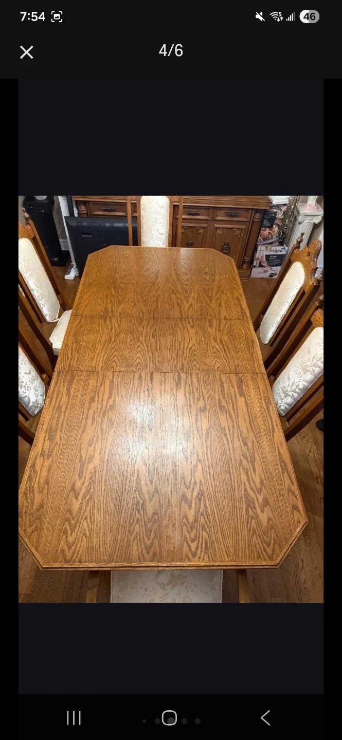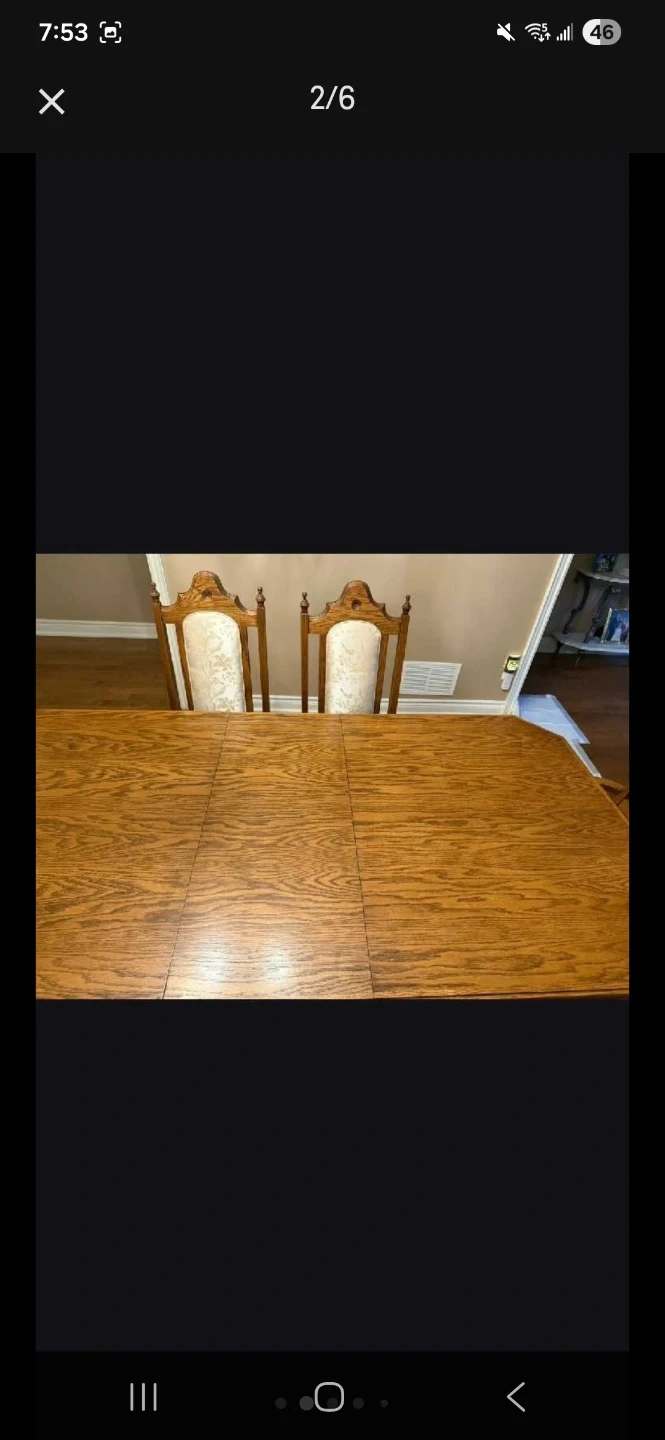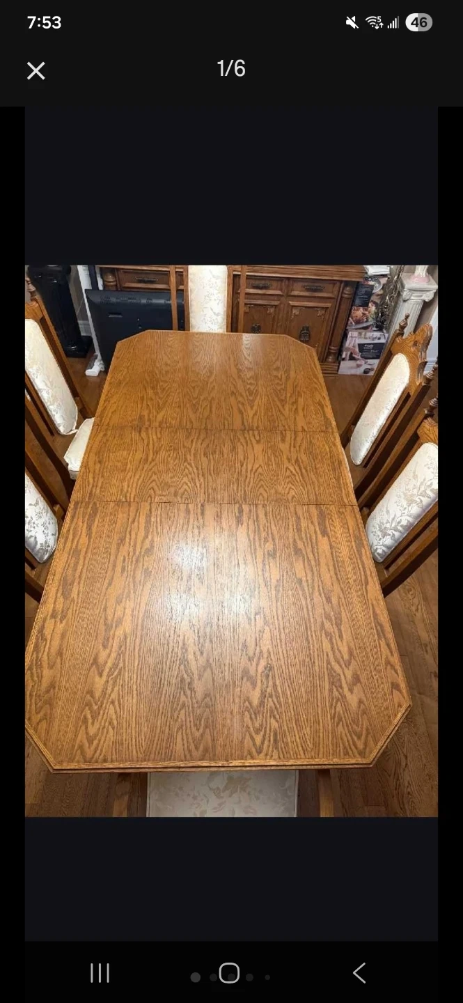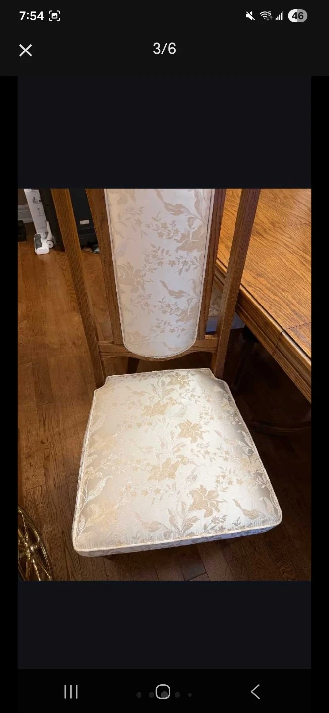 Selling a dining table with 6 chairs. The table is made of wood and has a beautiful wood grain finish. The chairs have upholstered seats and backs with a floral pattern. It's in good condition and ready for a new home!