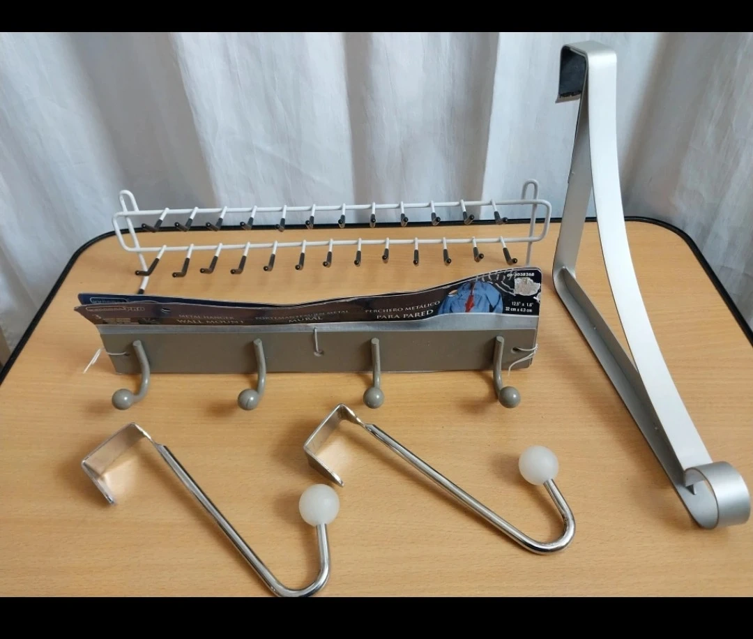 Selling a lot of metal hangers! Includes a wall-mounted hanger and several over-the-door style hangers. ✅️1 new hook that comes with hardware for installation. 3 single pieces over the door hangers and 1 tie/belt hook. Sf/pf home. Great for adding extra storage space in your home or apartment.