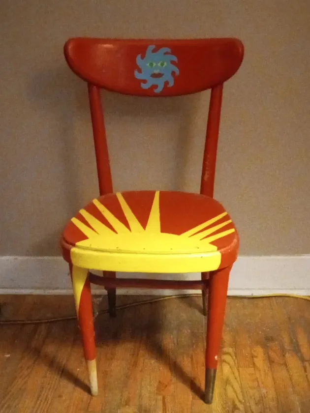 This is a hand painted chair with a red frame and a yellow seat. It has a unique sun design on the seat and a face design on the back.