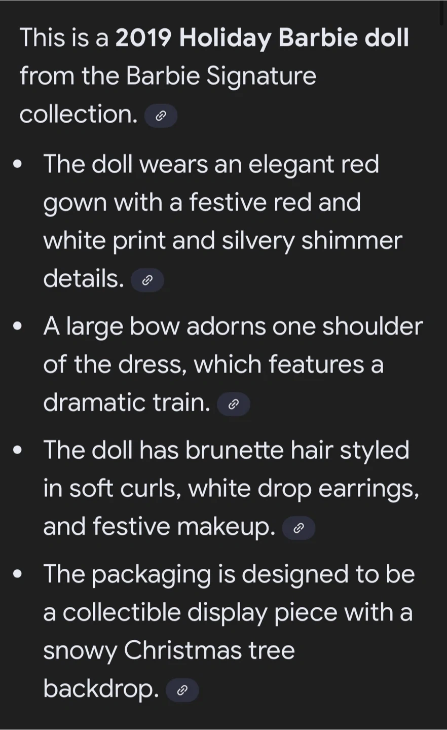 Selling a brand new 2019 Holiday Barbie doll! It's still in its original packaging and has never been opened. This Barbie is wearing a beautiful red and white gown, perfect for the holidays. This doll is from the Barbie Signature collection!