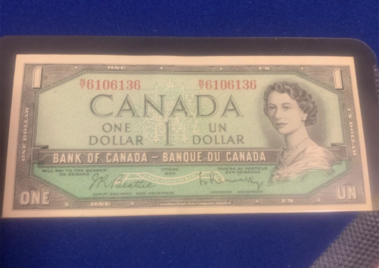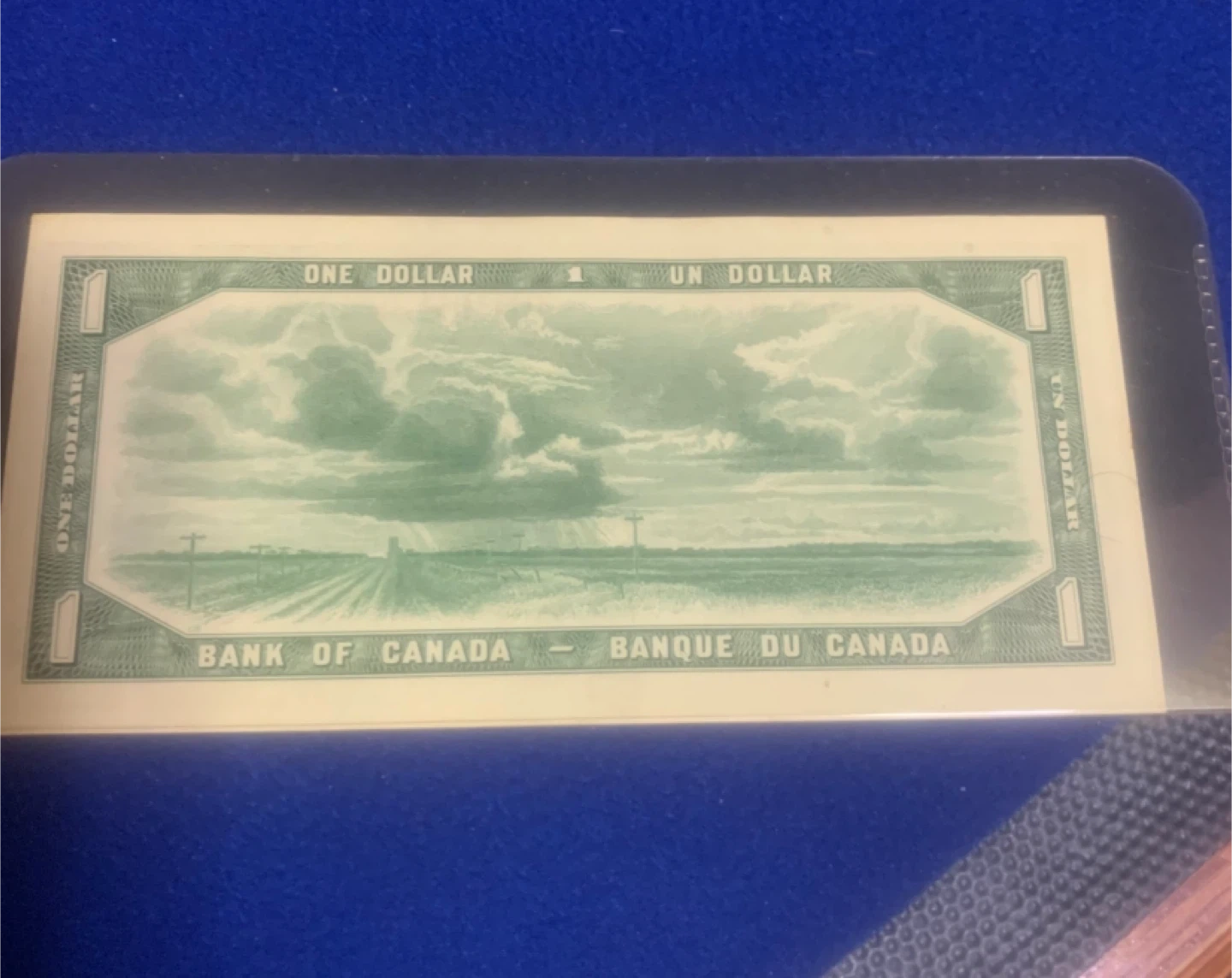Selling a Bank of Canada one dollar bill from 1954. It features a portrait of Queen Elizabeth II and a landscape scene on the back. A unique piece of Canadian history! Open to reasonable offers