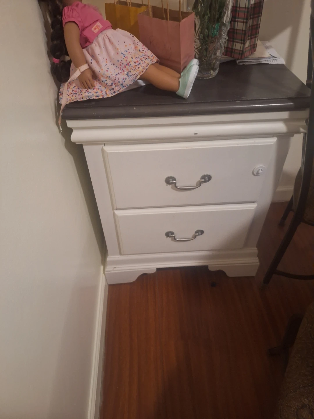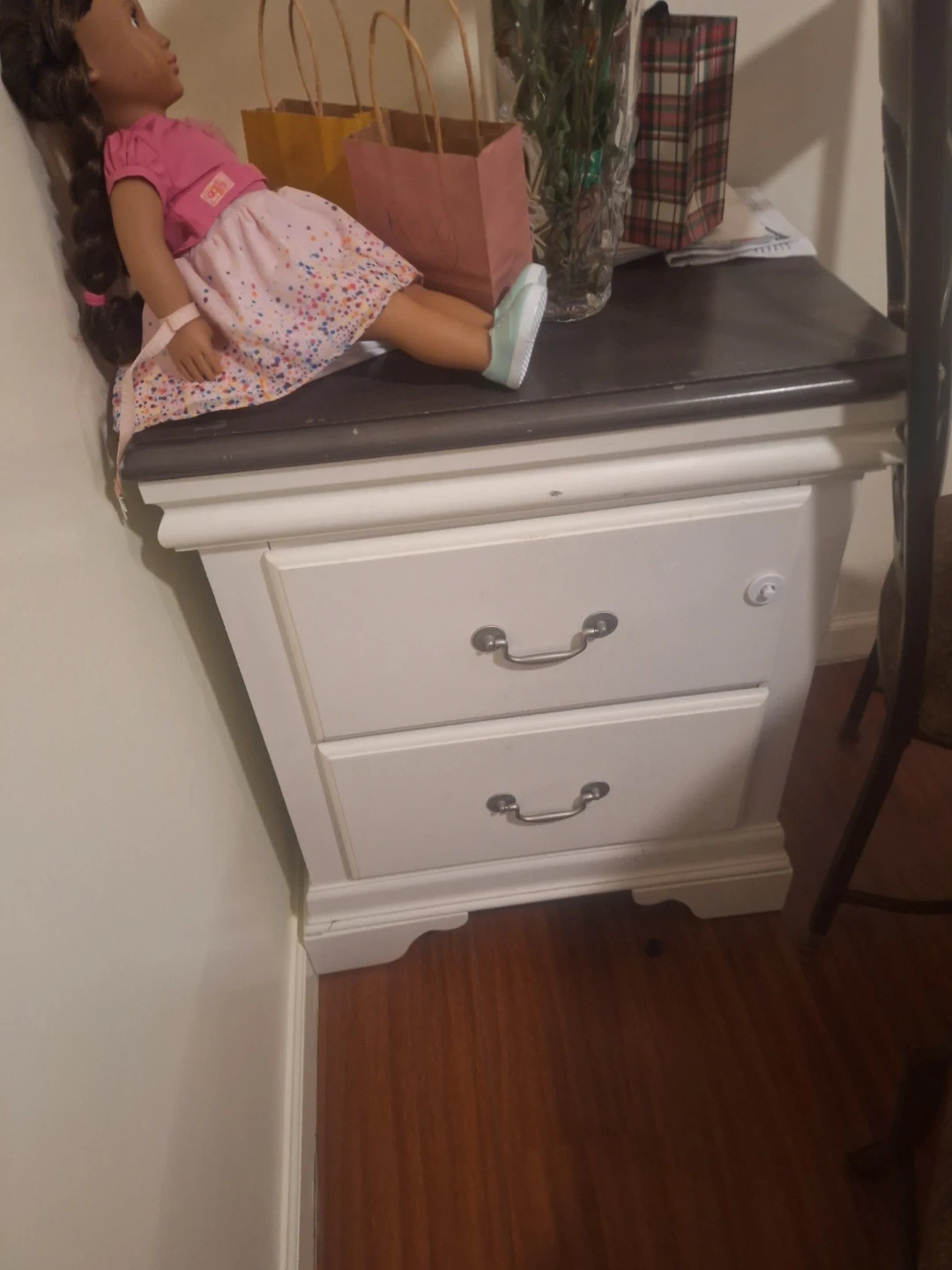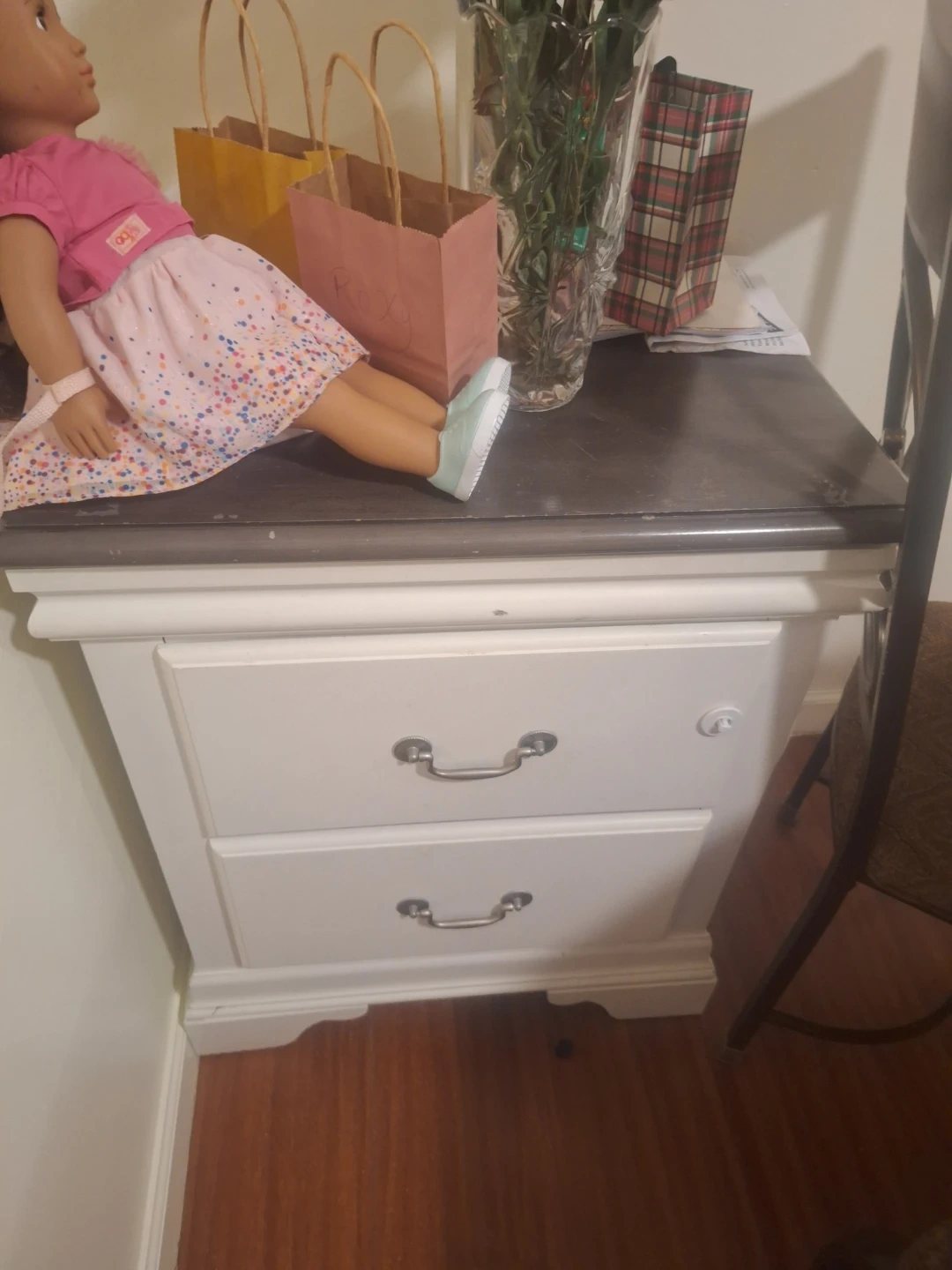 Here's a white nightstand with two drawers. It's in good condition and ready to use in your bedroom or living room. It has a dark top and silver handles. Perfect for storing your bedside essentials!