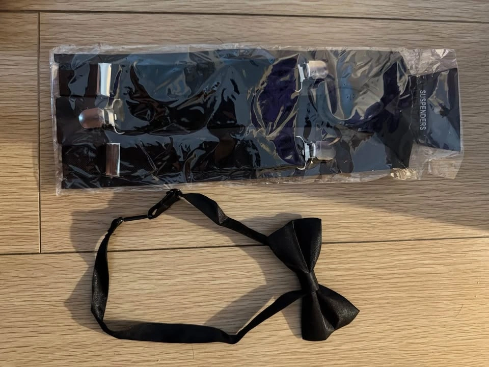 Includes: vest, suit, pants, tie, and suspenders