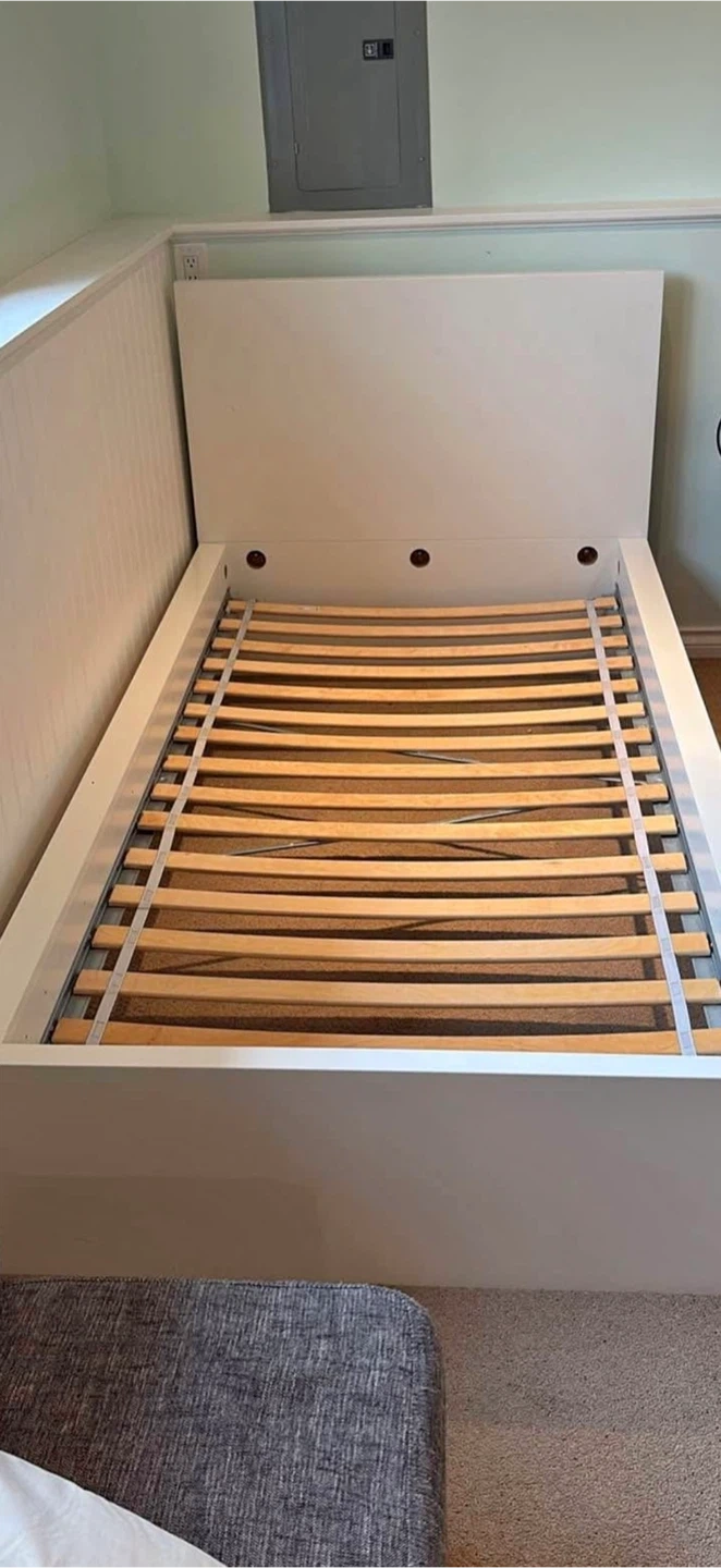 Selling a white IKEA Hemnes single bed frame! It's in great condition and ready for a new home. This bed frame is known for its classic design and sturdy construction. Perfect for a kid's room or a guest room!