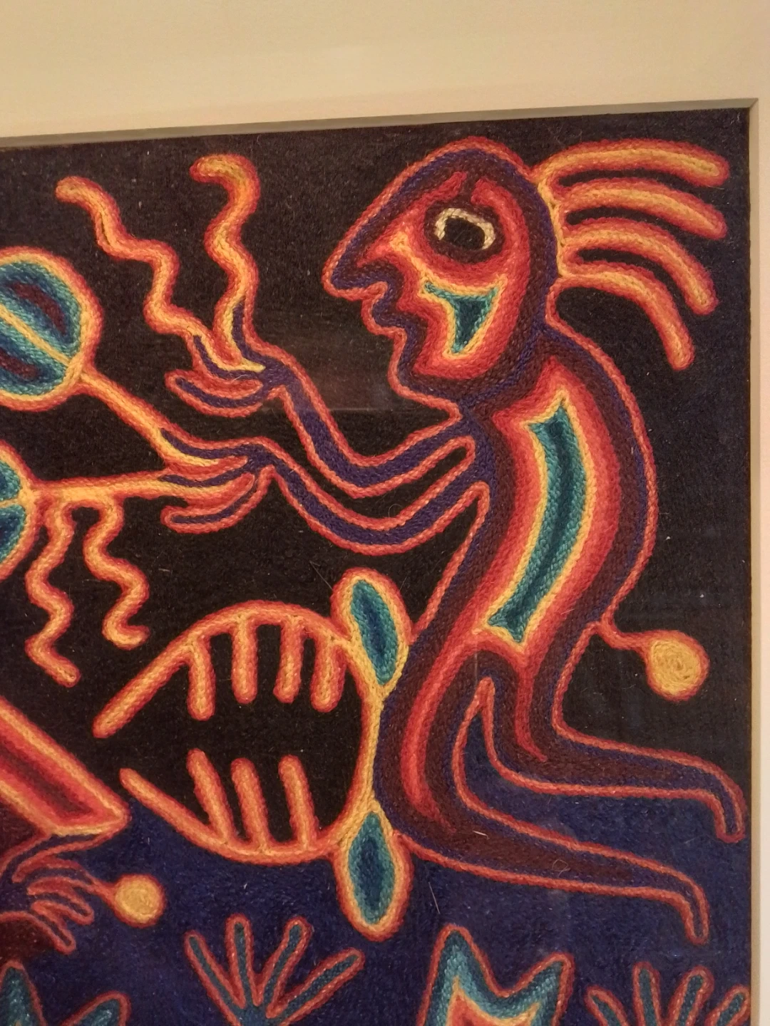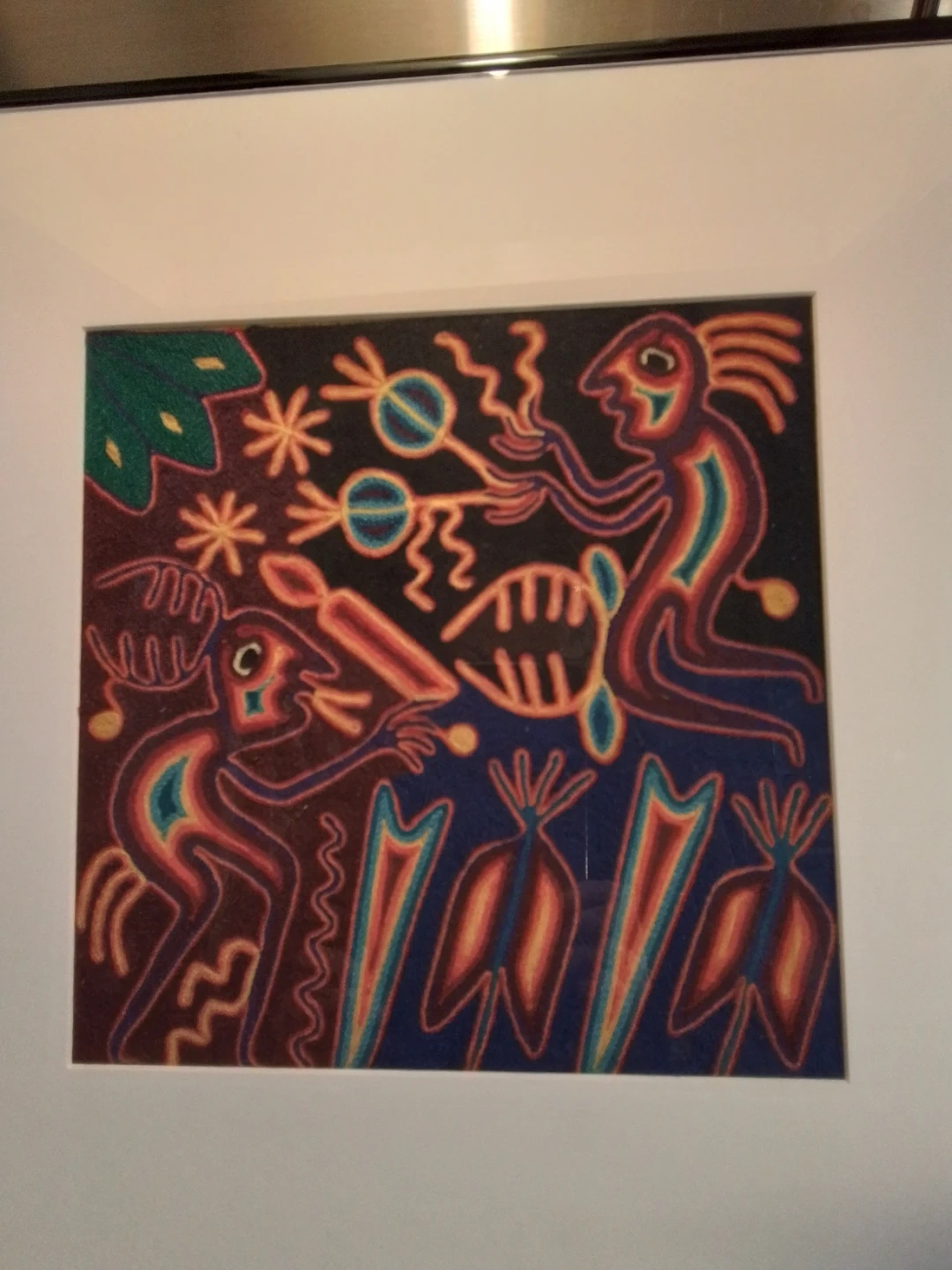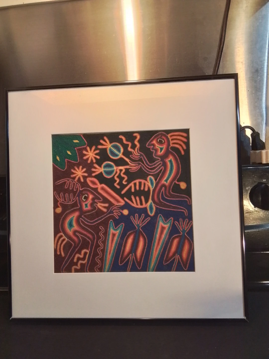 This vibrant Shamans Hichoy art piece measures 17.75x17.75 inches, bringing a touch of traditional indigenous artistry to any space. The artwork is in exellent condition, showcasing an authentic, textured feel that adds to its unique charm. It's a captivating conversation starter and a beautiful cultural artifact.