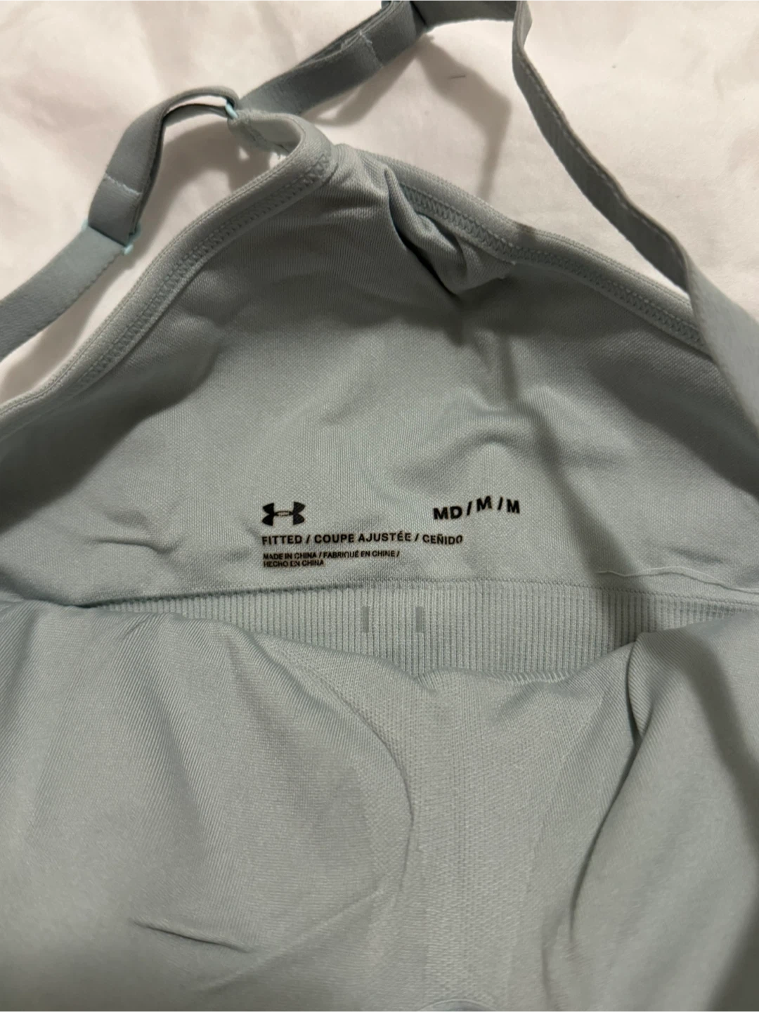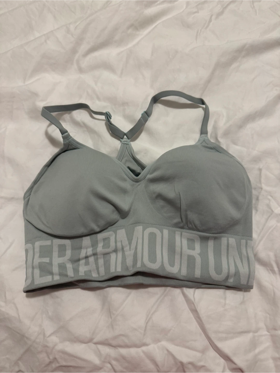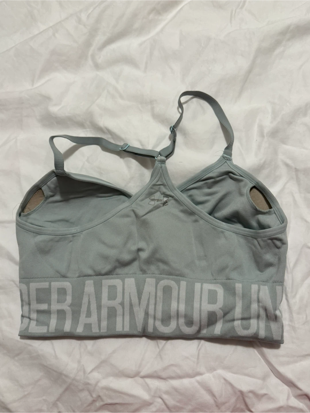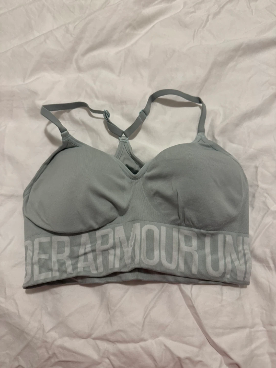 Selling an Under Armour sports bra in size medium. It's in great shape and ready for your workouts! It's a fitted style and a nice light mint colour