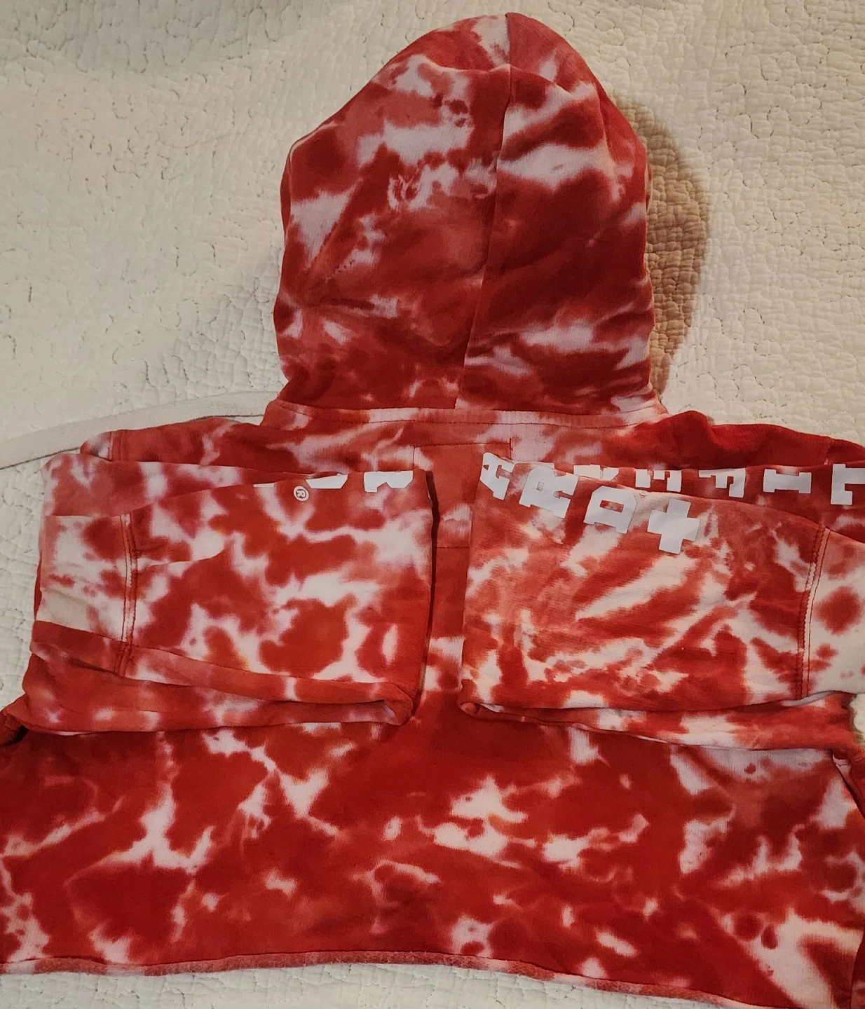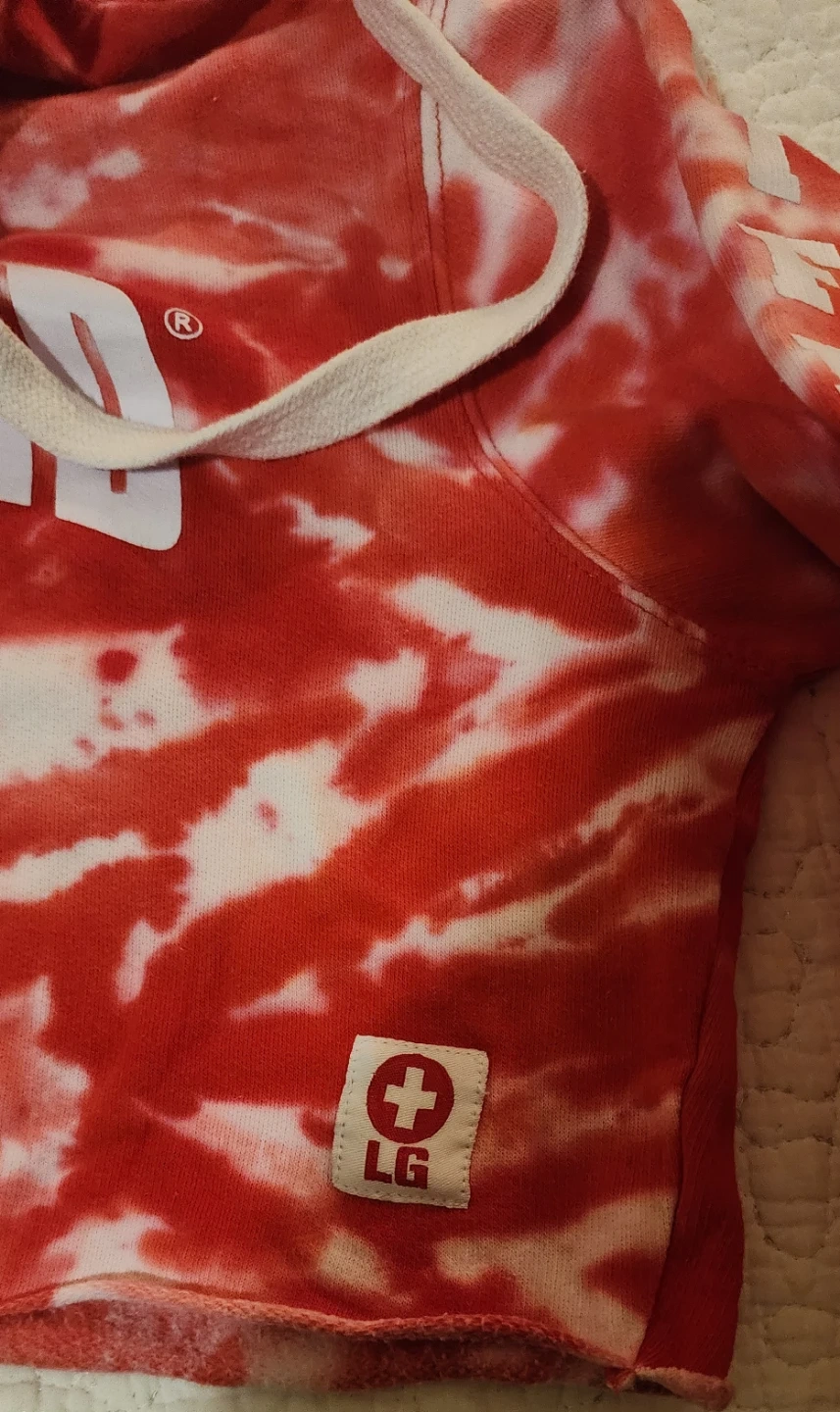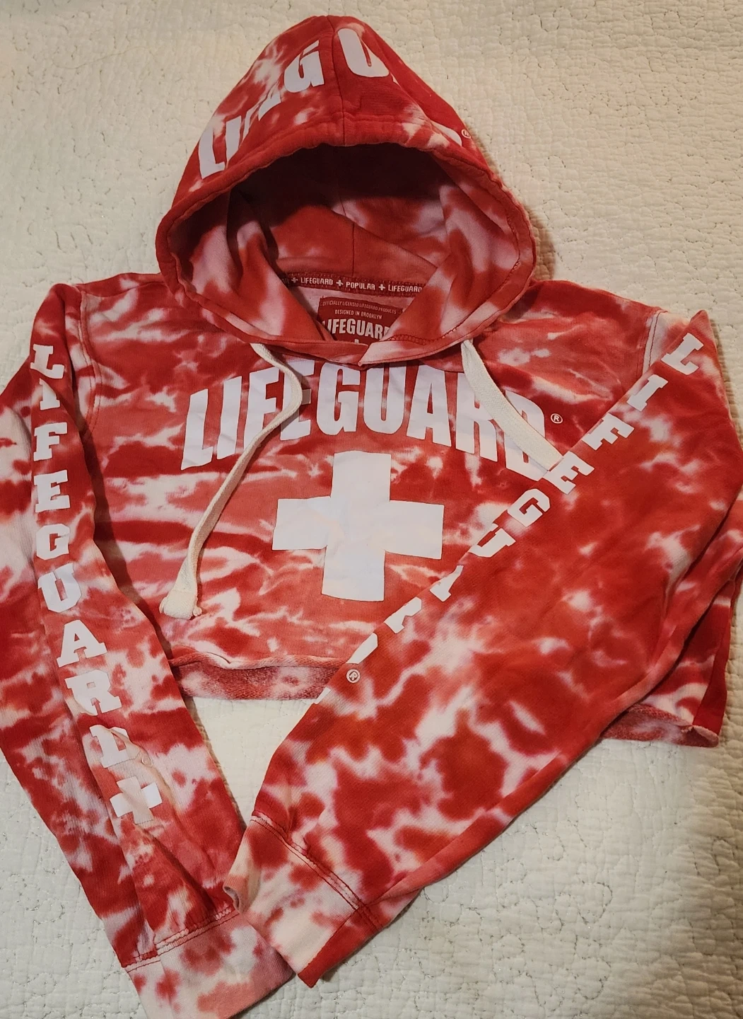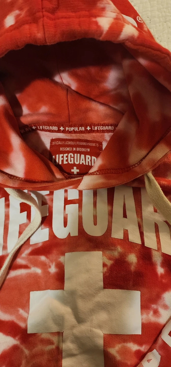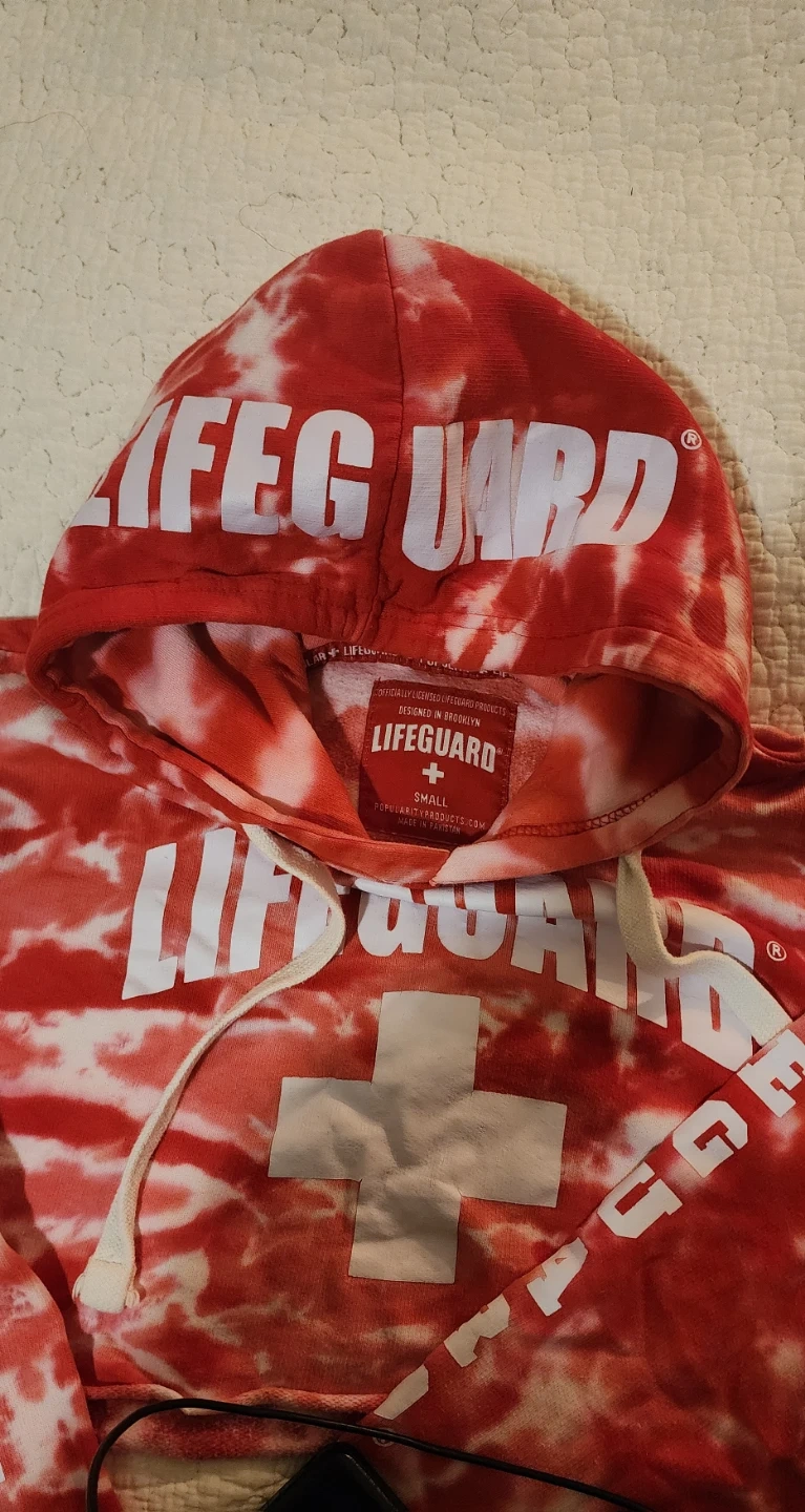 Selling a cute Lifeguard crop hoodie in a red tie-dye pattern! It's a size small and has the word 'Lifeguard' printed on the front, hood, and sleeves. Perfect for a casual, sporty look.