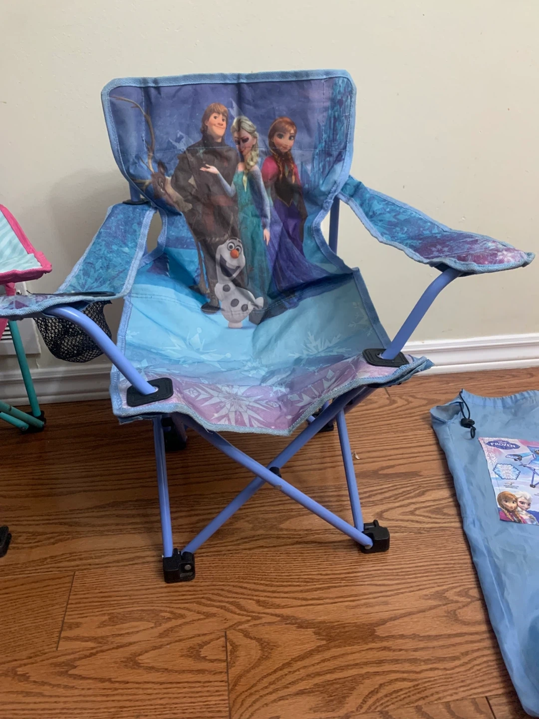 2 Kids Lawn Chairs: 2 foldable portable lawn chairs with a drink cup holder, has a carry case bag to hold it and carry it easily when folded. 1 is frozen theme and other is LOL surprise themed. Great for travelling, parks, picnics, pools, playground, events, bbq, outside, fireworks, etc.