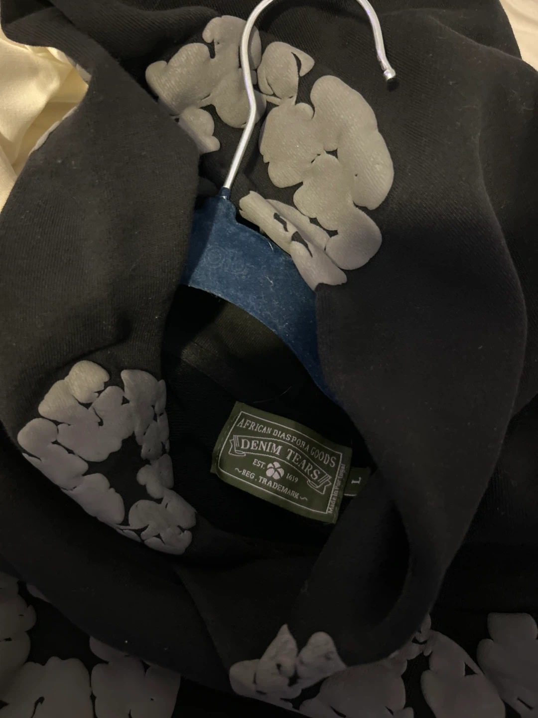 Selling a Denim Tears hoodie from the African Diaspora Goods collection! It's a size large and features a unique floral design. Great for adding a bit of style to your wardrobe! and real