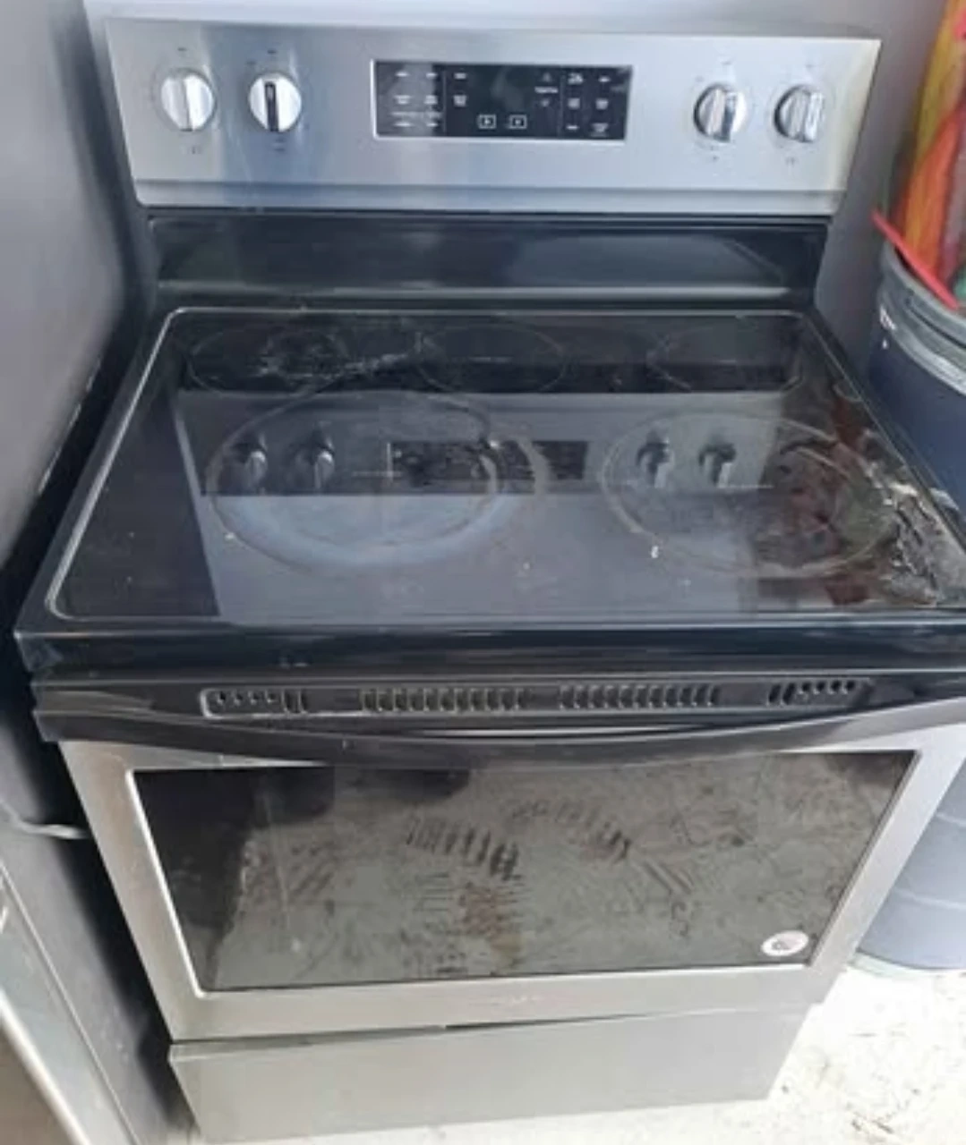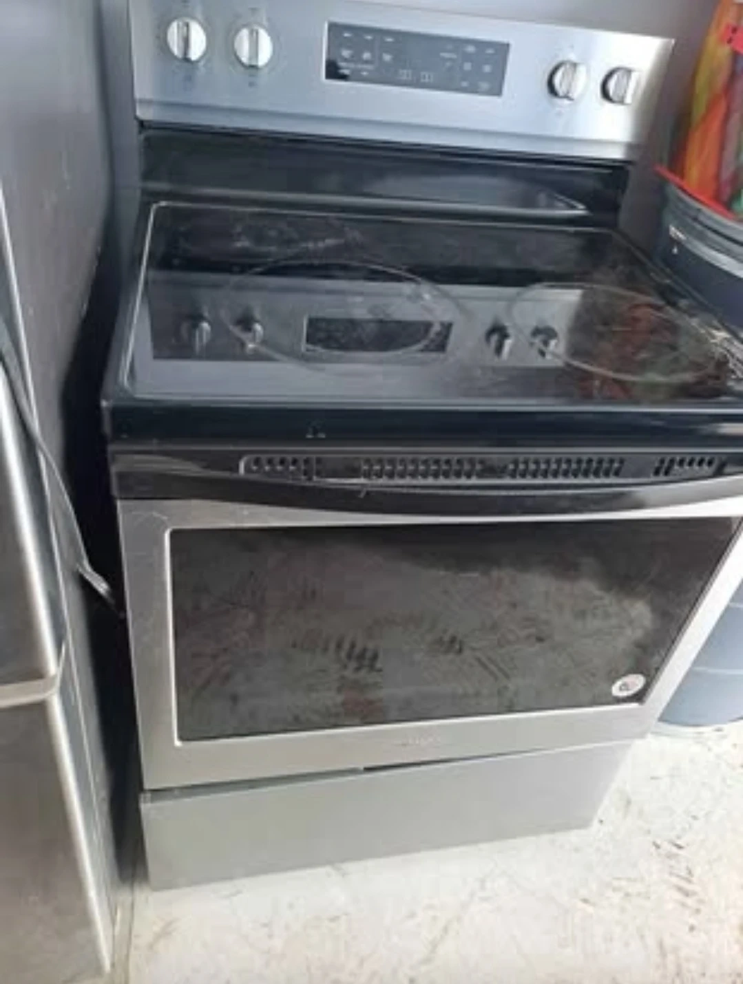 Silver Whirlpool electric range with glass cooktop and 4 electric burners. Has digital controls and a large oven. The exterior has minor scratches. Pick up spruce grove
