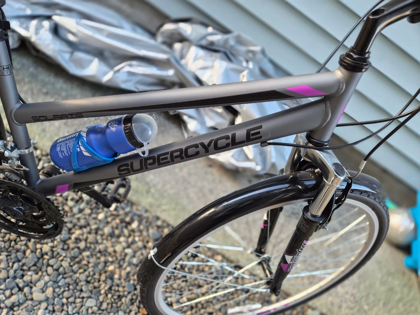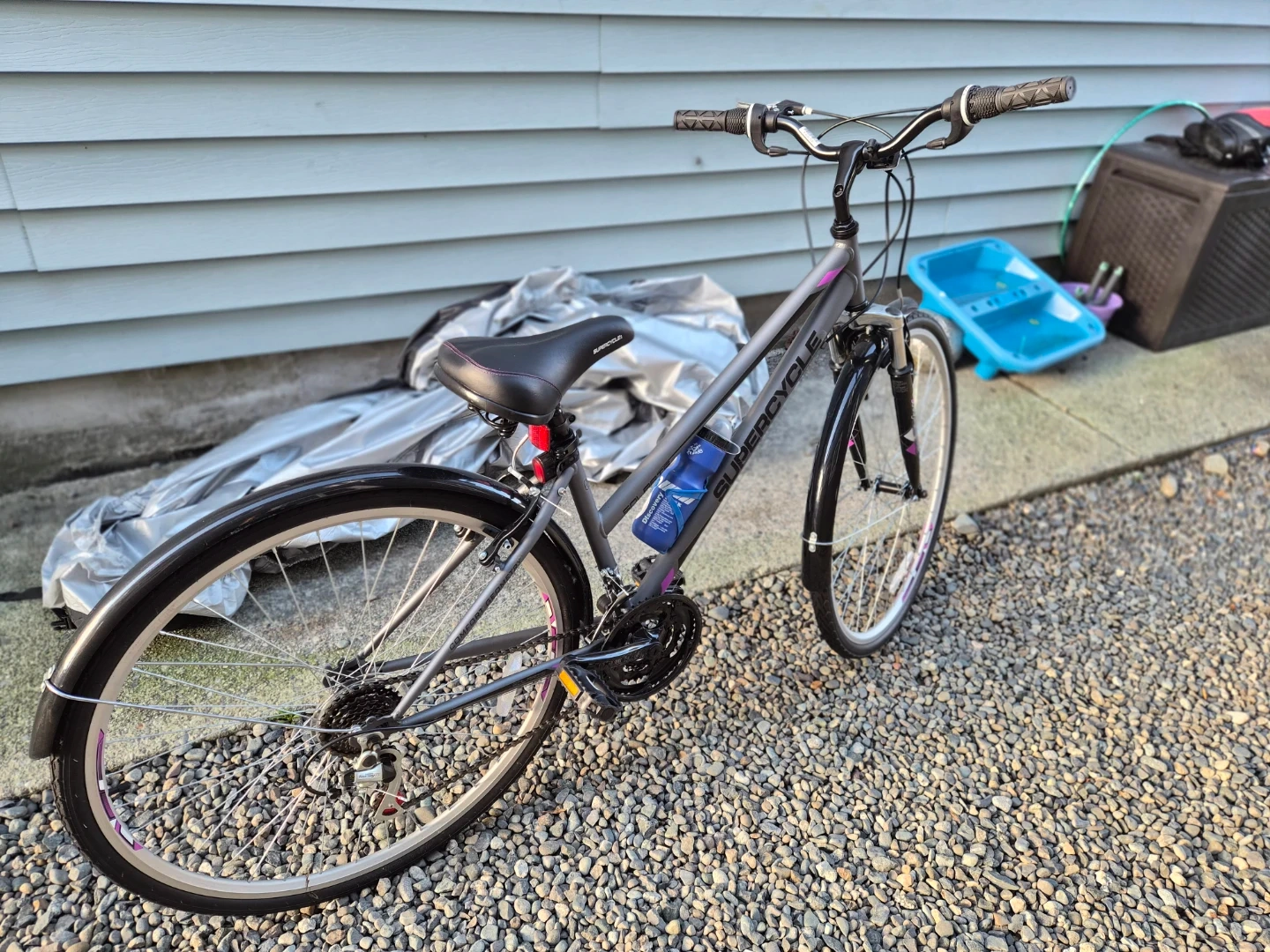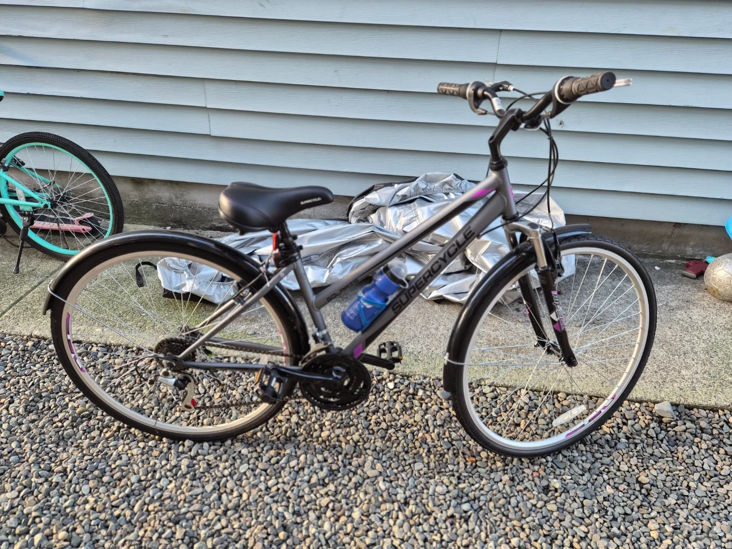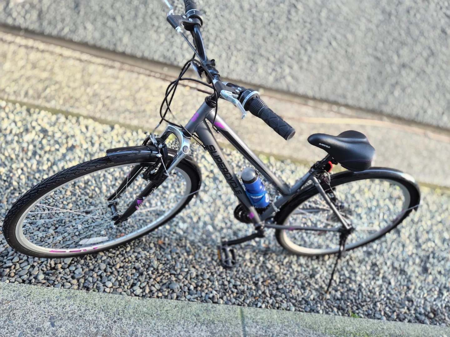 Supercycle Solaris hybrid bike in great shape! (never used - NEW!) It's perfect for city commutes or leisurely rides around town. Shimano equipped 18 Speed. The bike is grey with purple accents, giving it a stylish look. It also comes with a water bottle holder.