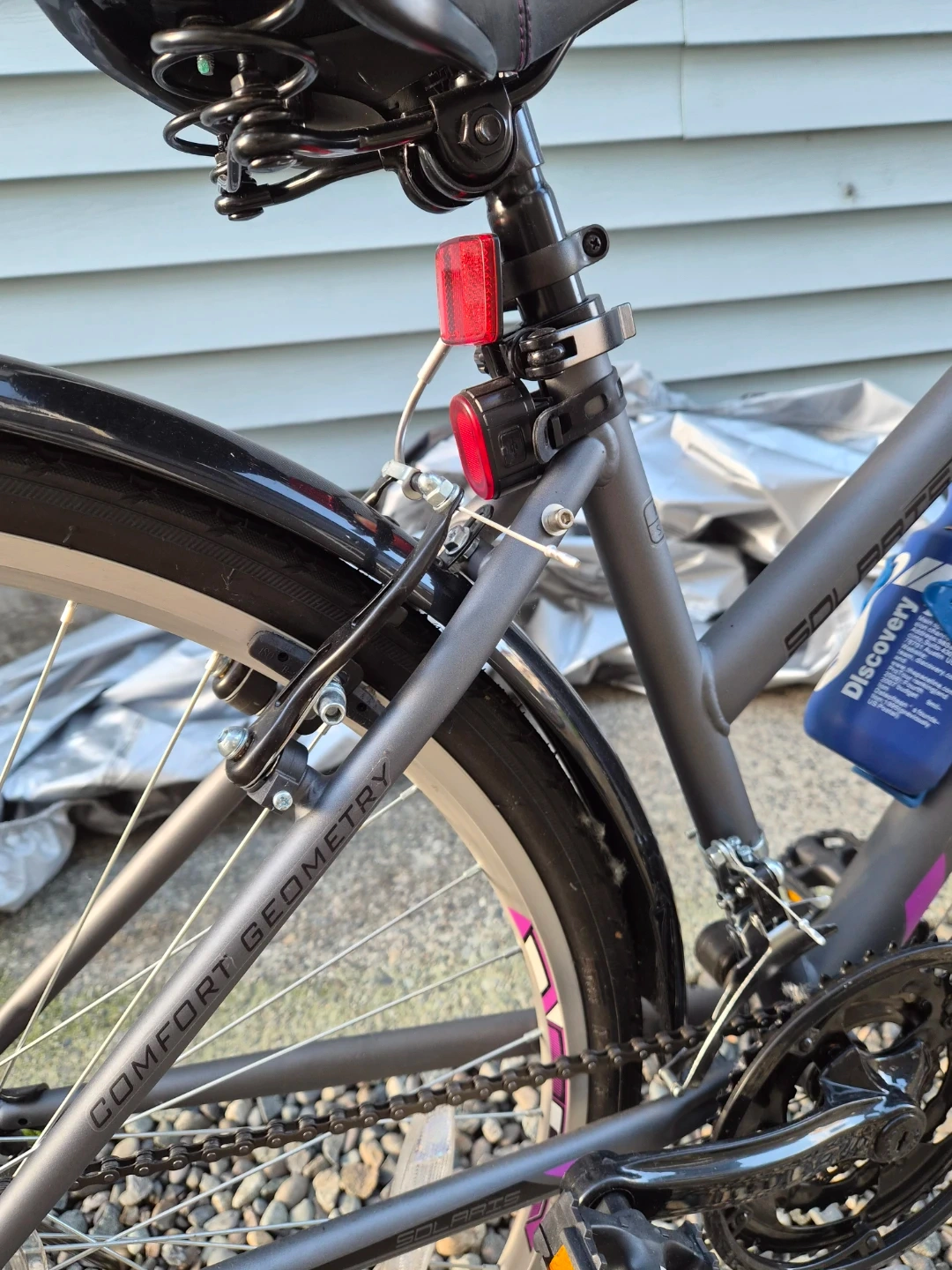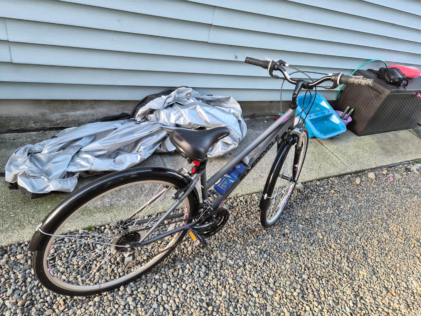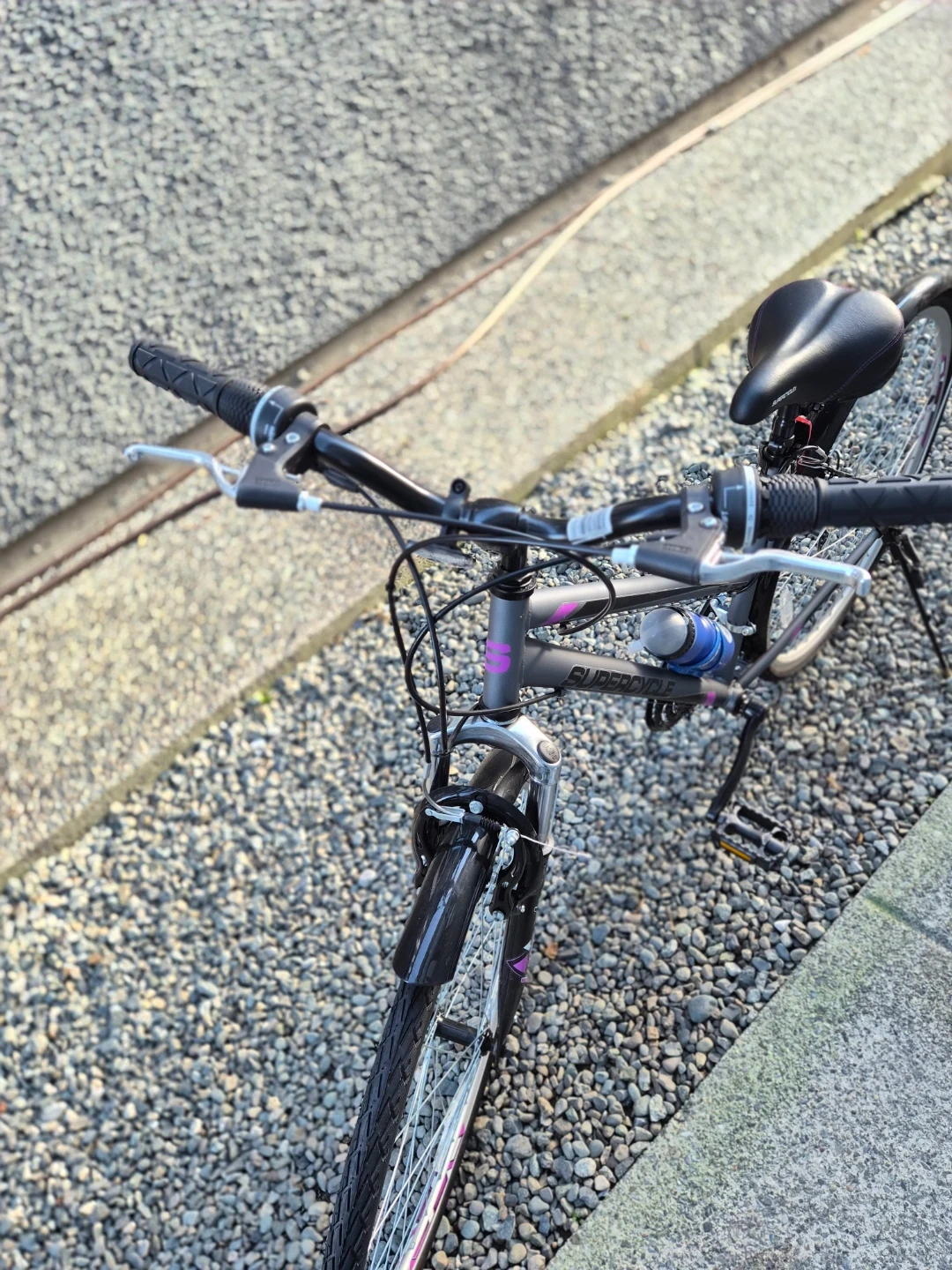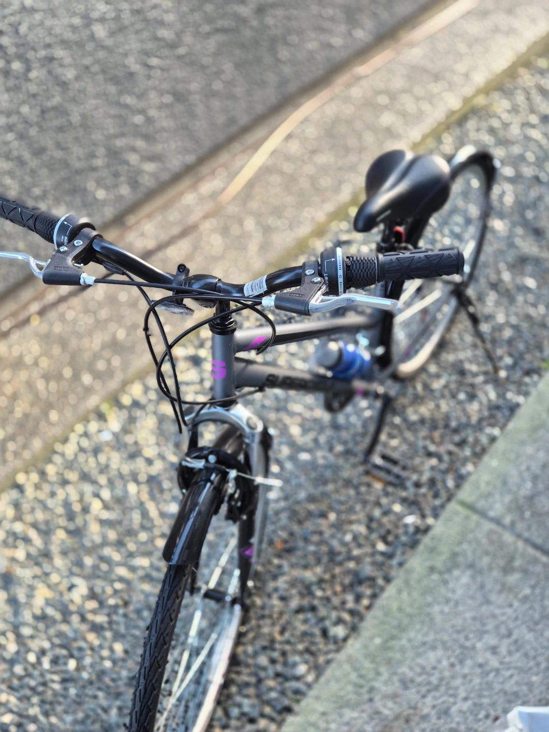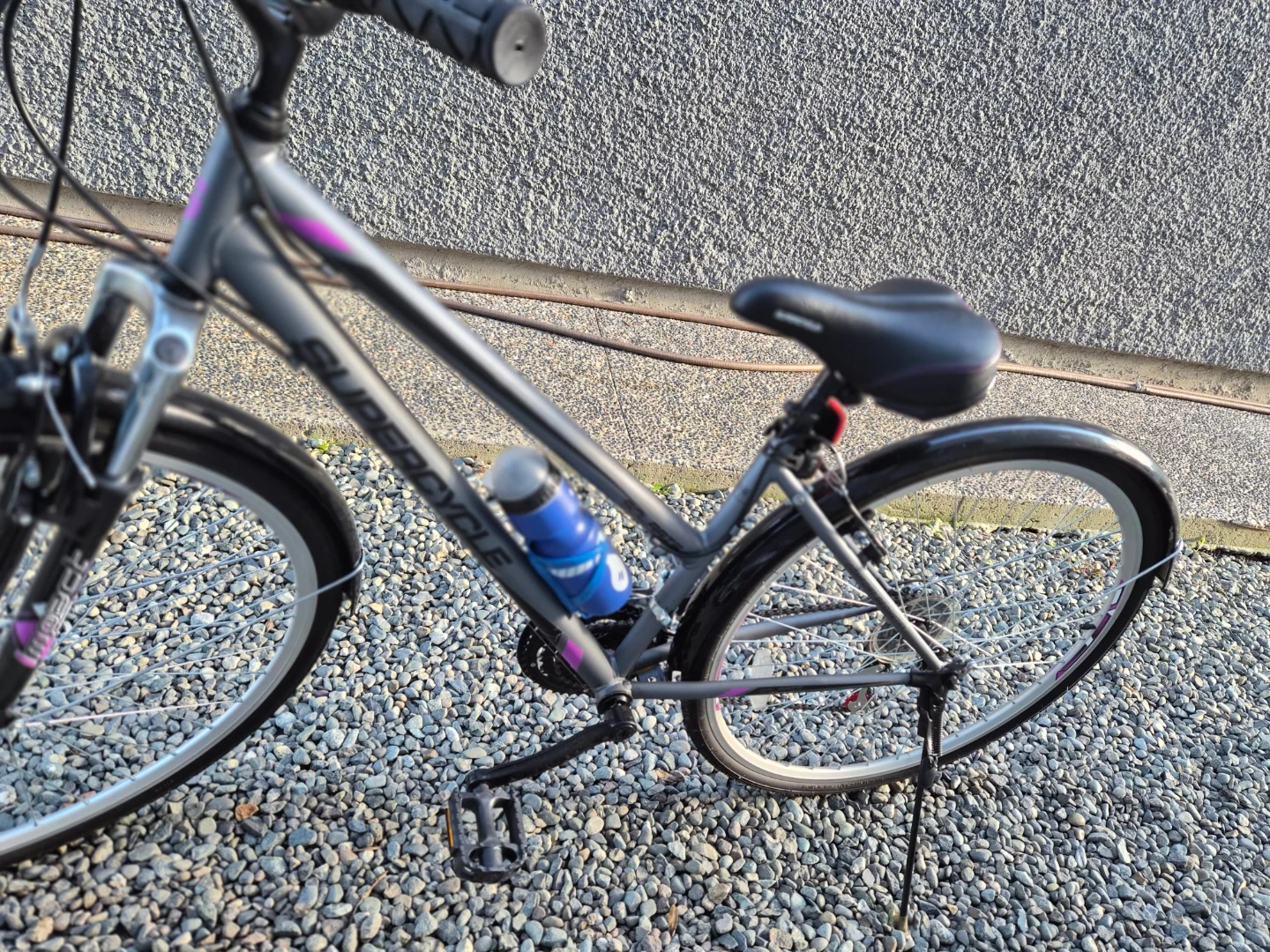 Supercycle Solaris hybrid bike in great shape! (never used - NEW!) It's perfect for city commutes or leisurely rides around town. Shimano equipped 18 Speed. The bike is grey with purple accents, giving it a stylish look. It also comes with a water bottle holder.