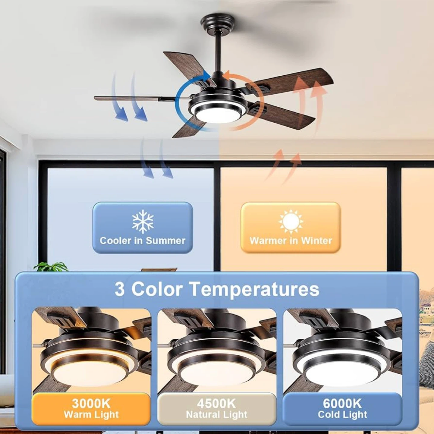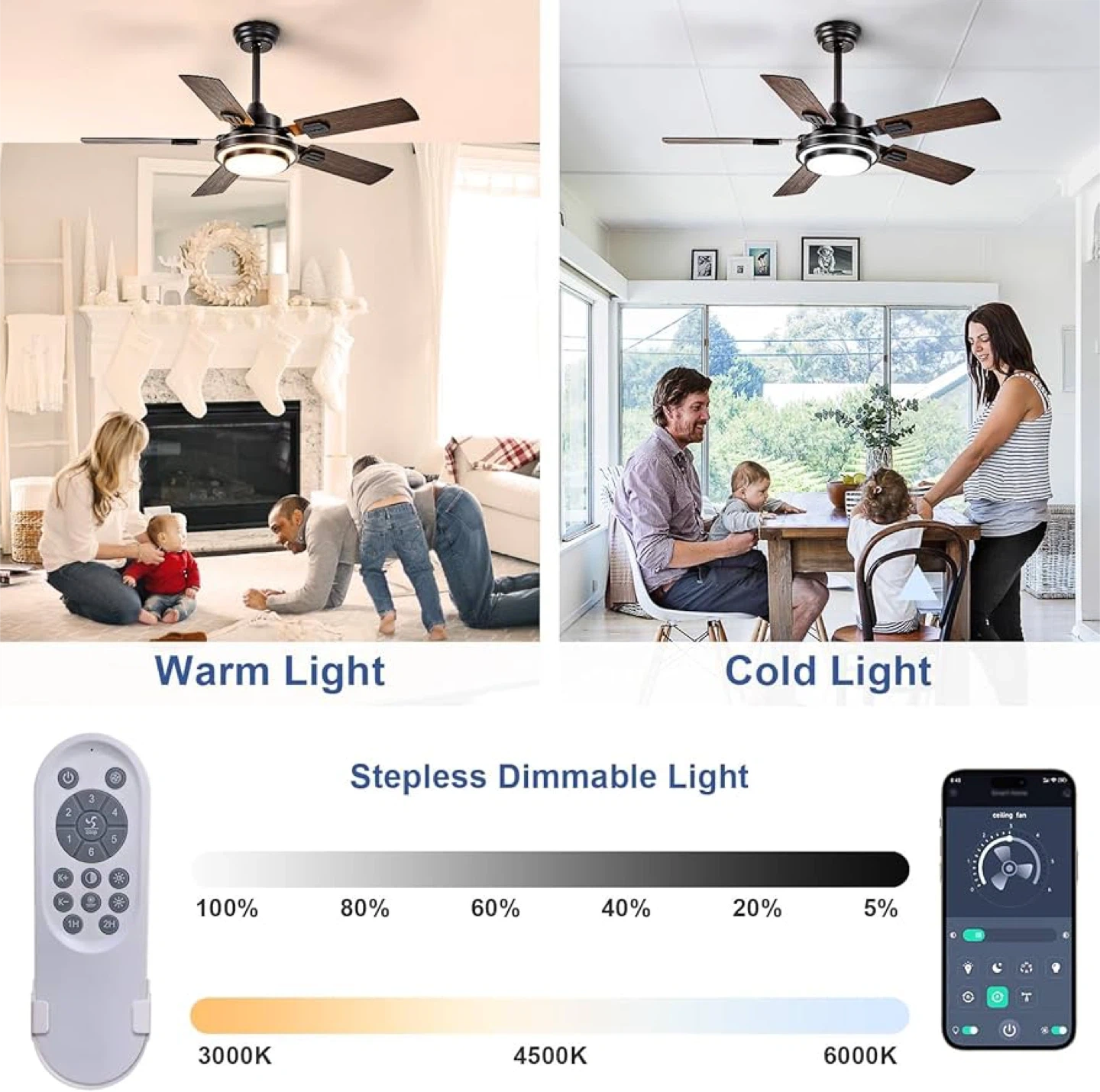 This ceiling fan features three colour temperatures: warm light (3000K), natural light (4500K), and cold light (6000K). It also comes with a remote control for stepless dimming. The fan blades are finished in a black walnut colour. Perfect for living rooms, bedrooms, dining rooms, or outdoor patios!