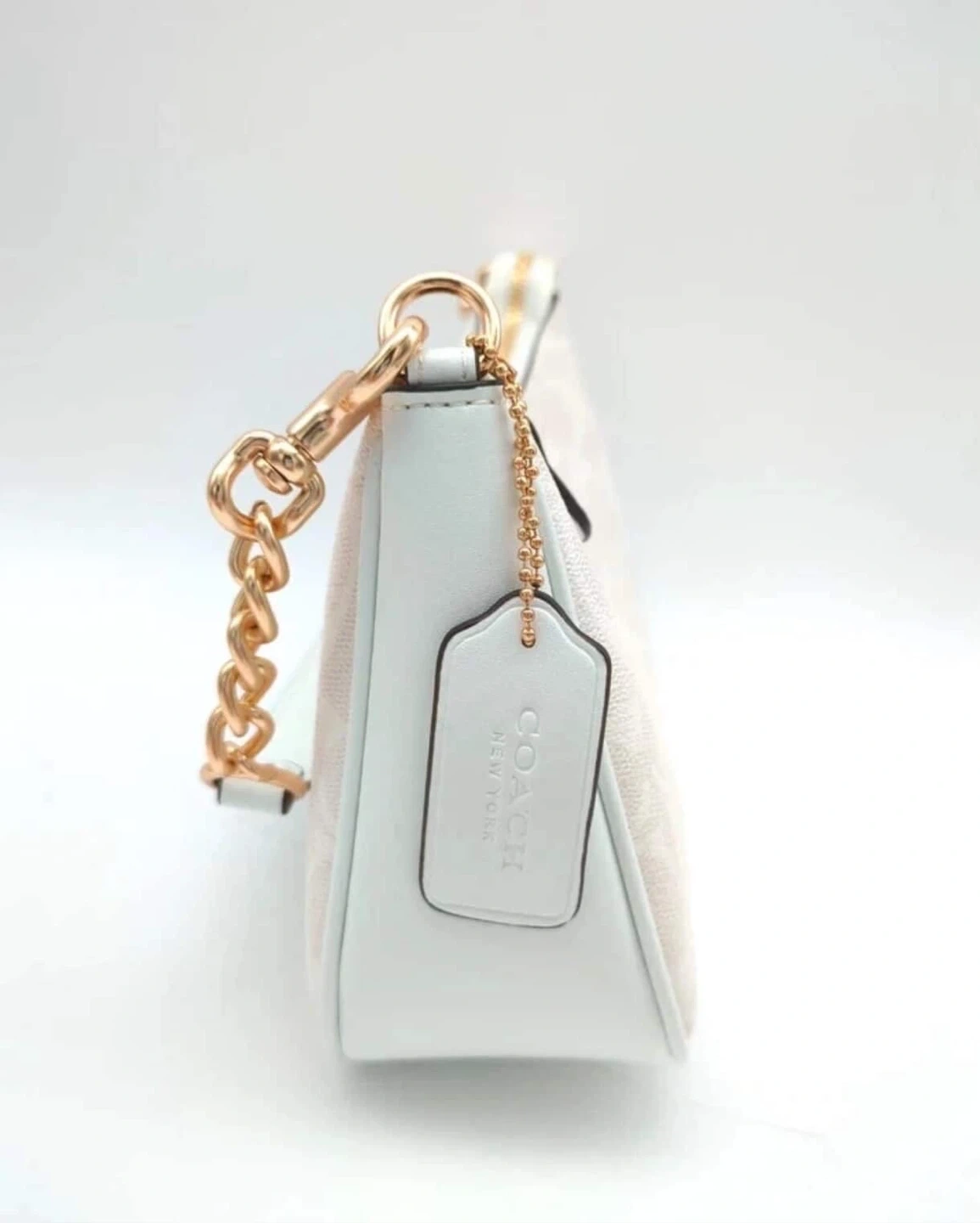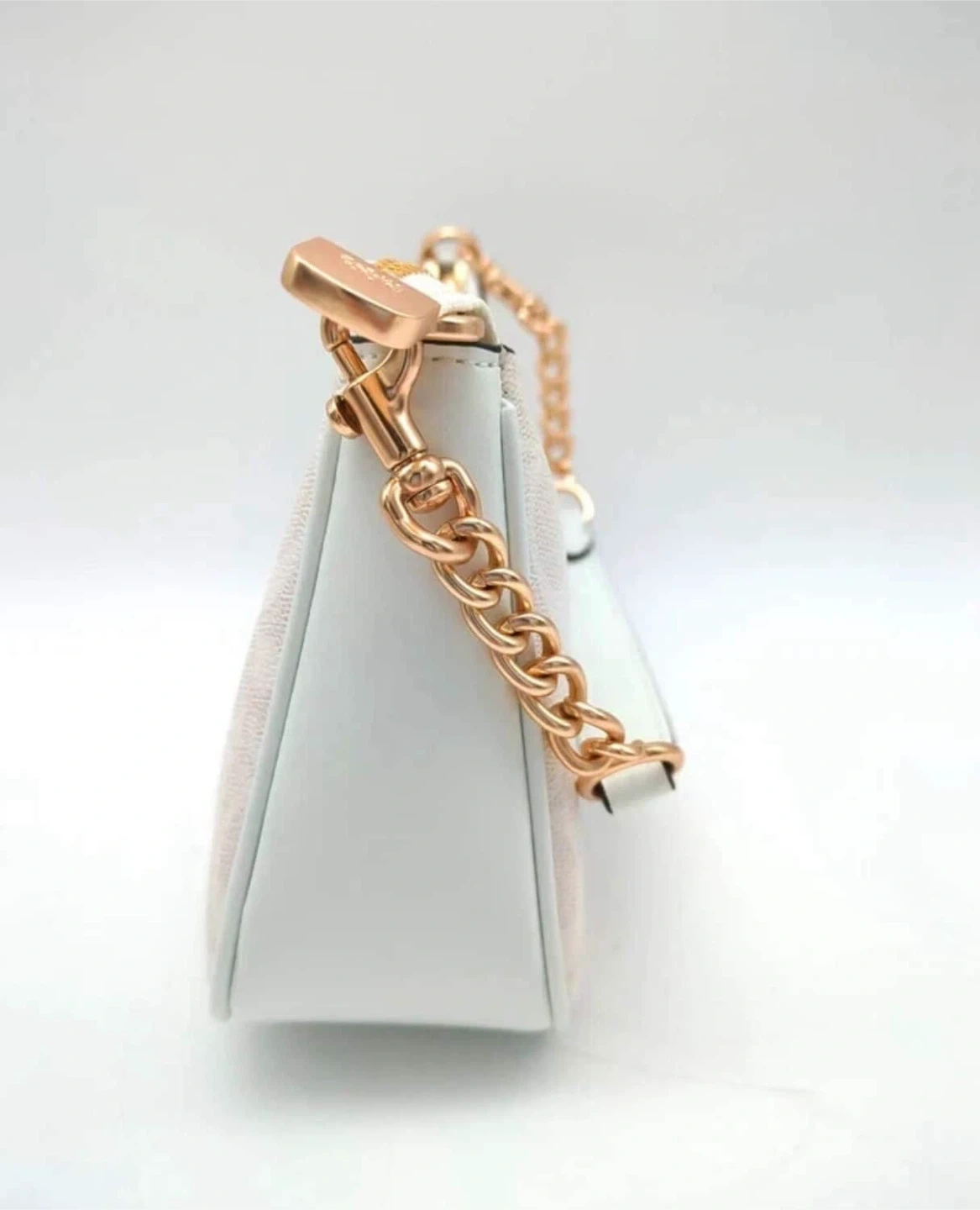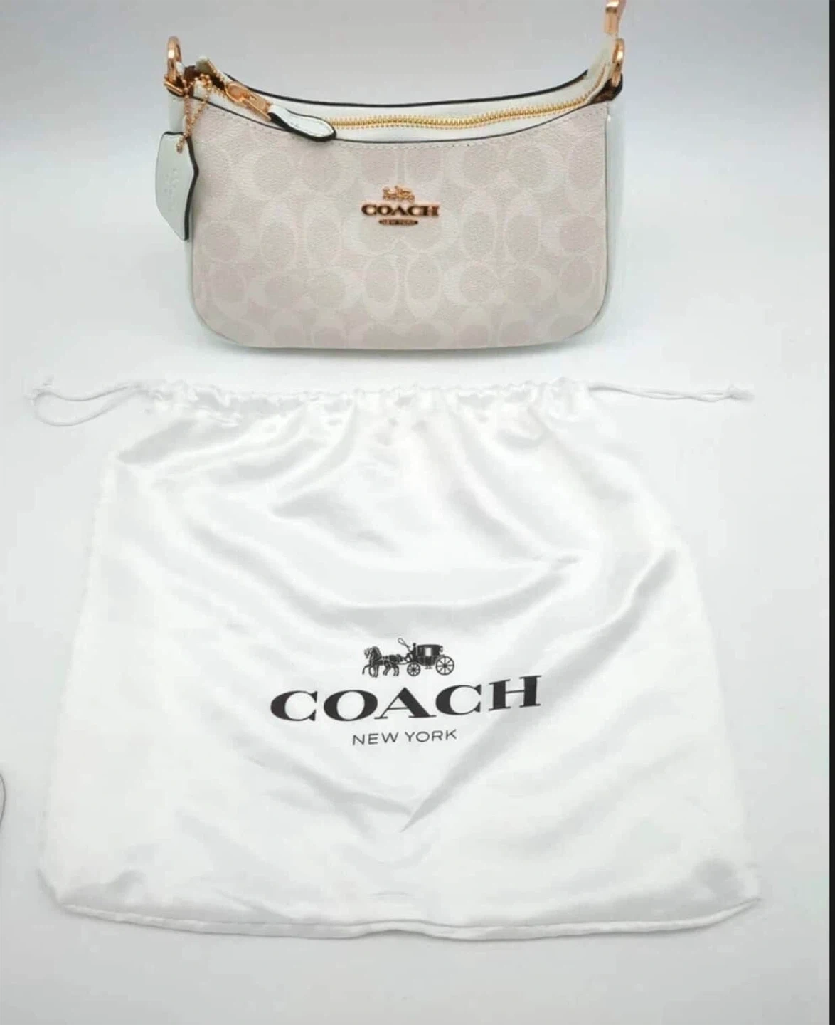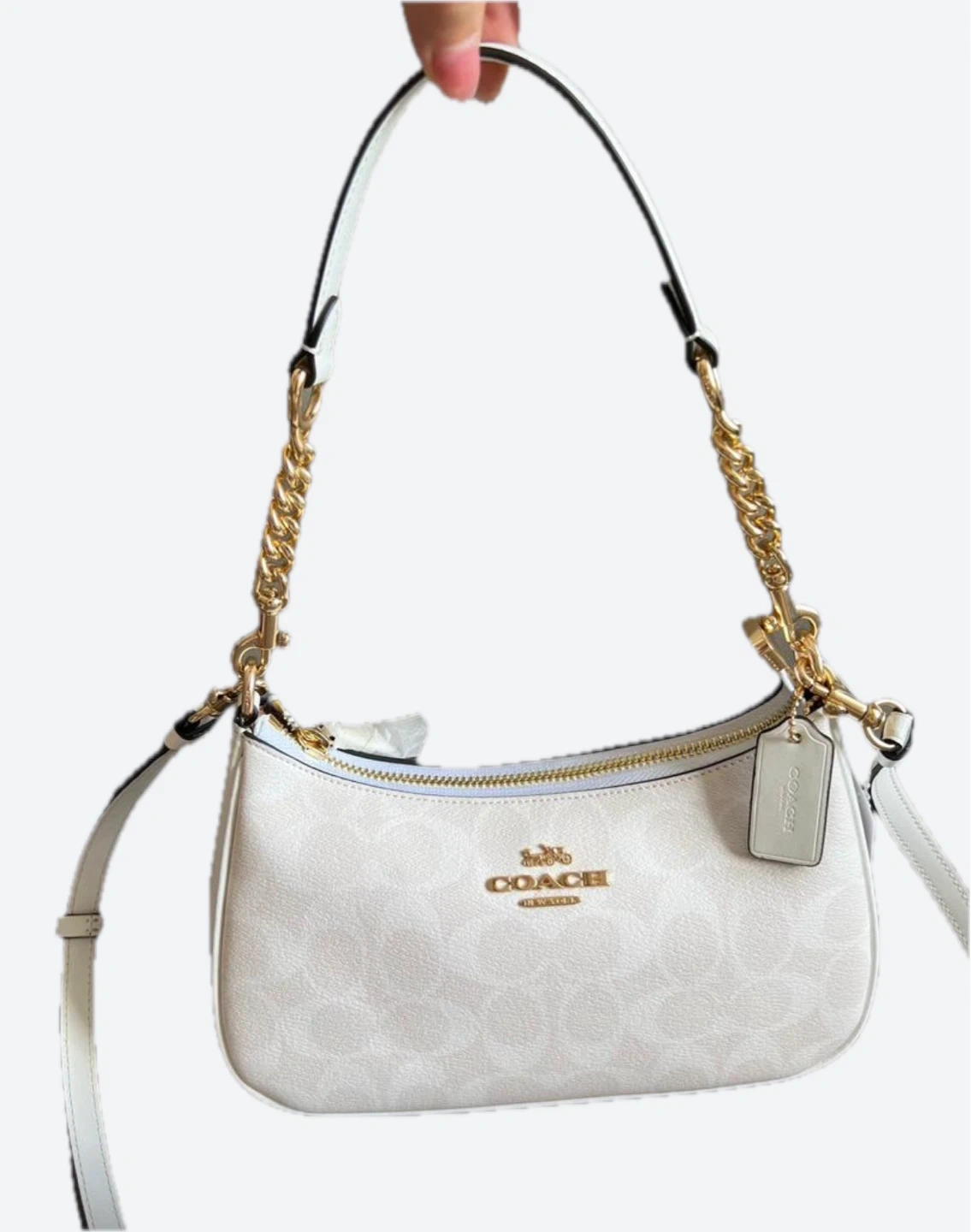 This is a Coach white shoulder bag. It comes with original purchased box a dust bag and two straps, one with a gold chain. Perfect for everyday use!