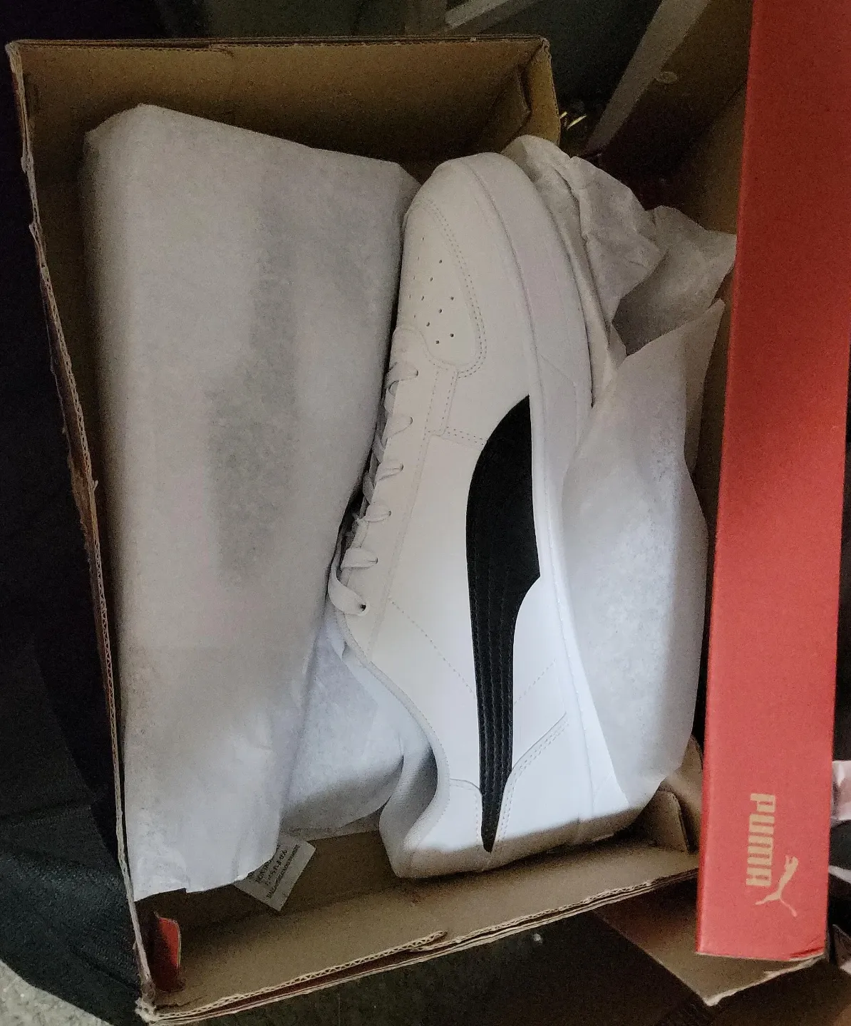 Selling a pair of Puma Court Classic sneakers in white with a black stripe! These are brand new and come with the original box. Purchased wrong size at Christmas
